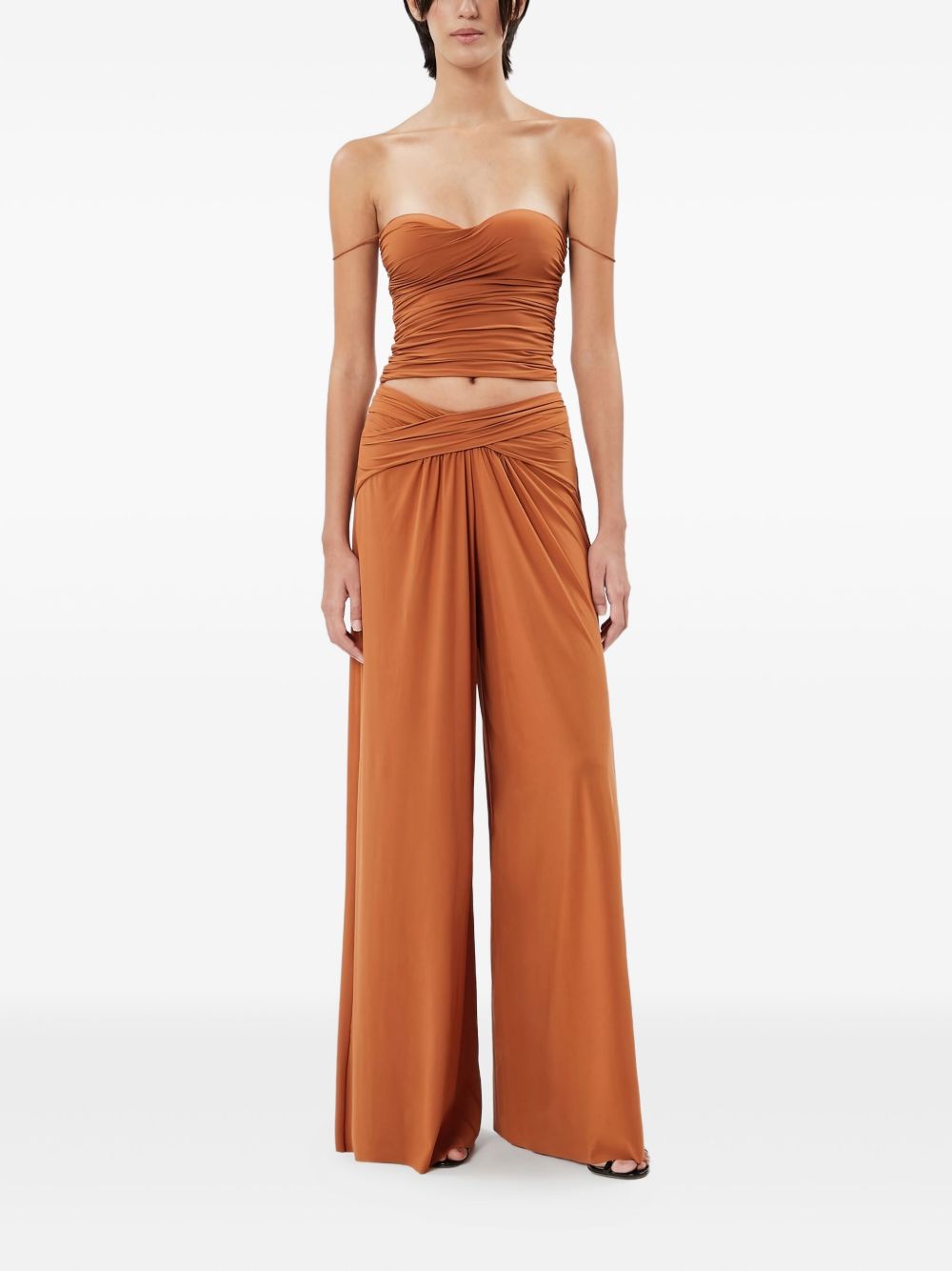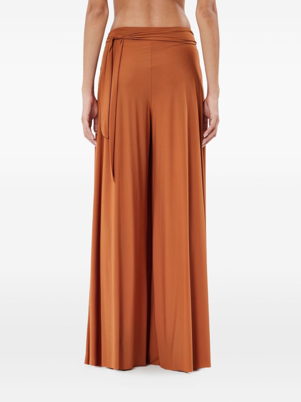 Caramel-colored stretch jersey palazzo pants with crossover waistband
