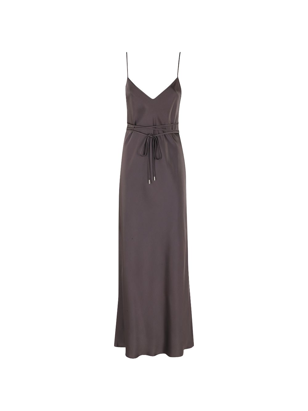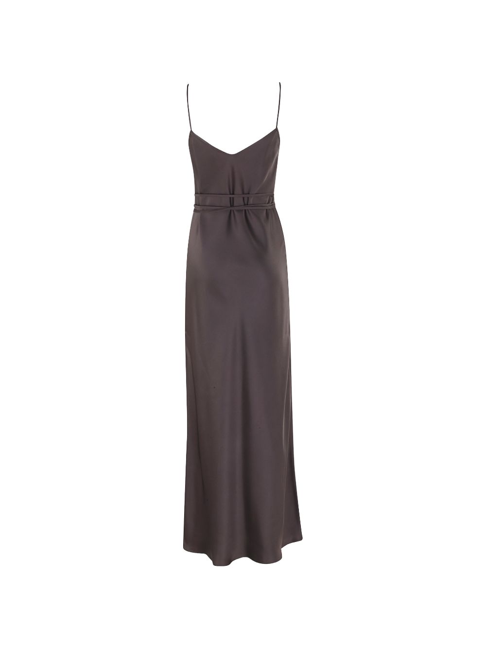 Dark purple acetate cadi dress, with thin straps, a V-neck and a drawstring waist