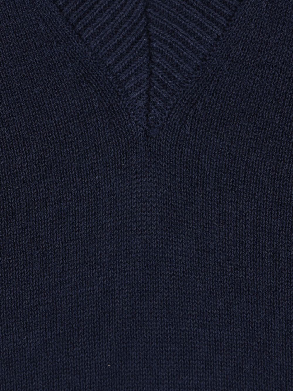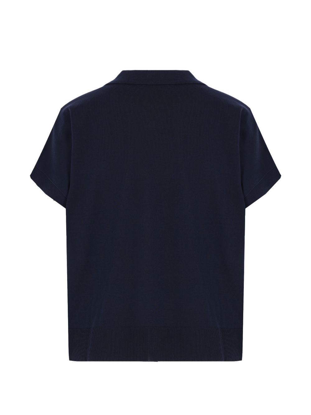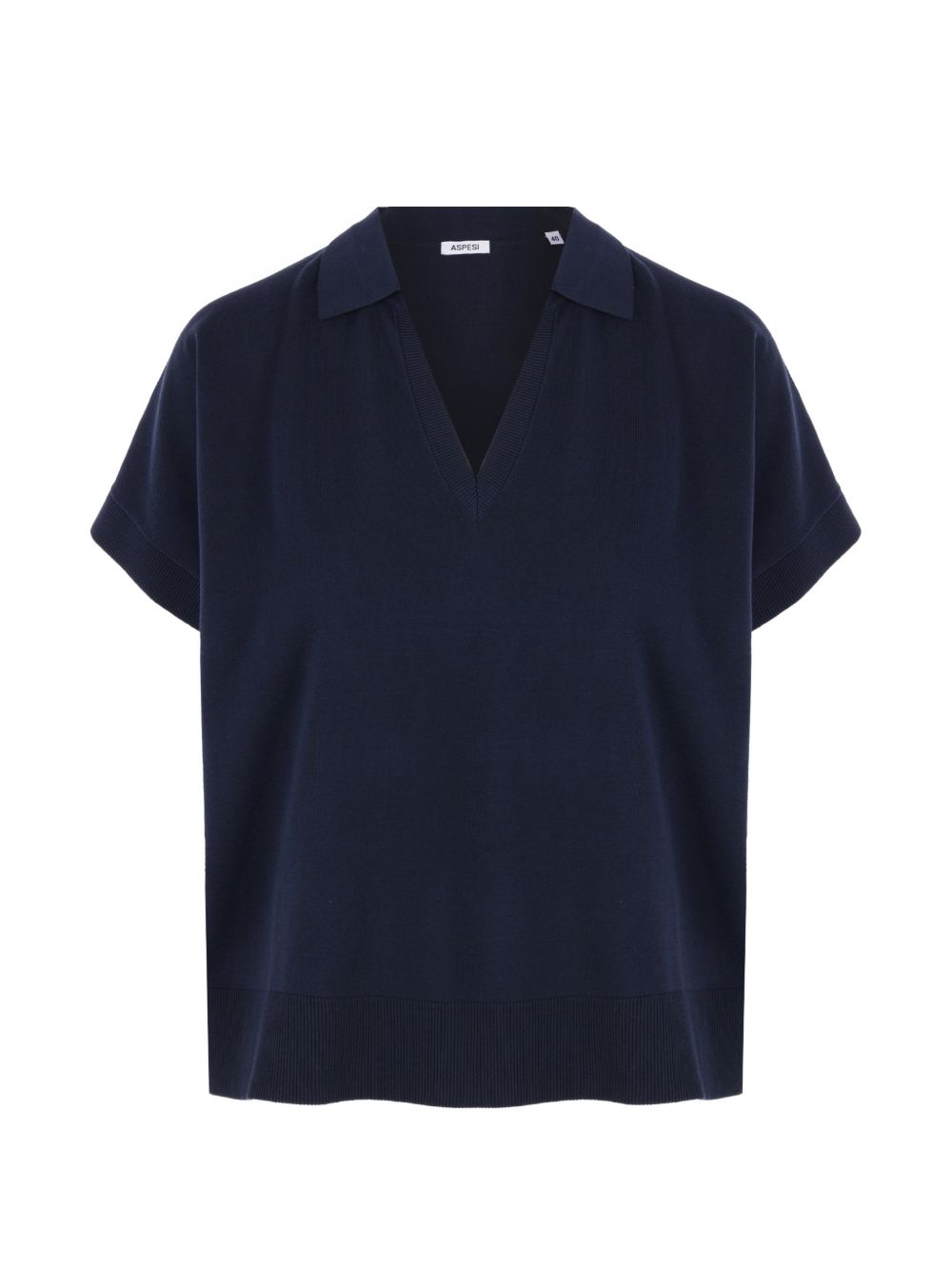Blue cotton yarn polo shirt, buttonless closure, V-neck