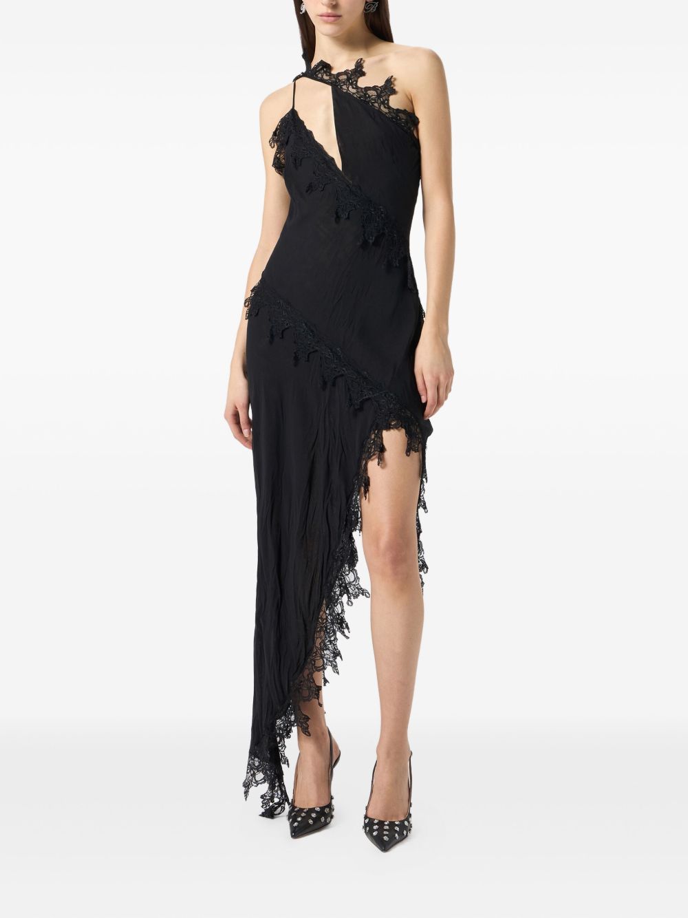 Black asymmetrical viscose chiffon dress, lace details, one-shoulder, side slit