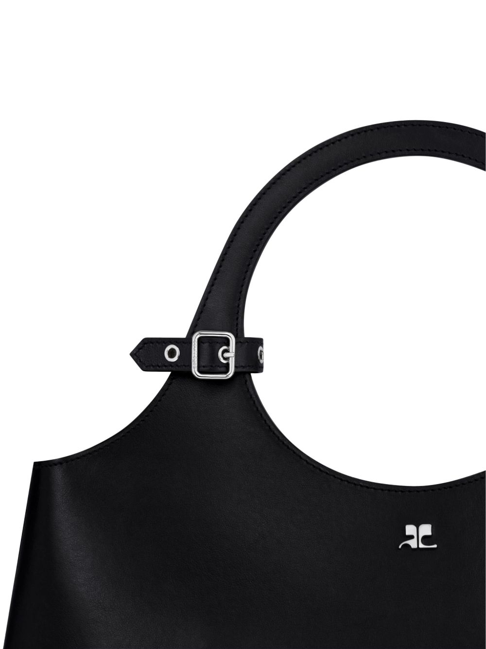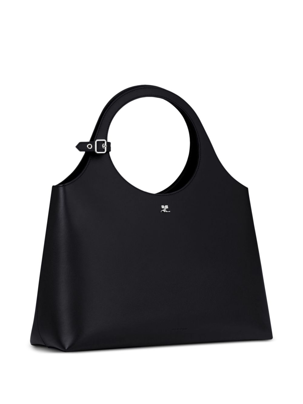 Large Holy Day bag in smooth calfskin leather. Zipper closure and metallic AC logo. Embossed ?Courr?ges? logo on front. Buckle detail on the handles. One zipper pocket and one interior patch pocket. Adjustable and removable shoulder strap.