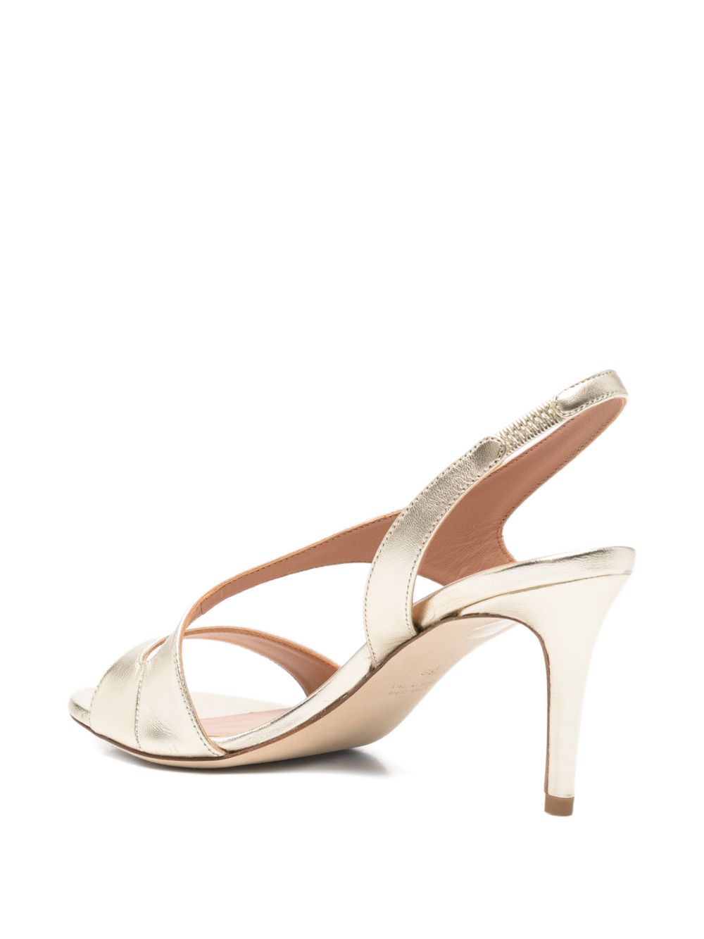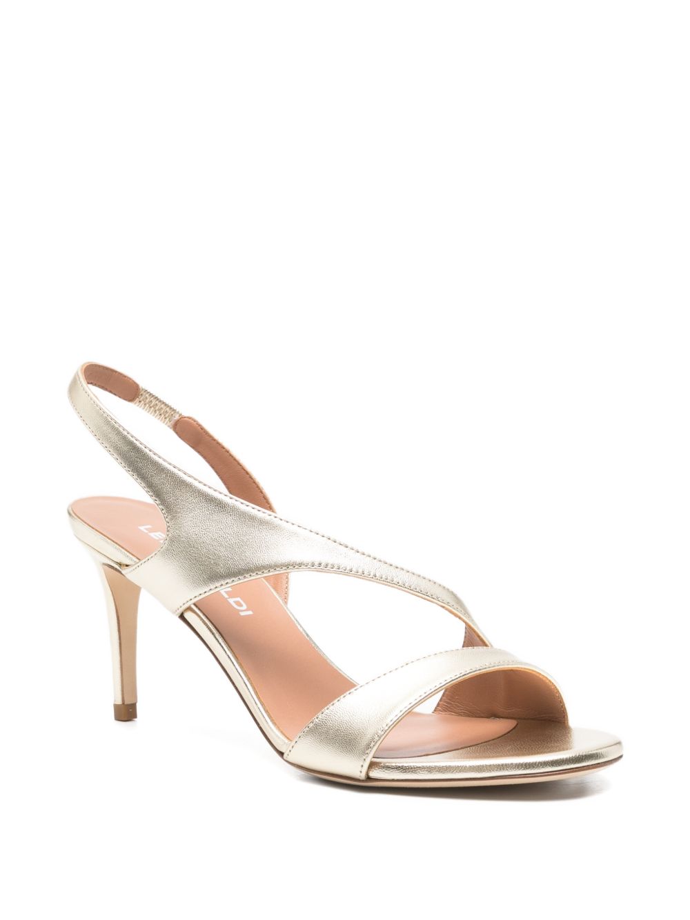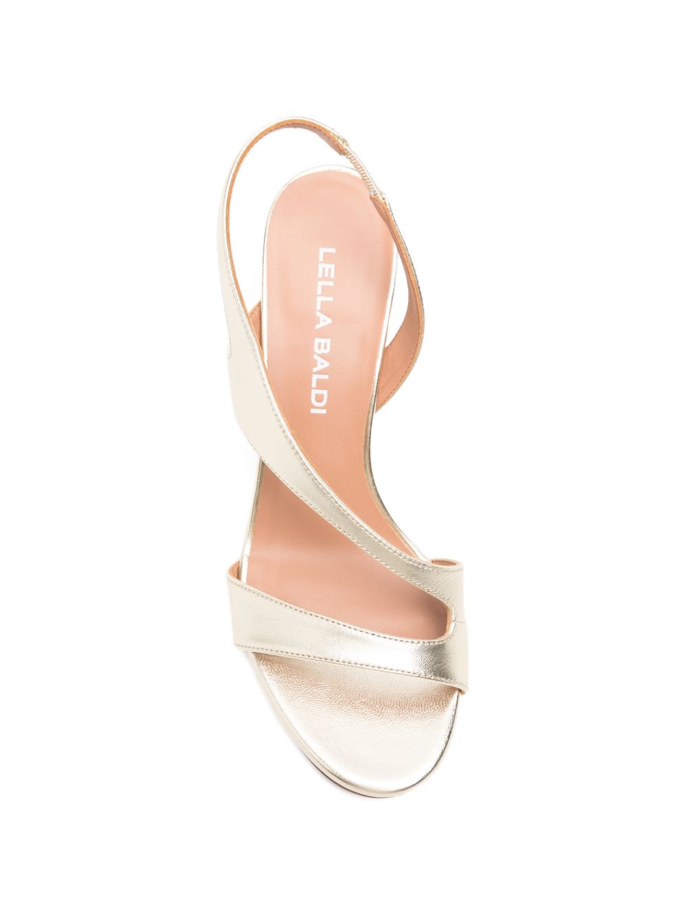 Gold-laminated leather sandal, asymmetrical straps, 70mm heel, leather lining