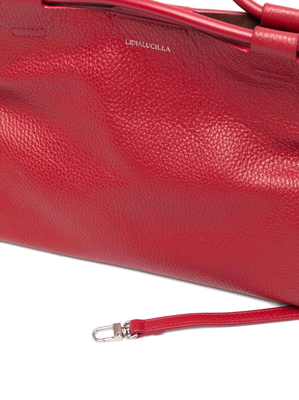 Ruby red color, textured finish, knotted top handles, logo printed on the front, silver-tone metal hardware.