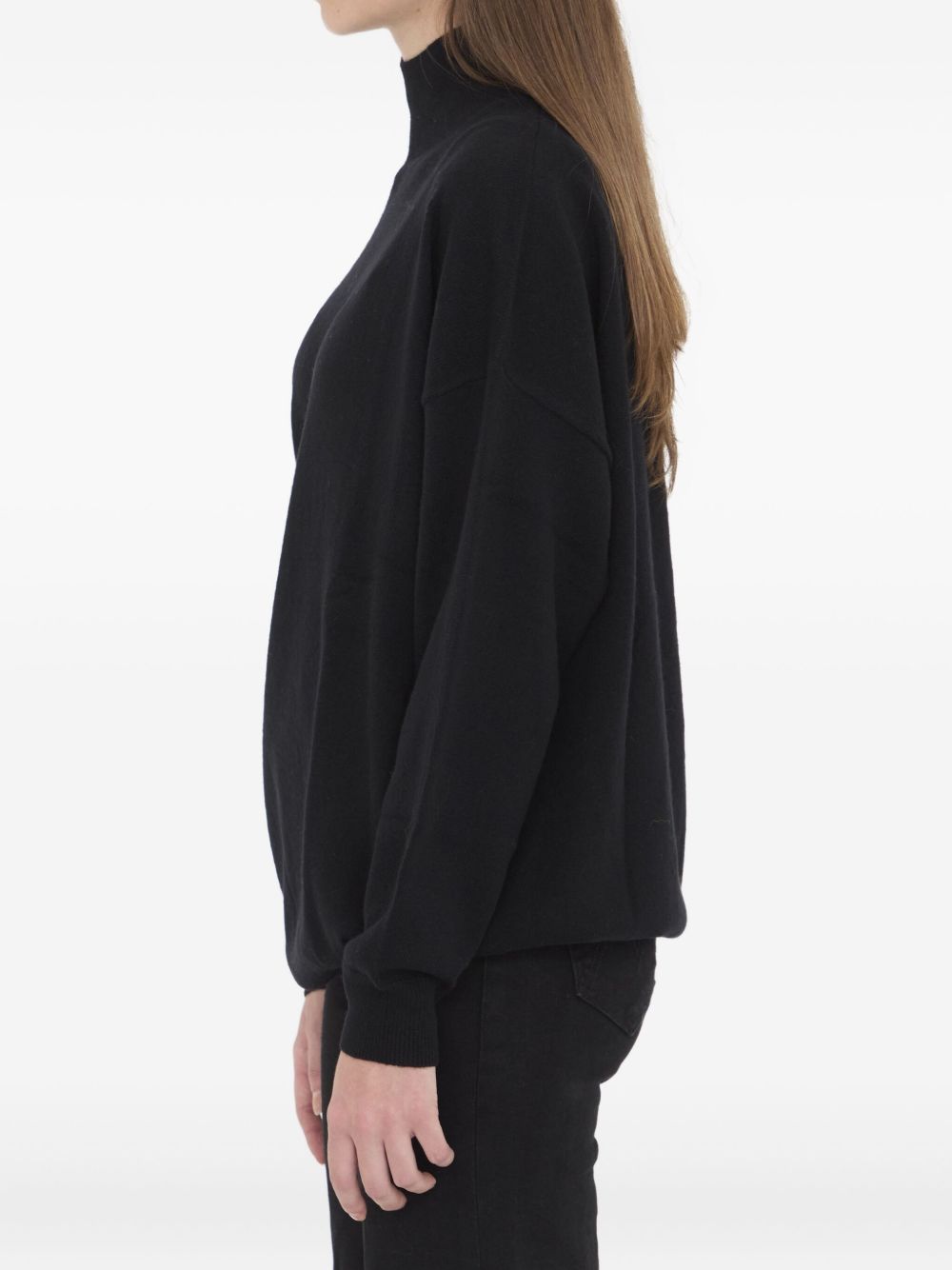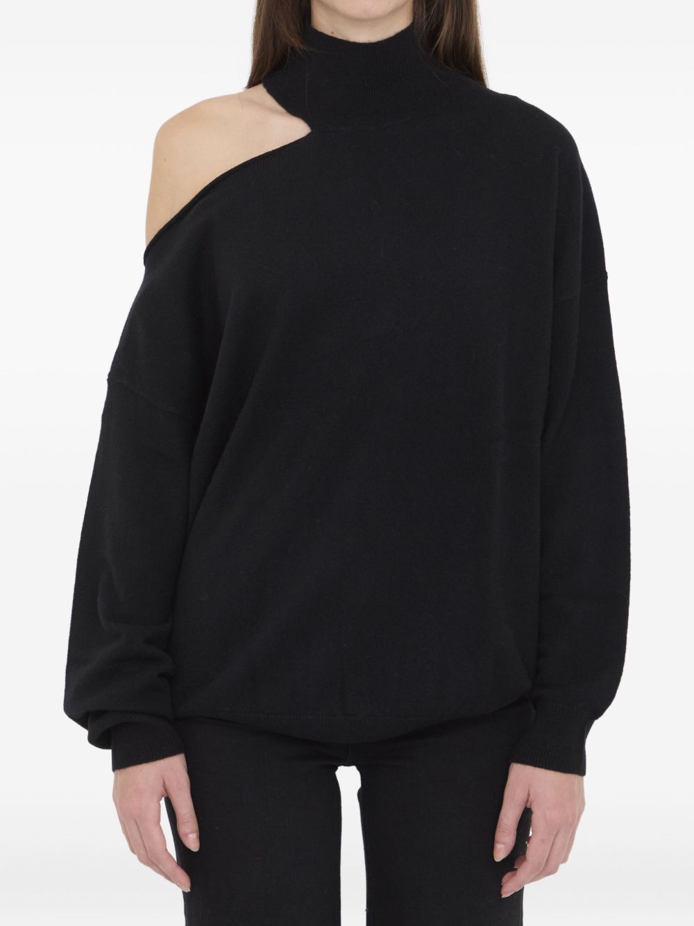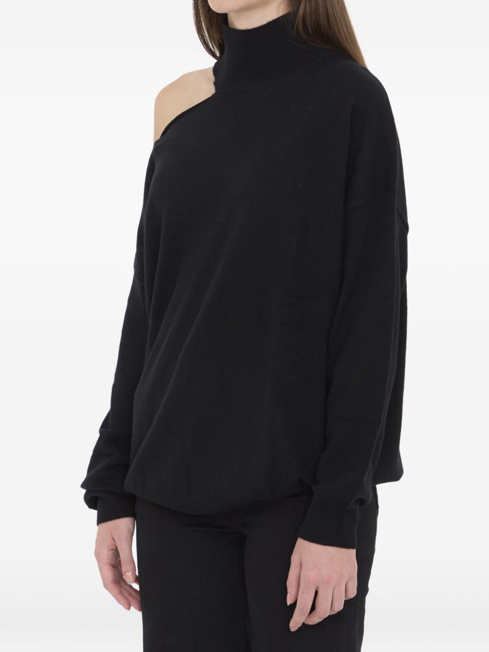 Black cashmere wool sweater, asymmetrical cut, high neck, side shoulder neckline