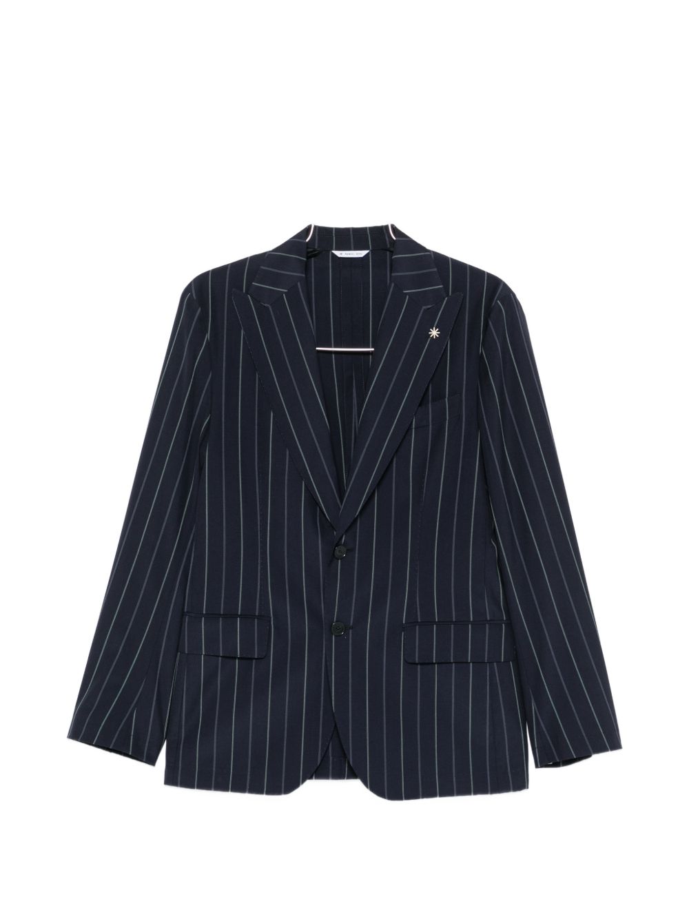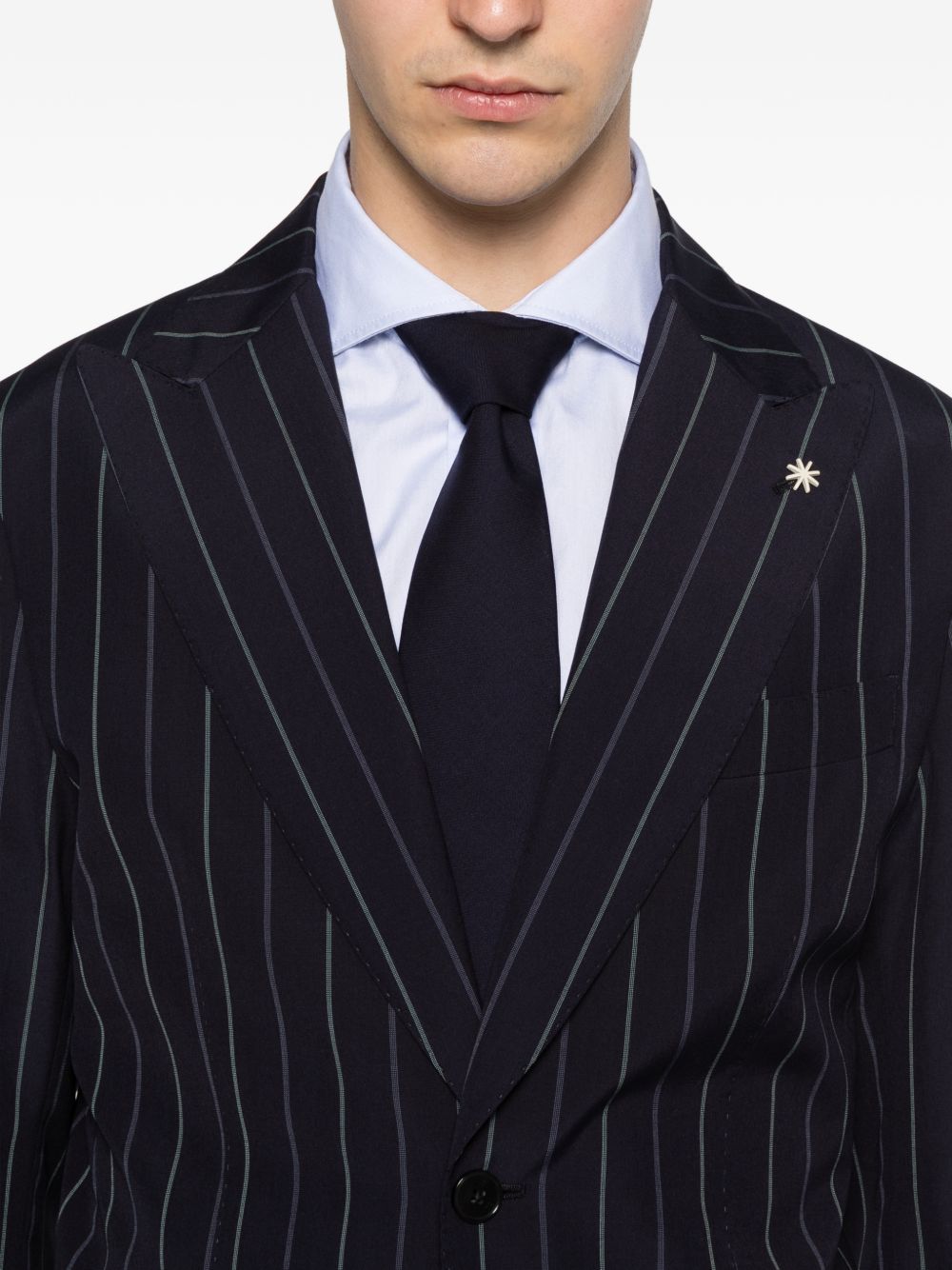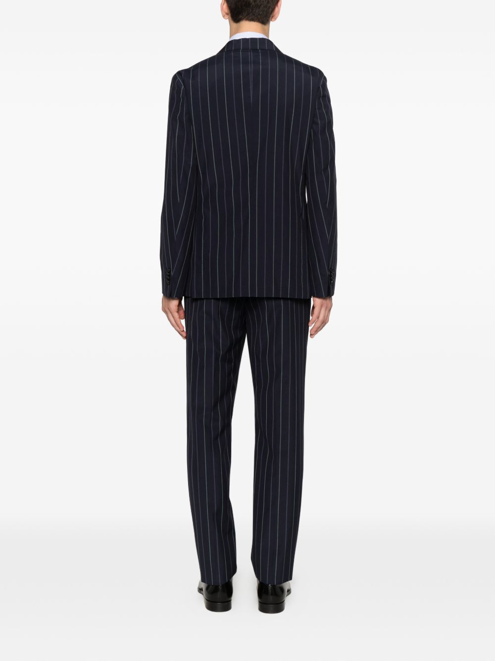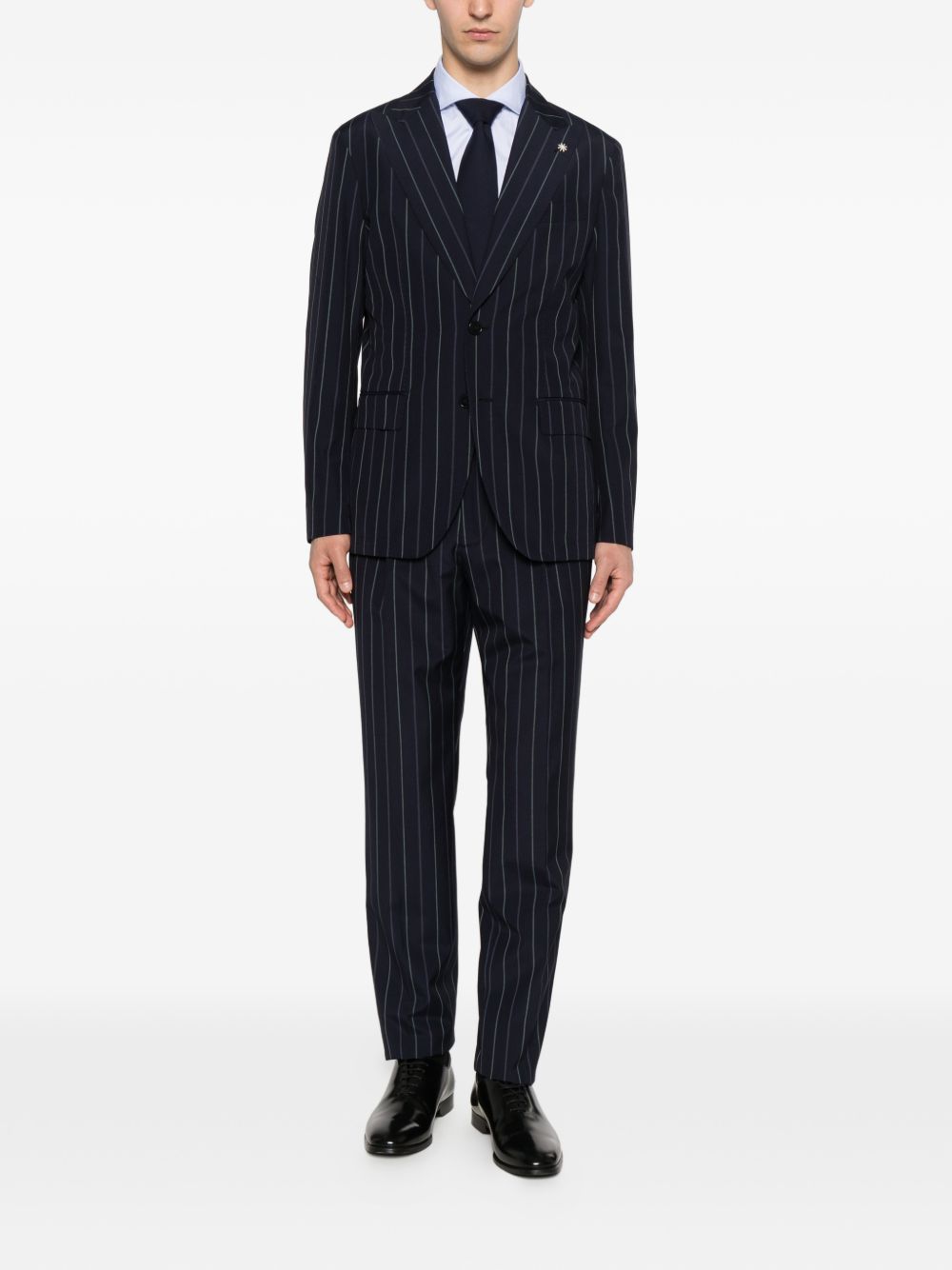 Dark blue pinstripe suit, cotton, two-button fastening, peaked lapels, slit pockets