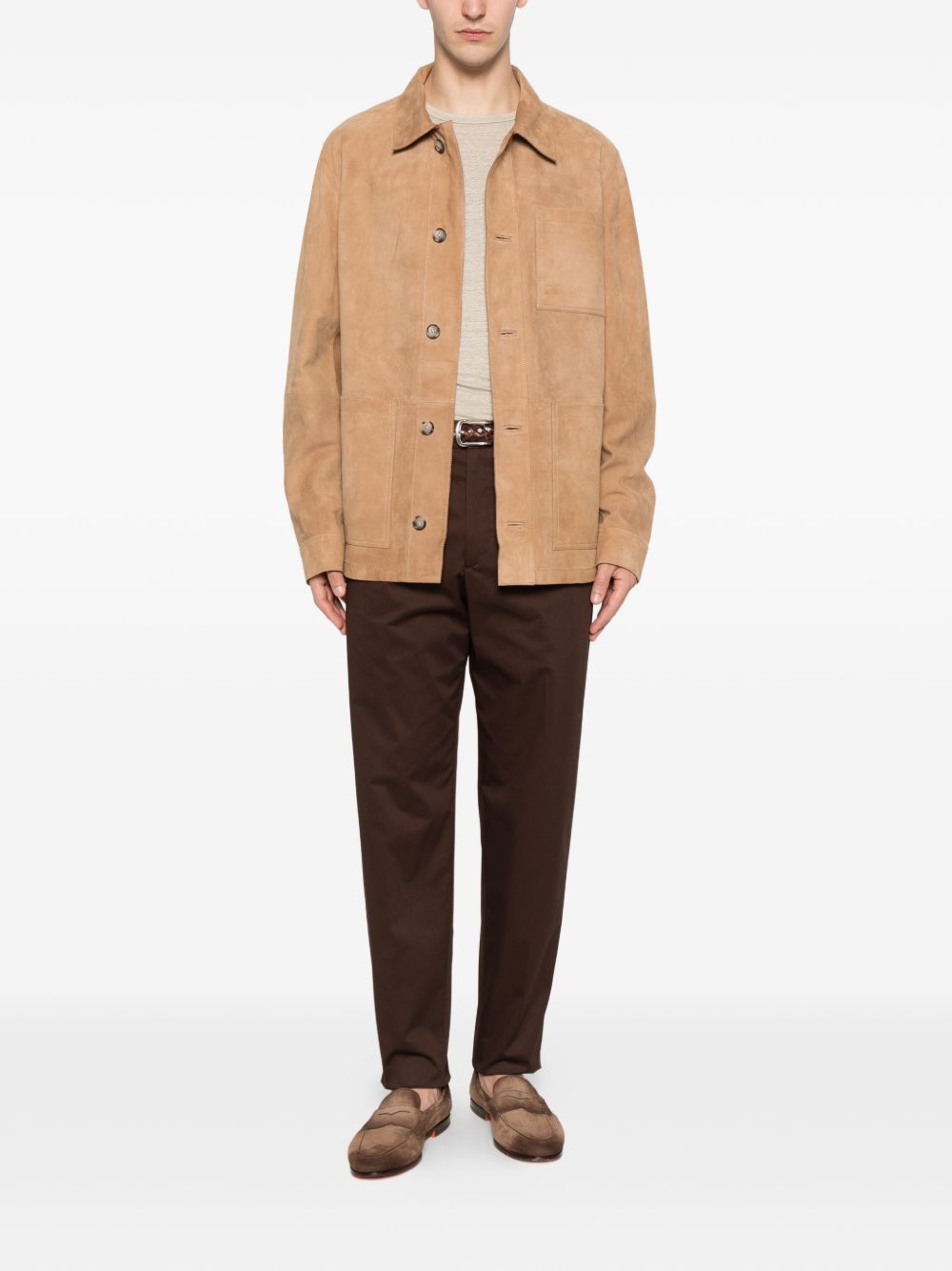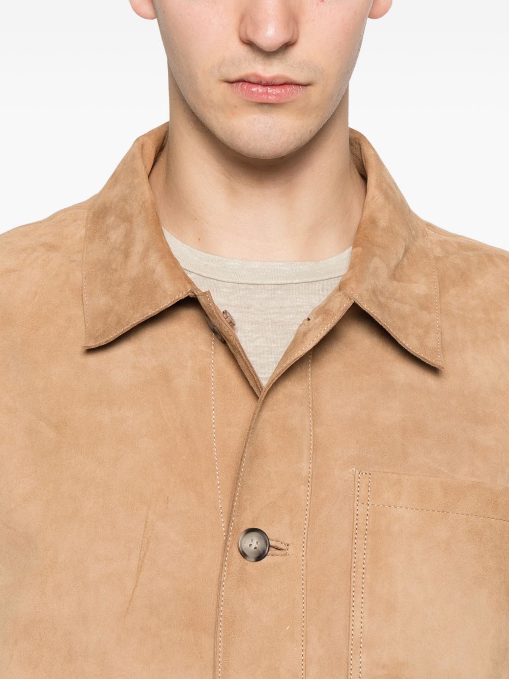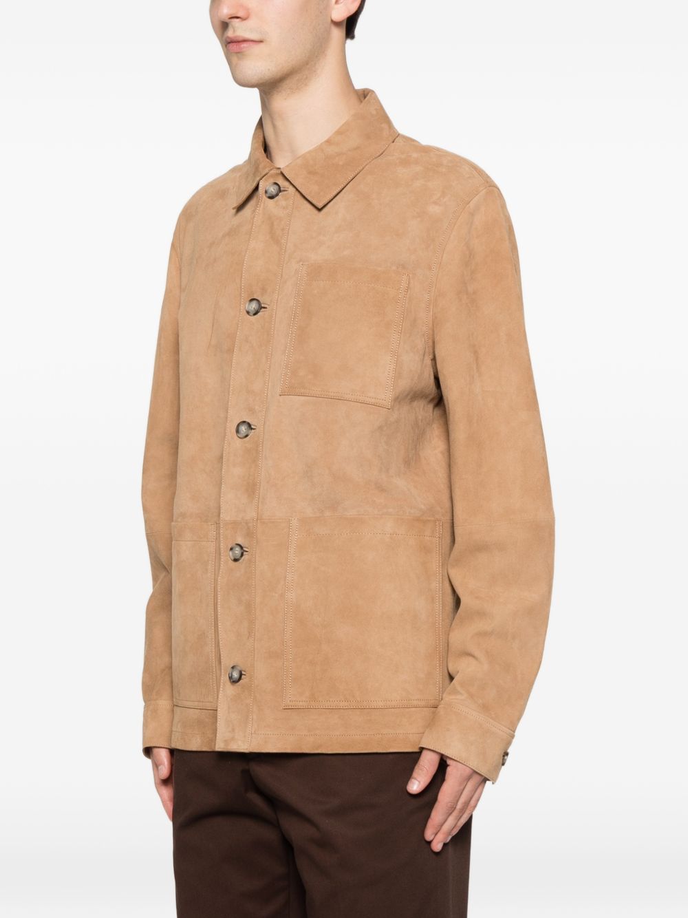 Camel suede jacket, button fastening, classic collar, patch pockets
