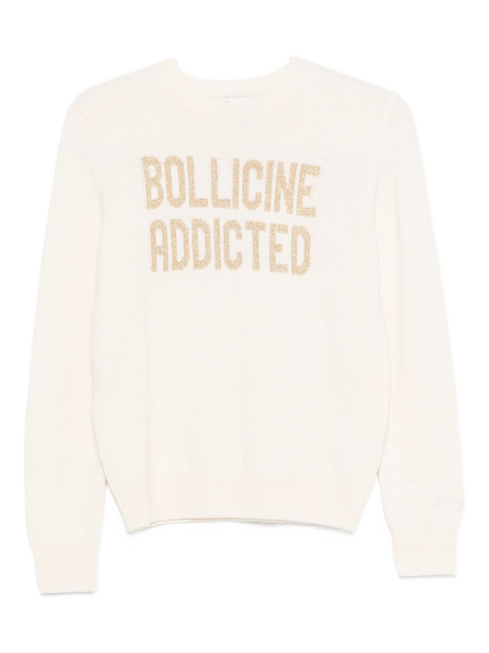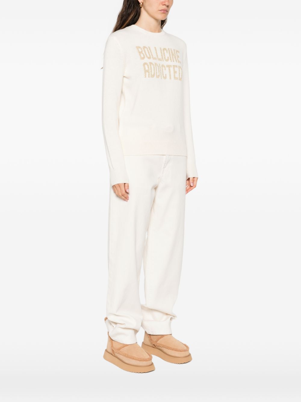 Ivory cashmere wool crew neck sweater with gold Bollicine Addicted embroidery, long sleeves