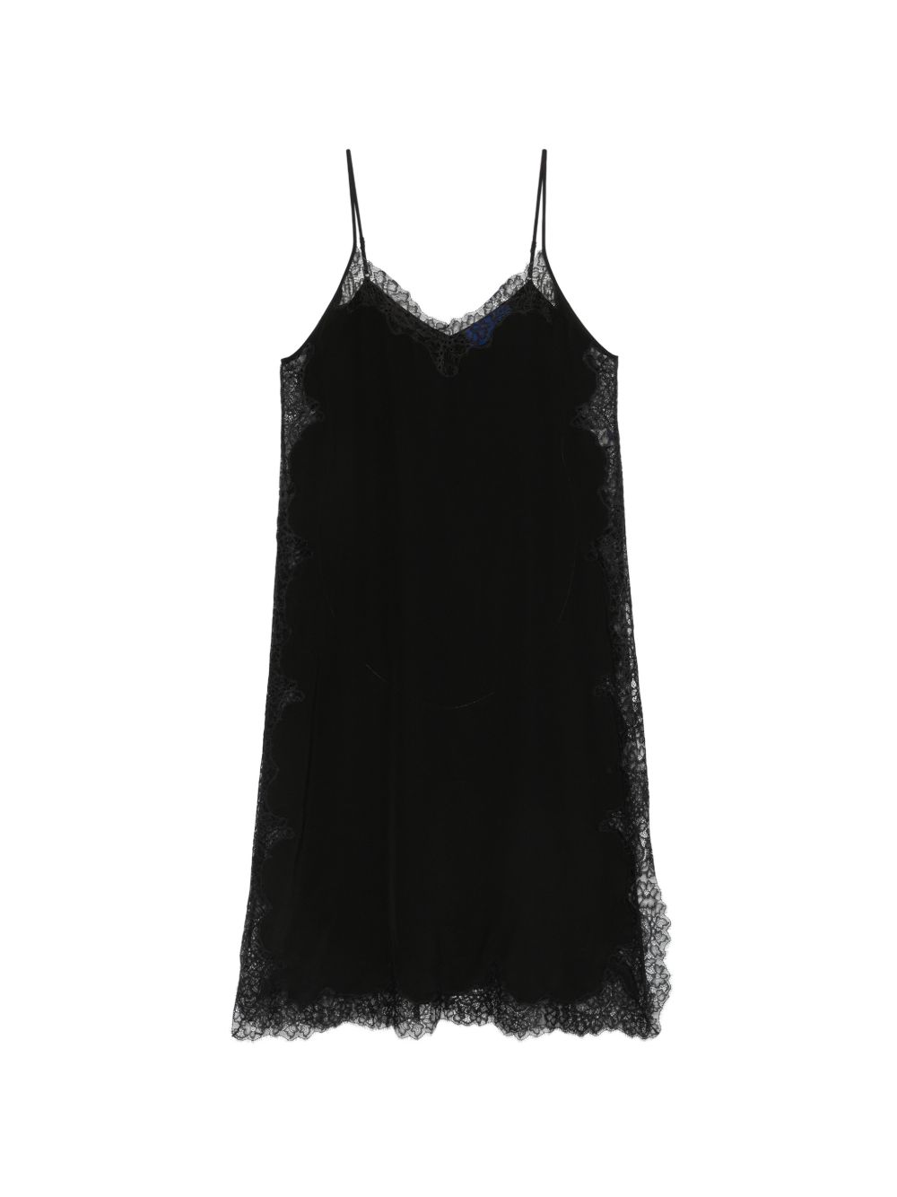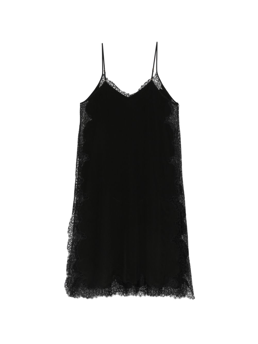 Long top with black lace details, thin straps, side slits, and a V-neck
