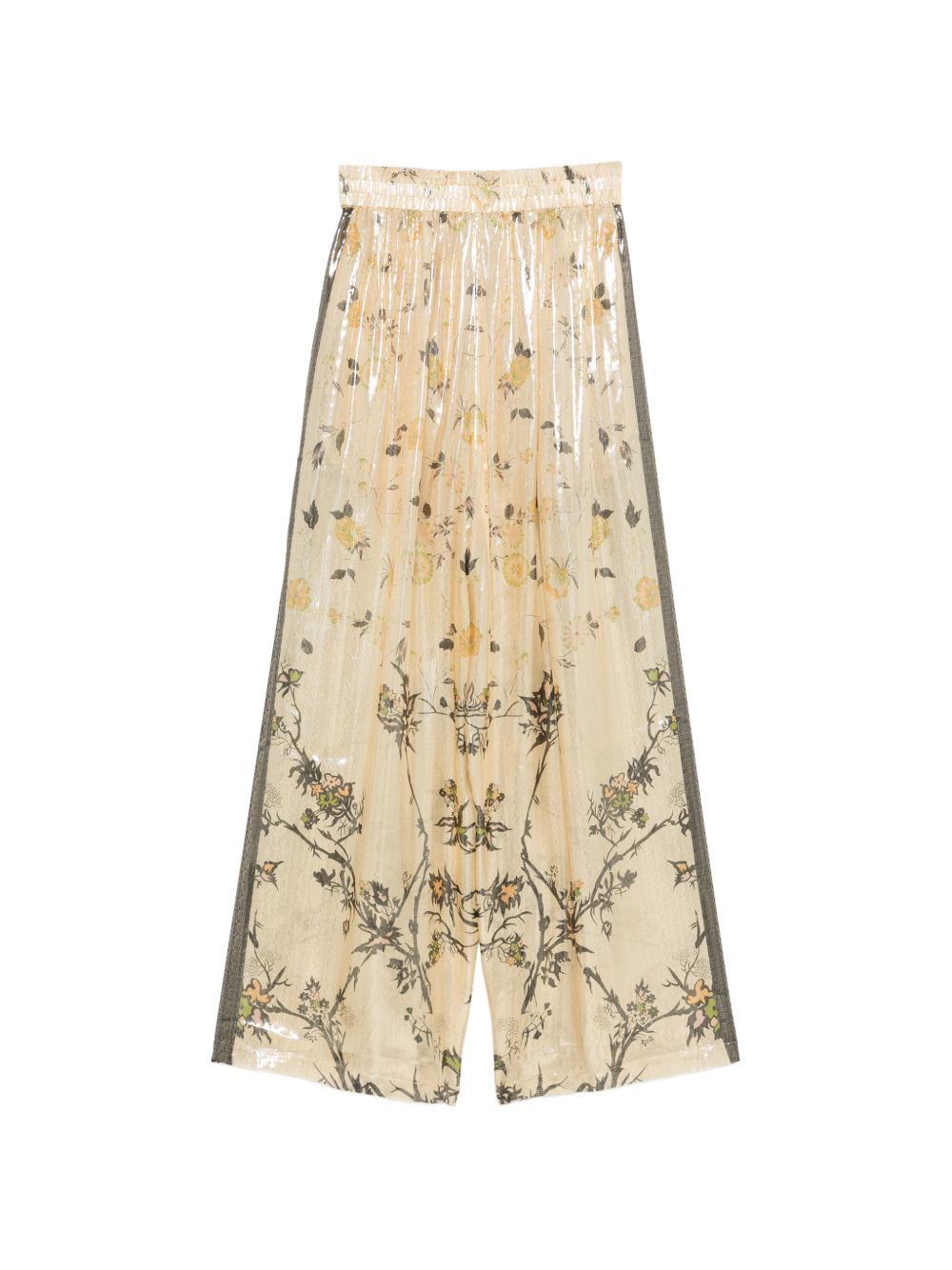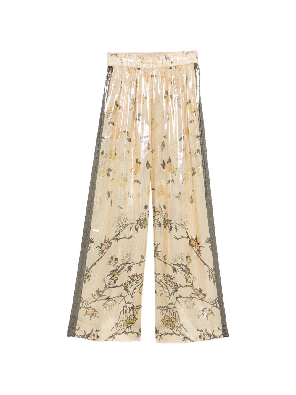 Gold silk trousers with a floral print, contrasting trim and an elasticated waistband