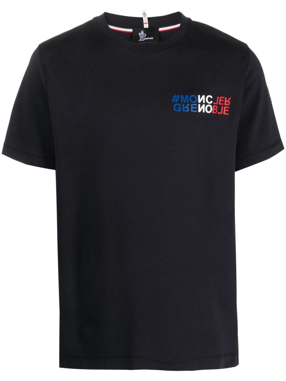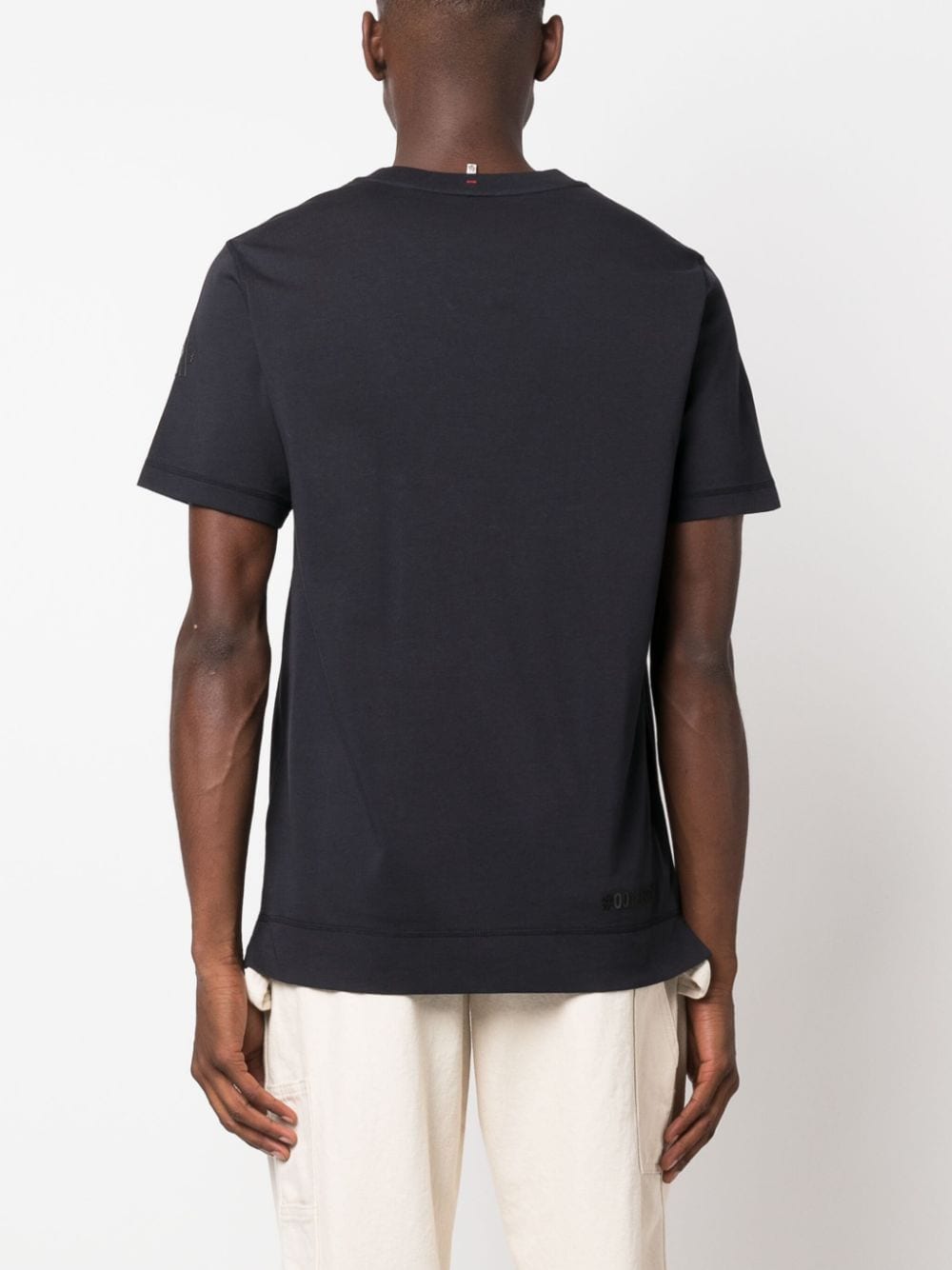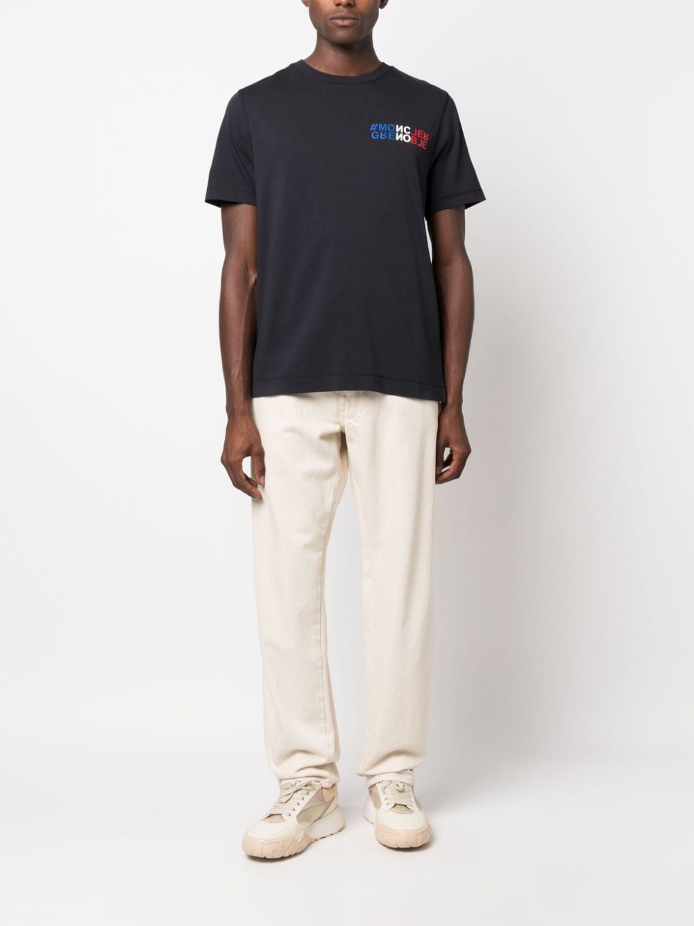 navy blue cotton "Mountain" logo-print T-Shirt featuring number print to the rear, crew neck, short sleeves, short side slits and straight hem.