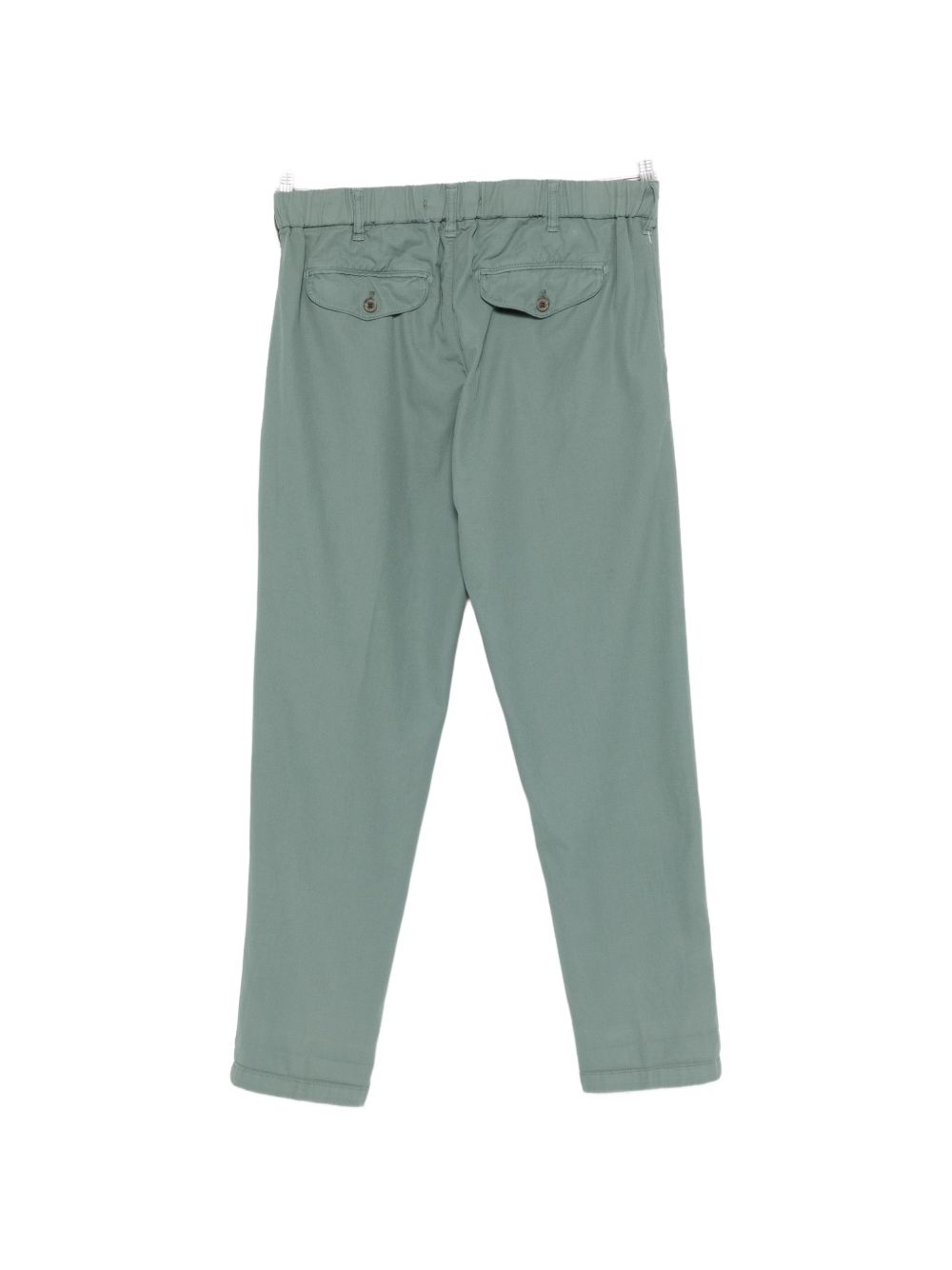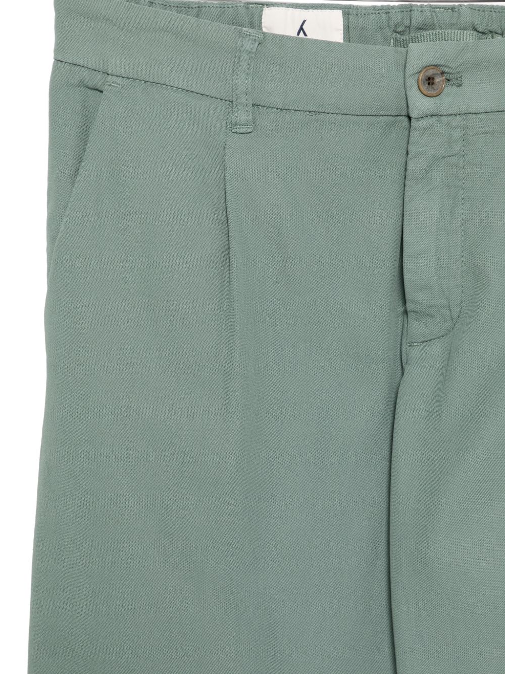 Green cotton gabardine pants, elasticated waistband at the back, slanted pockets, button and zip closure