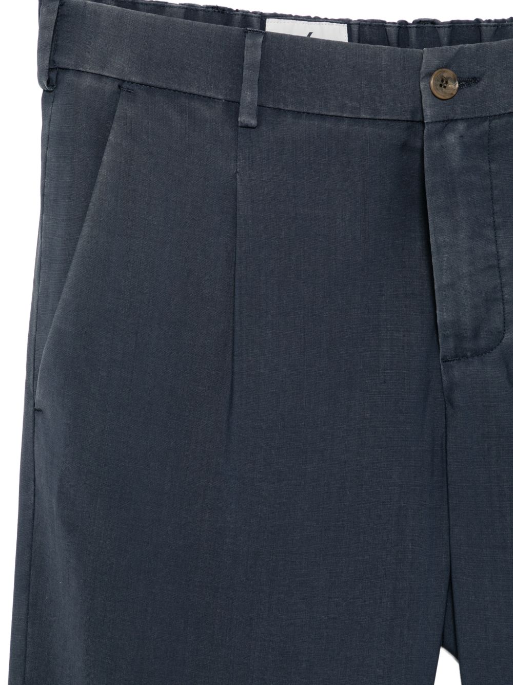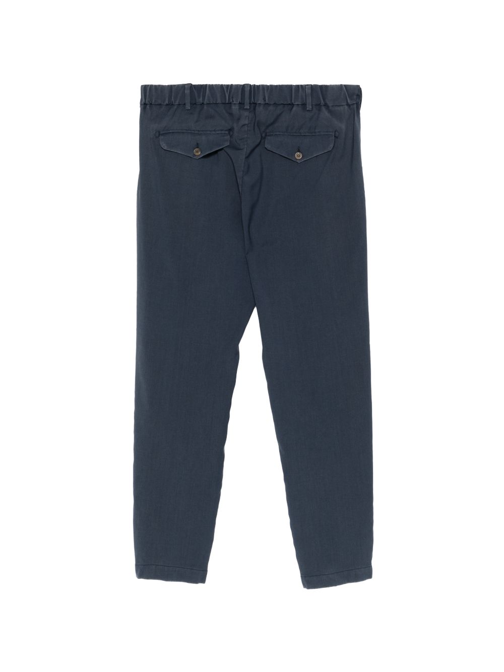 Blue wool canvas trousers, elasticated back waistband, slanted pockets, button and zip closure, regular fit