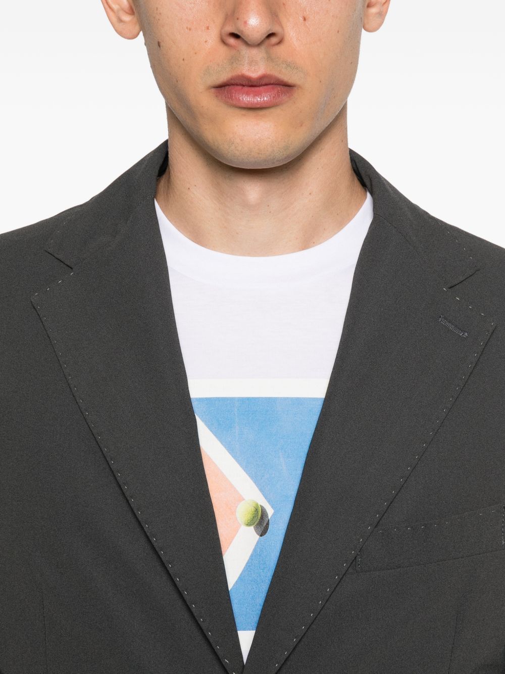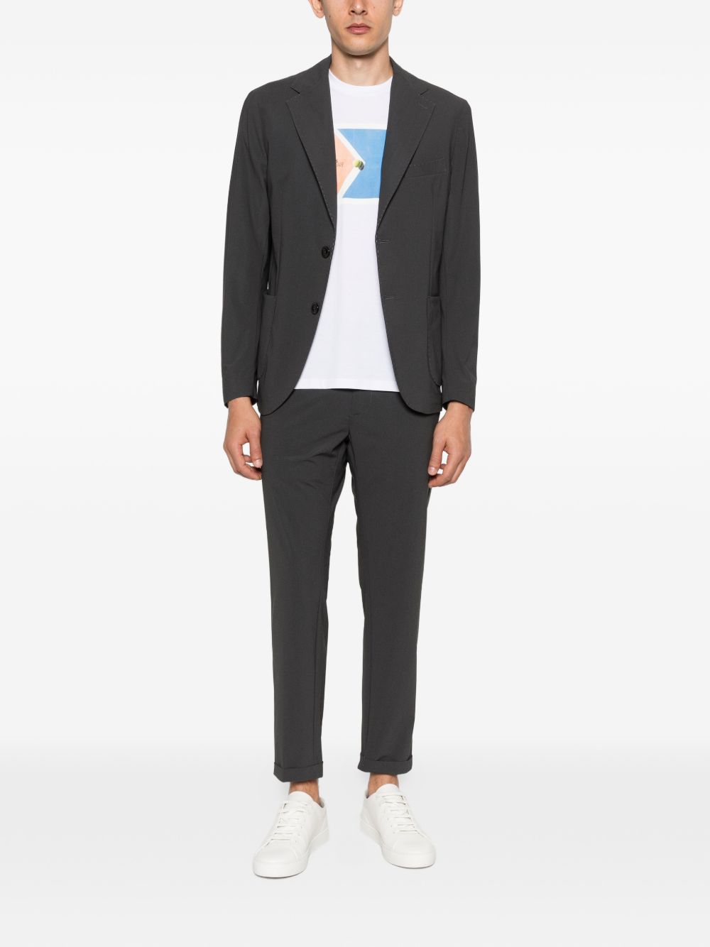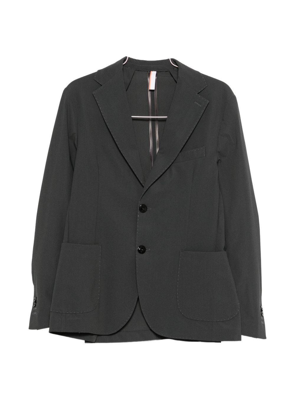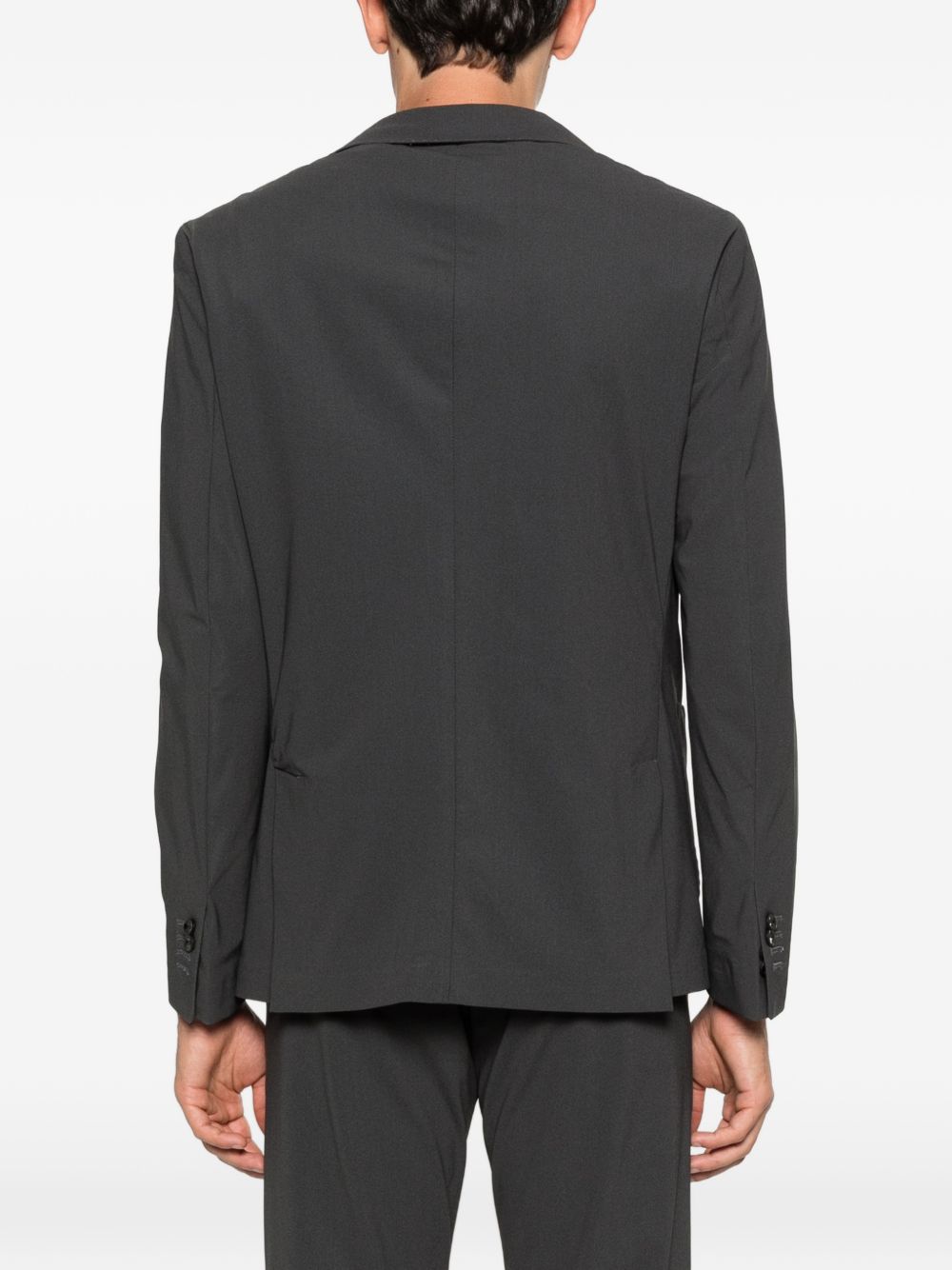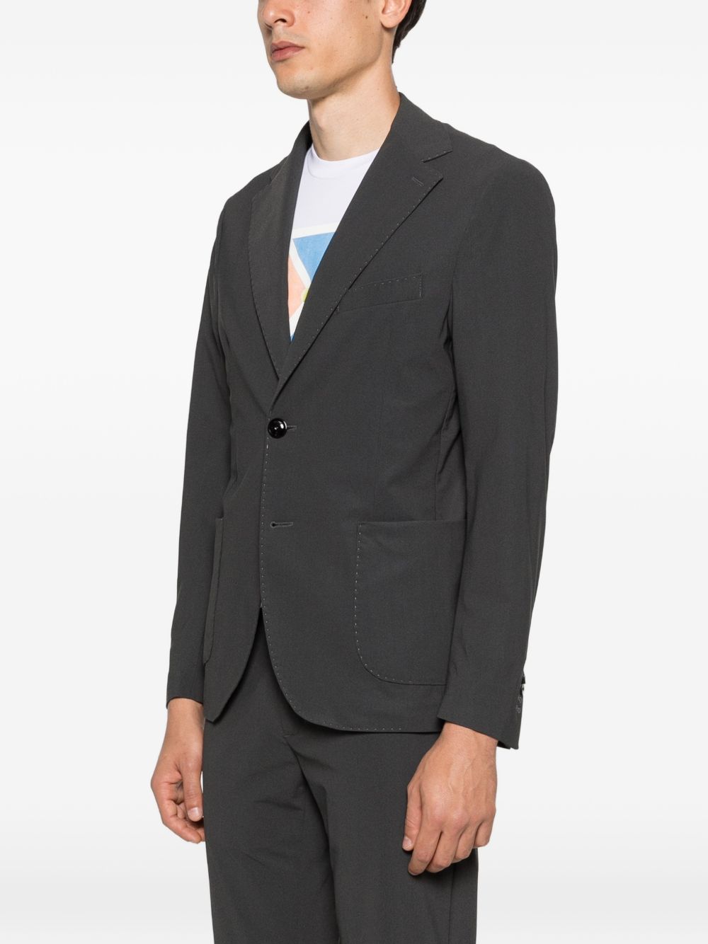 Charcoal gray lycra jacket with two buttons, classic lapels, and two front pockets