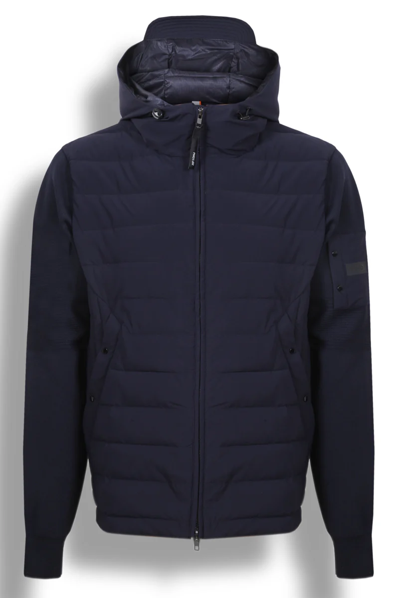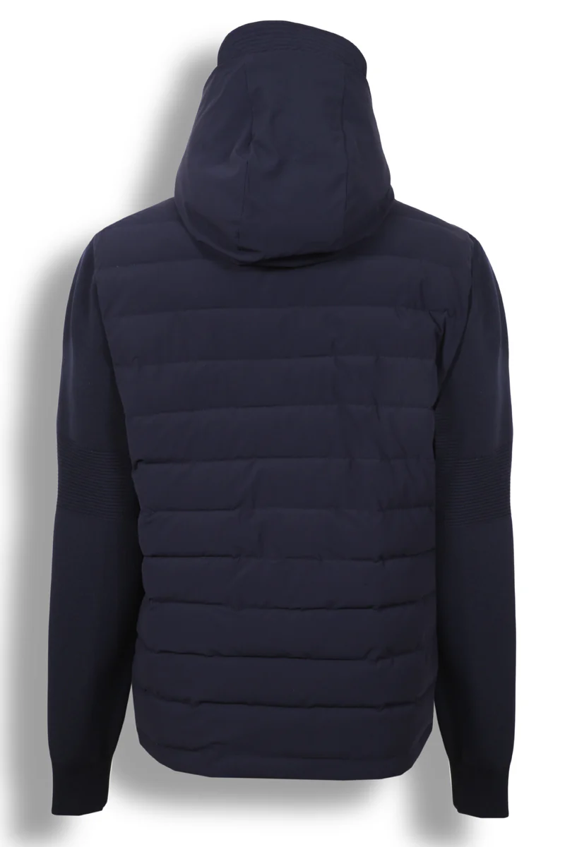 Blue nylon down jacket, adjustable hood, knitted sleeves, zip closure