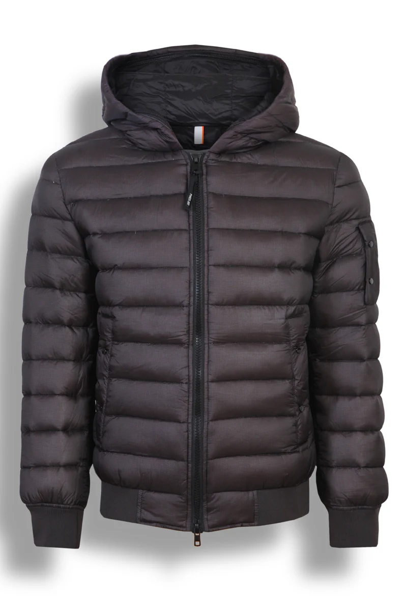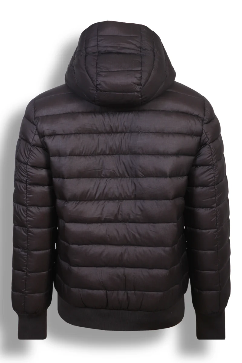 Dark brown ripstop nylon down jacket, zip closure, hood with double trim