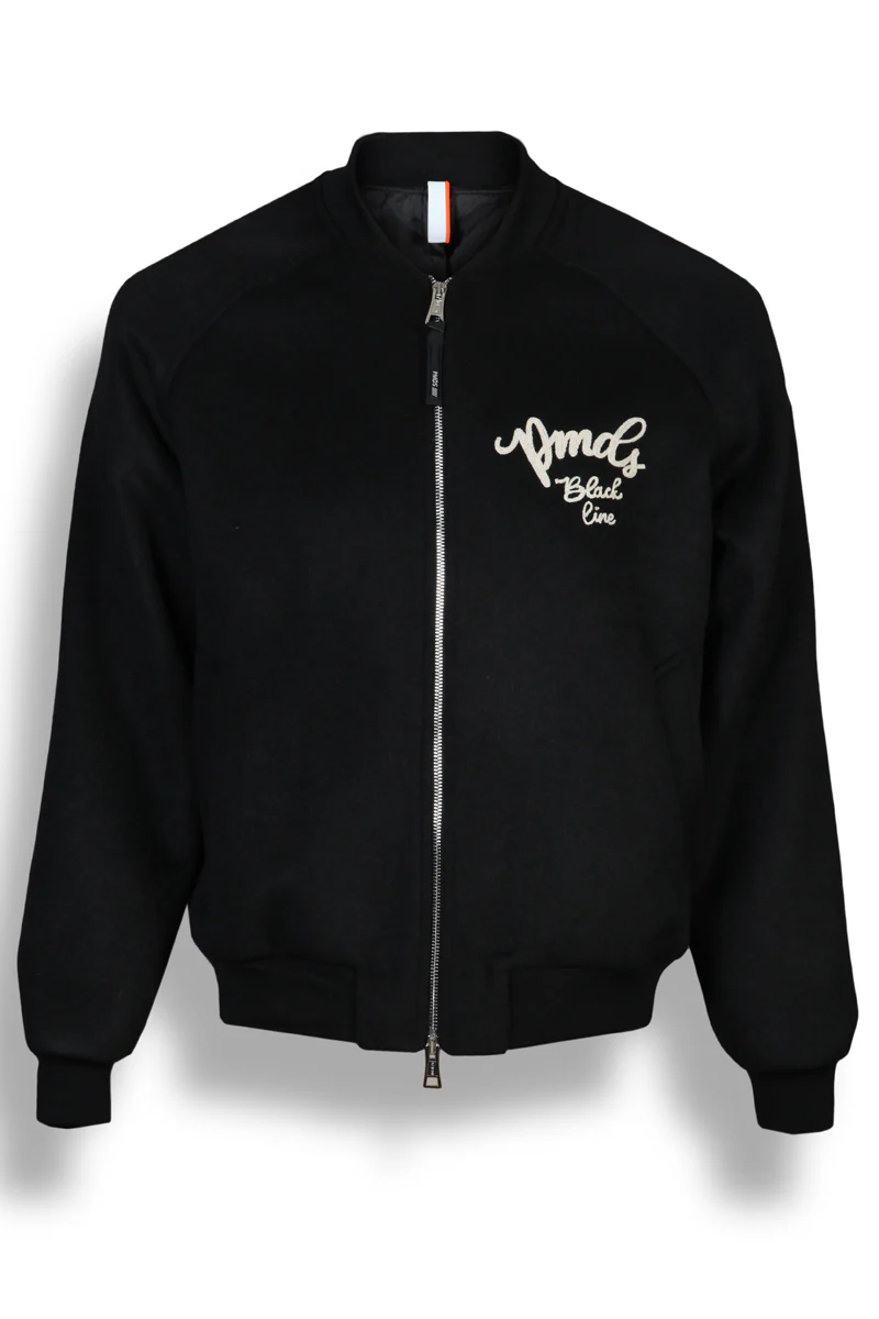 Black wool bomber jacket, raglan sleeves, embroidered logo on the chest, zip closure