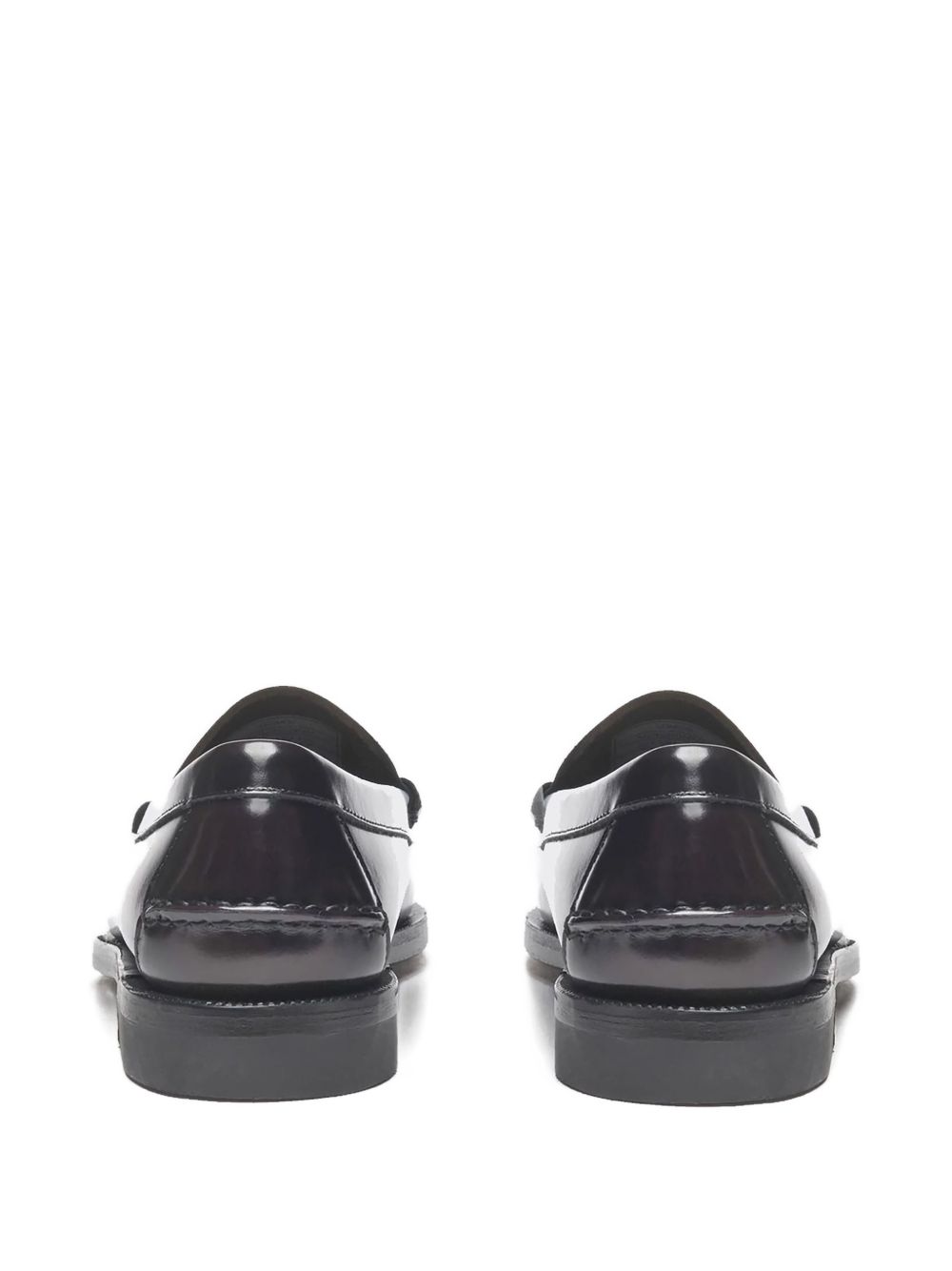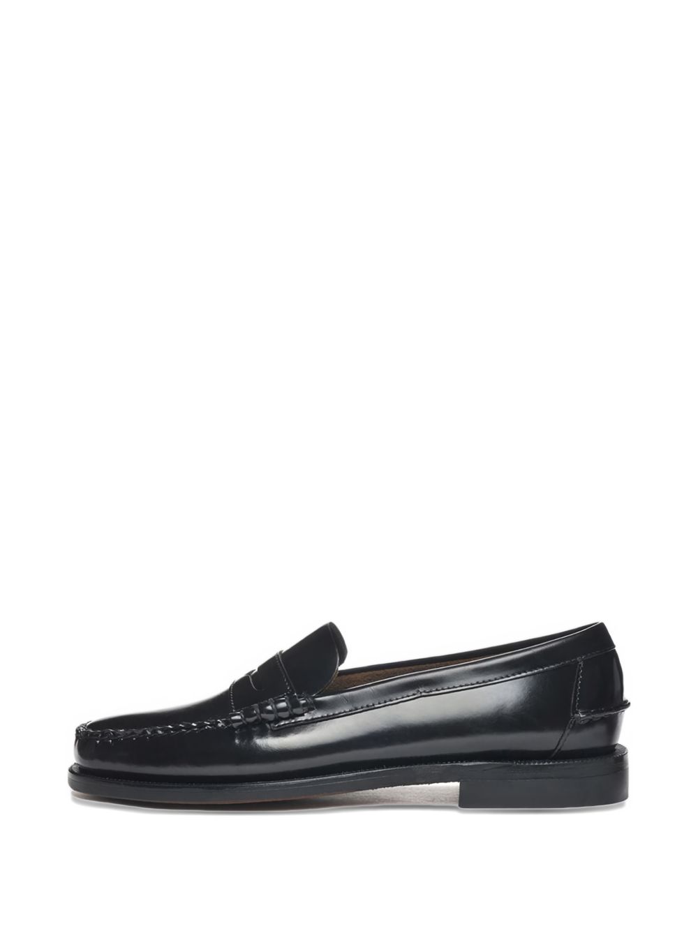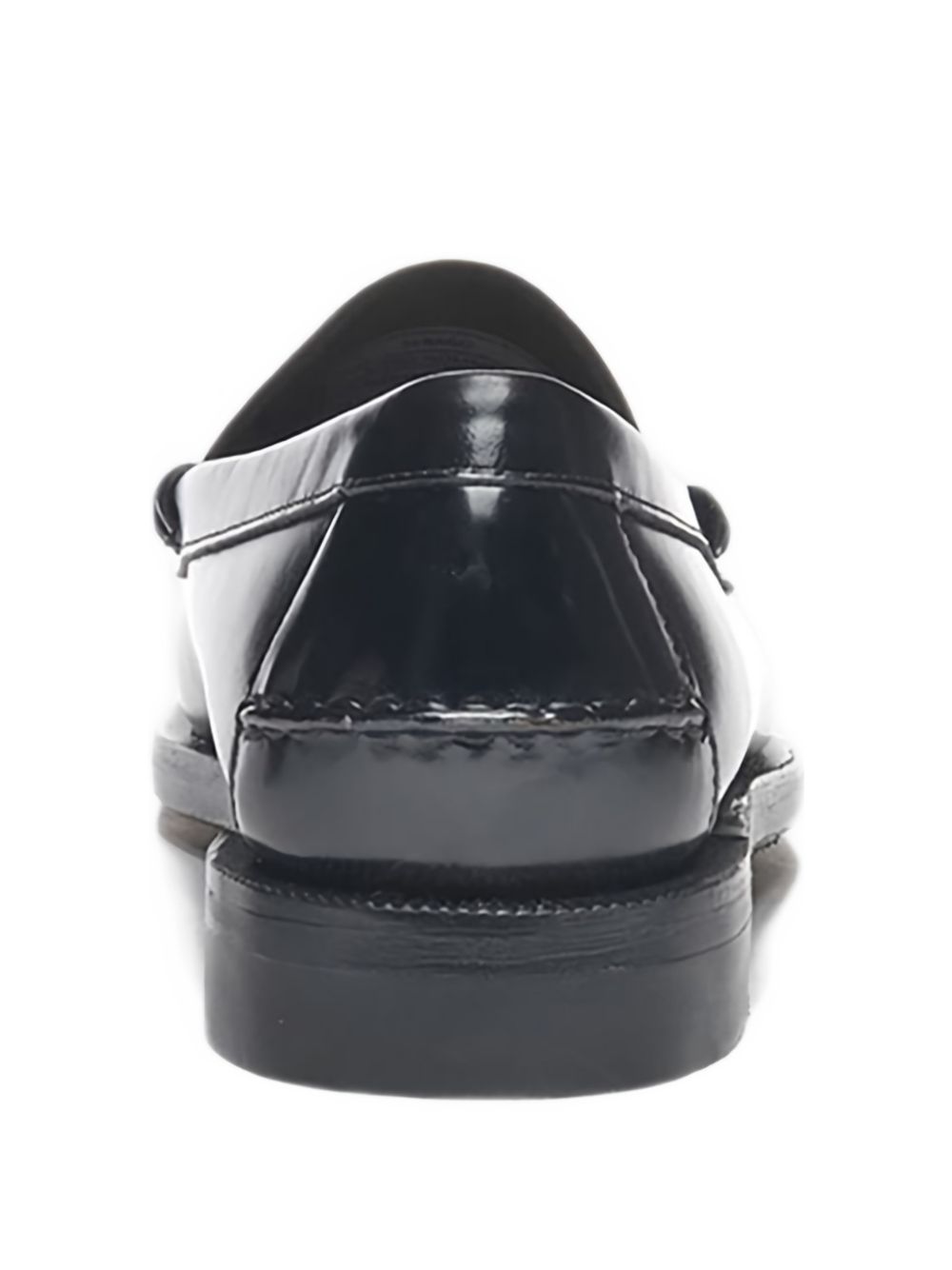 Black leather slip-on loafers, penny style, round toe, branded insole, flat sole