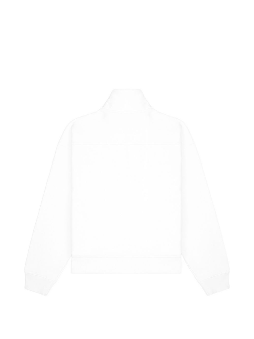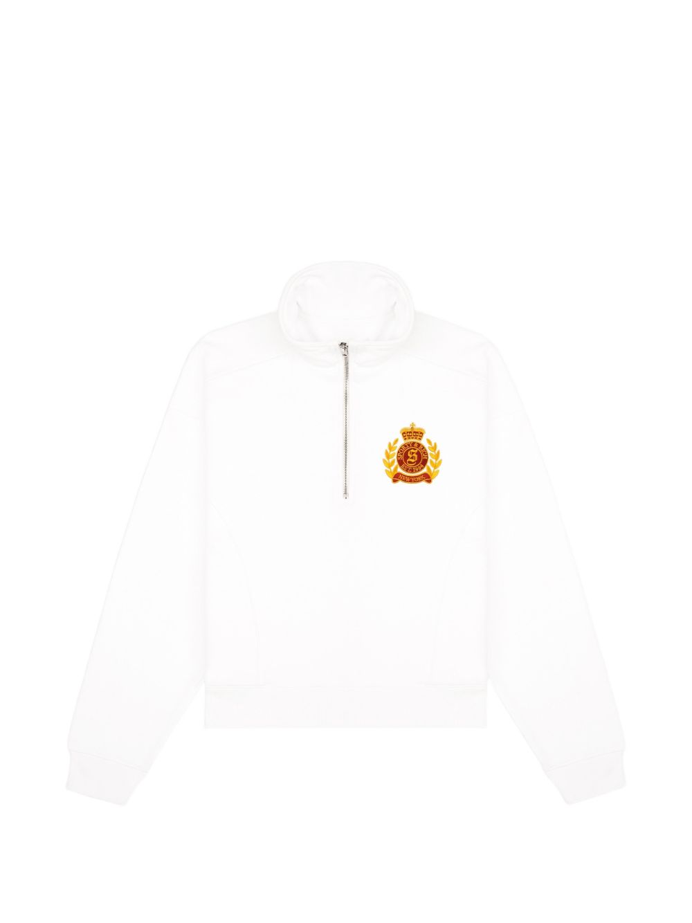 White cotton sweatshirt, half-zip front, half collar, contrasting embroidered logo
