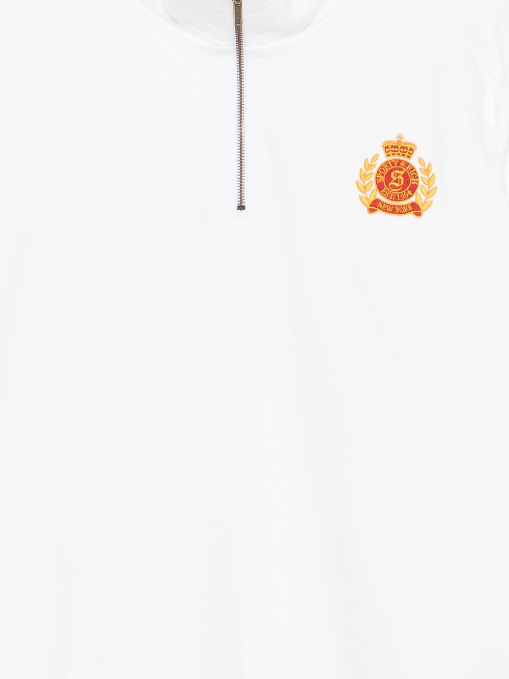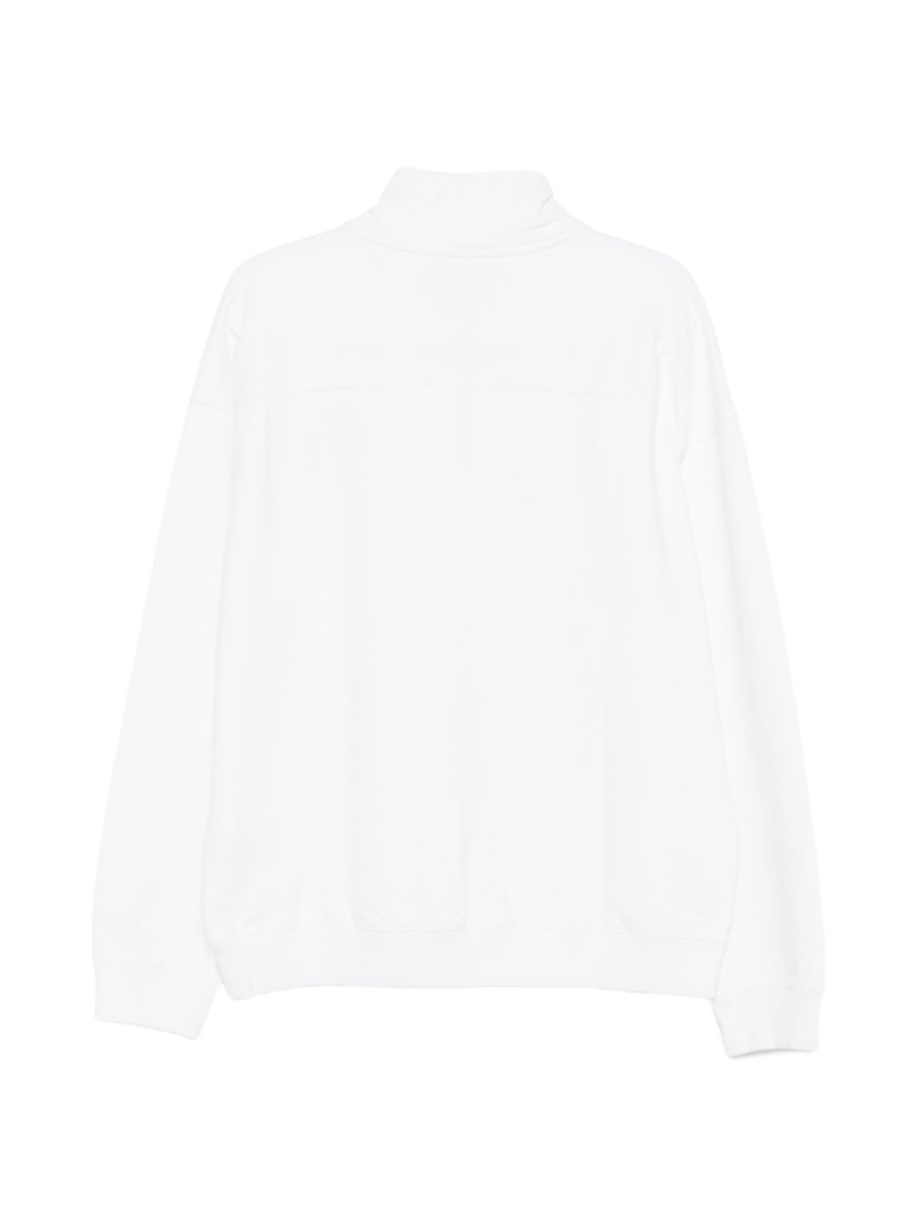 White cotton sweatshirt, half collar, half front zip hood, logo on the chest