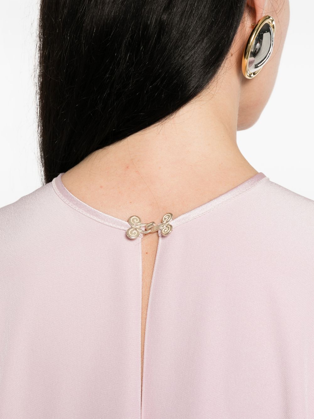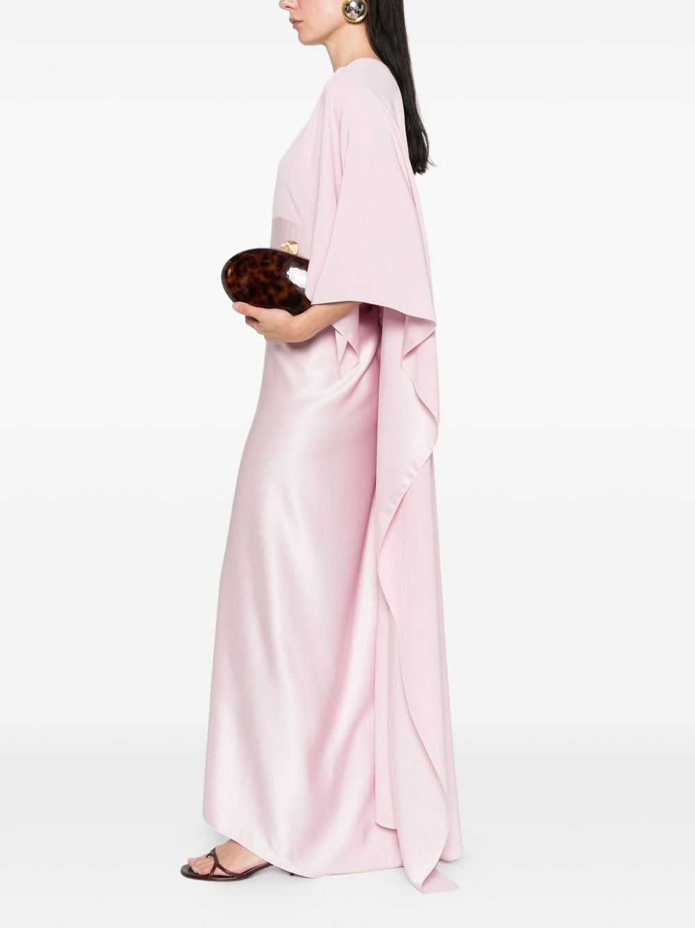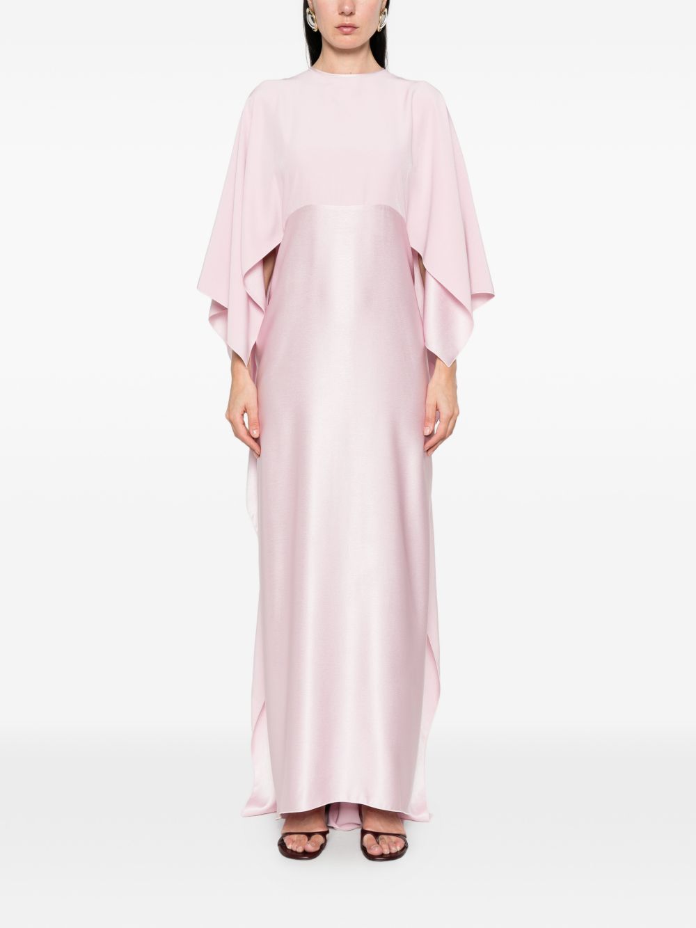 Pink maxi dress in shiny and matte polycady, crew neck, cape with hook closure, off-the-shoulder