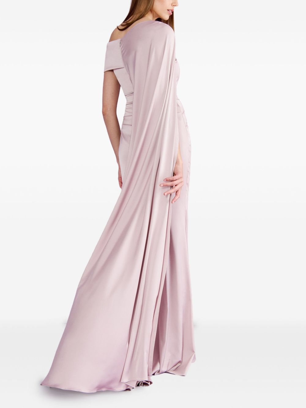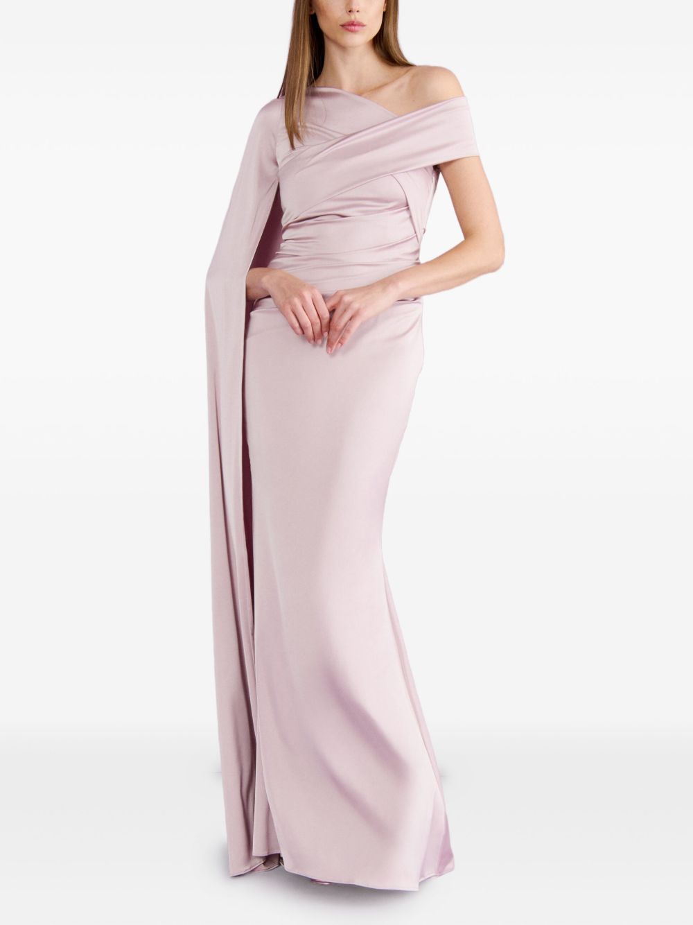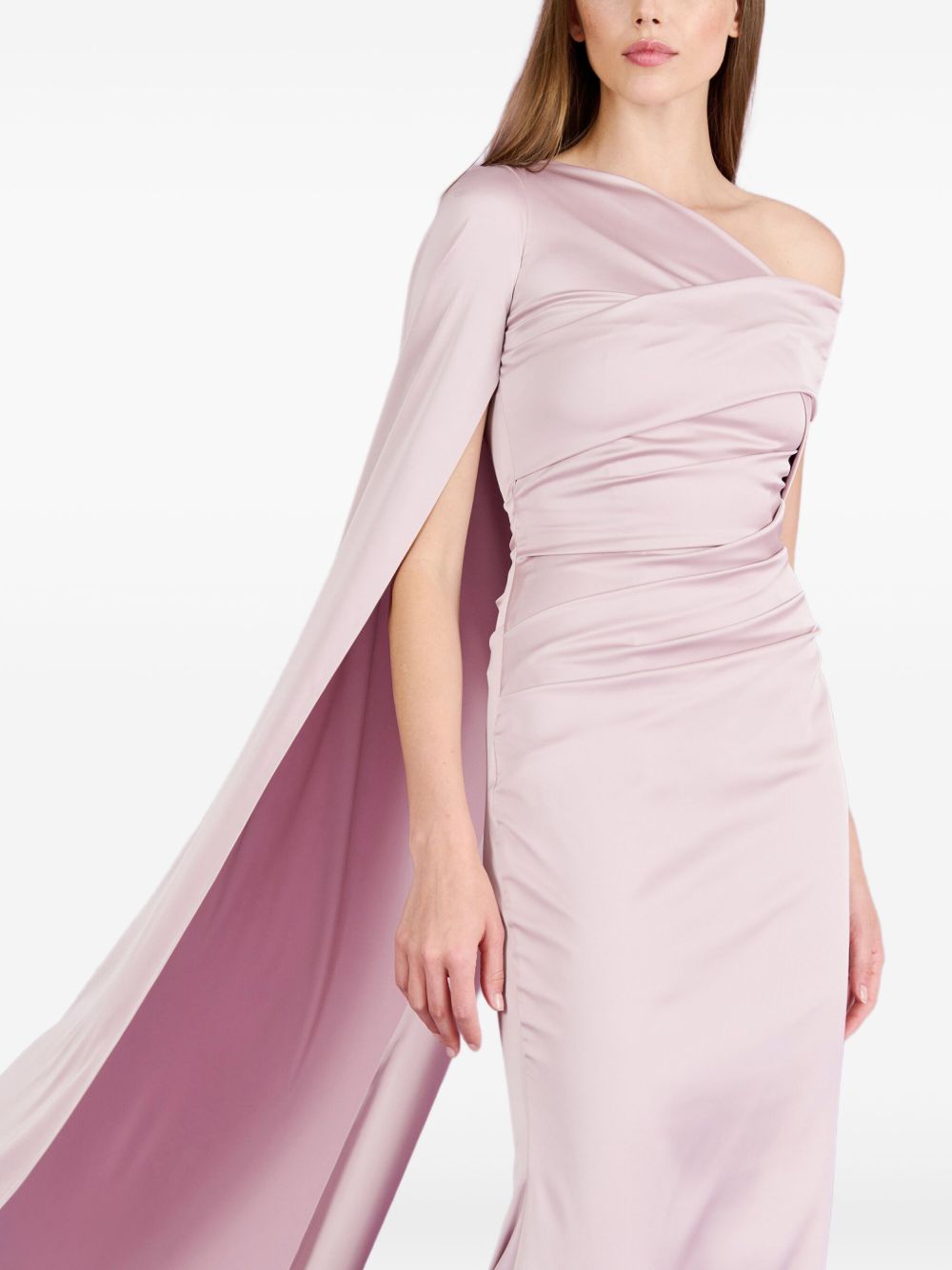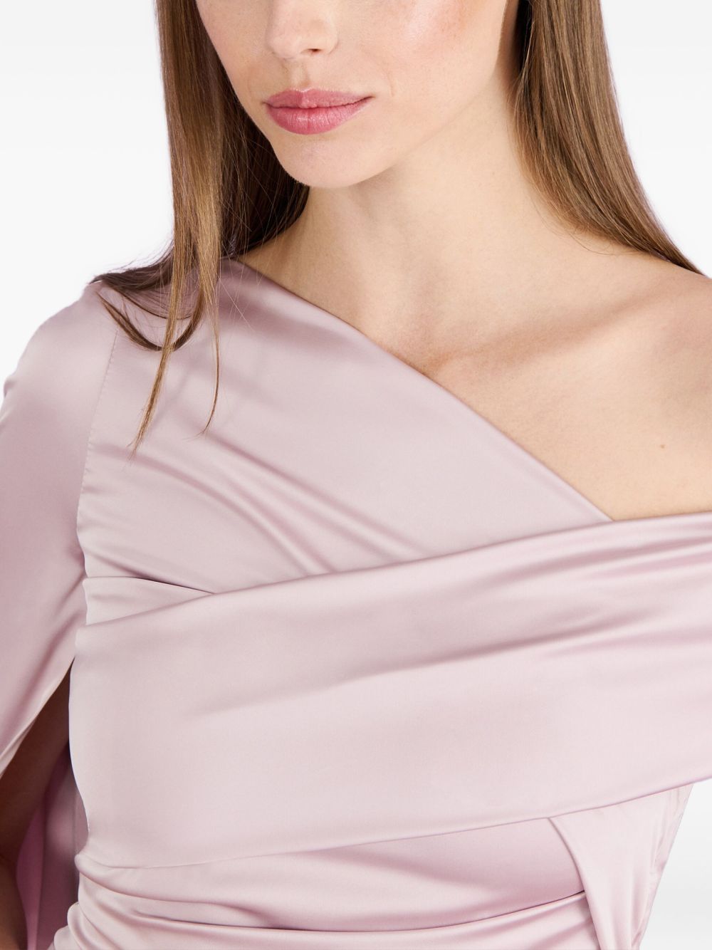 Long antique pink dress, one shoulder with cape, crossed band at the front, straight neckline