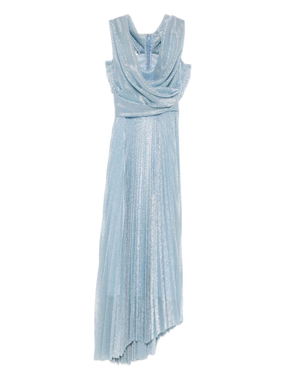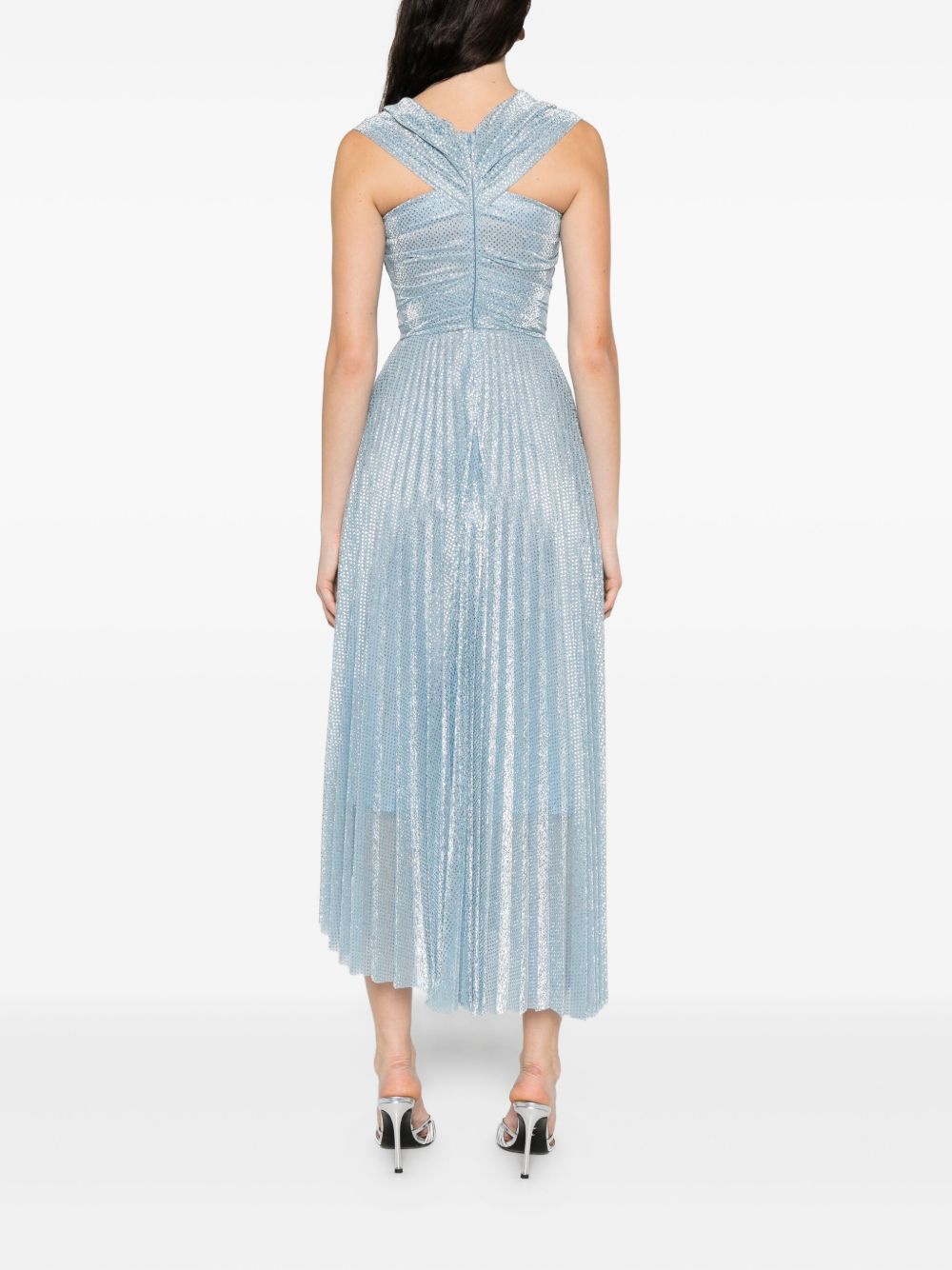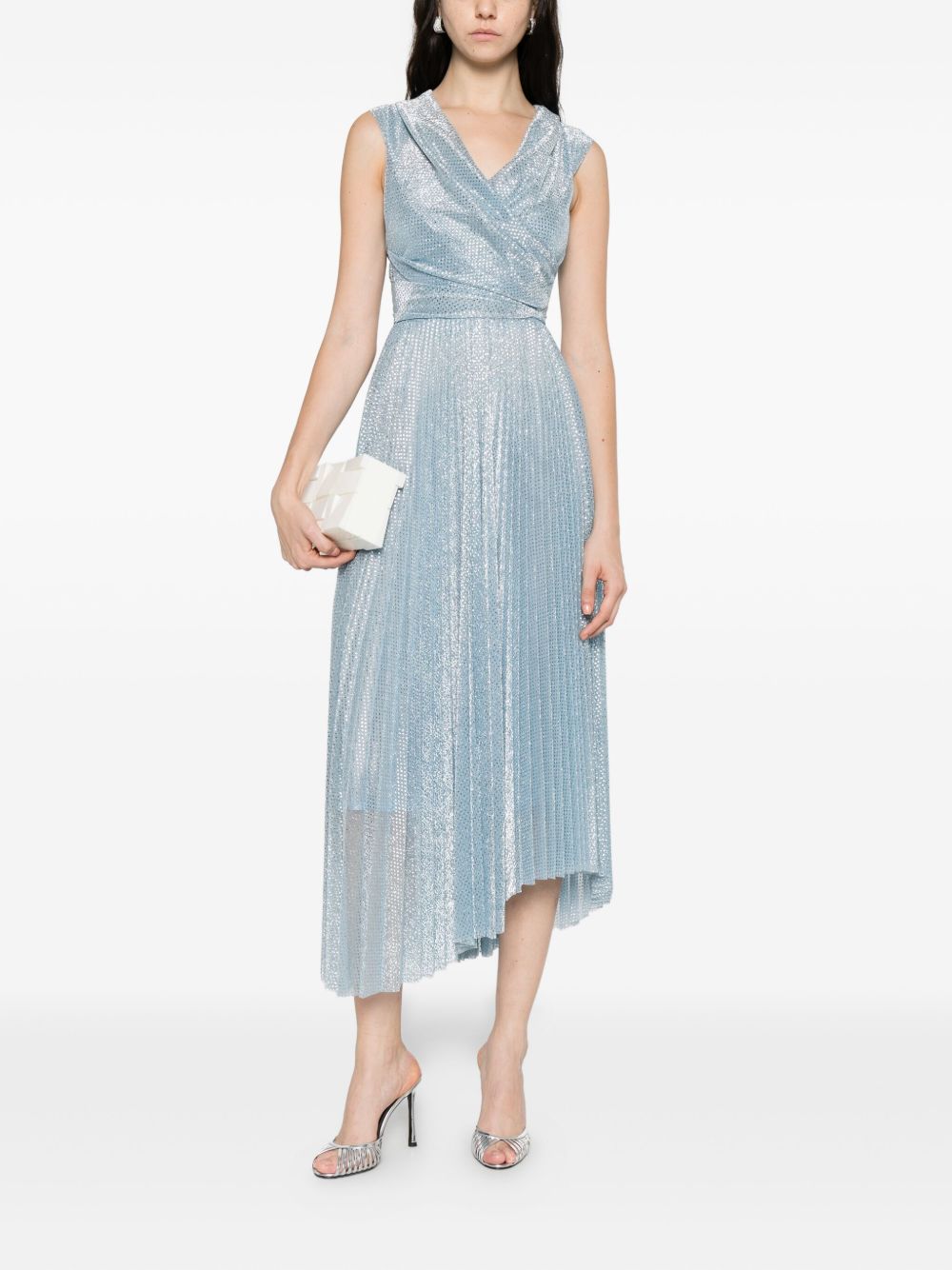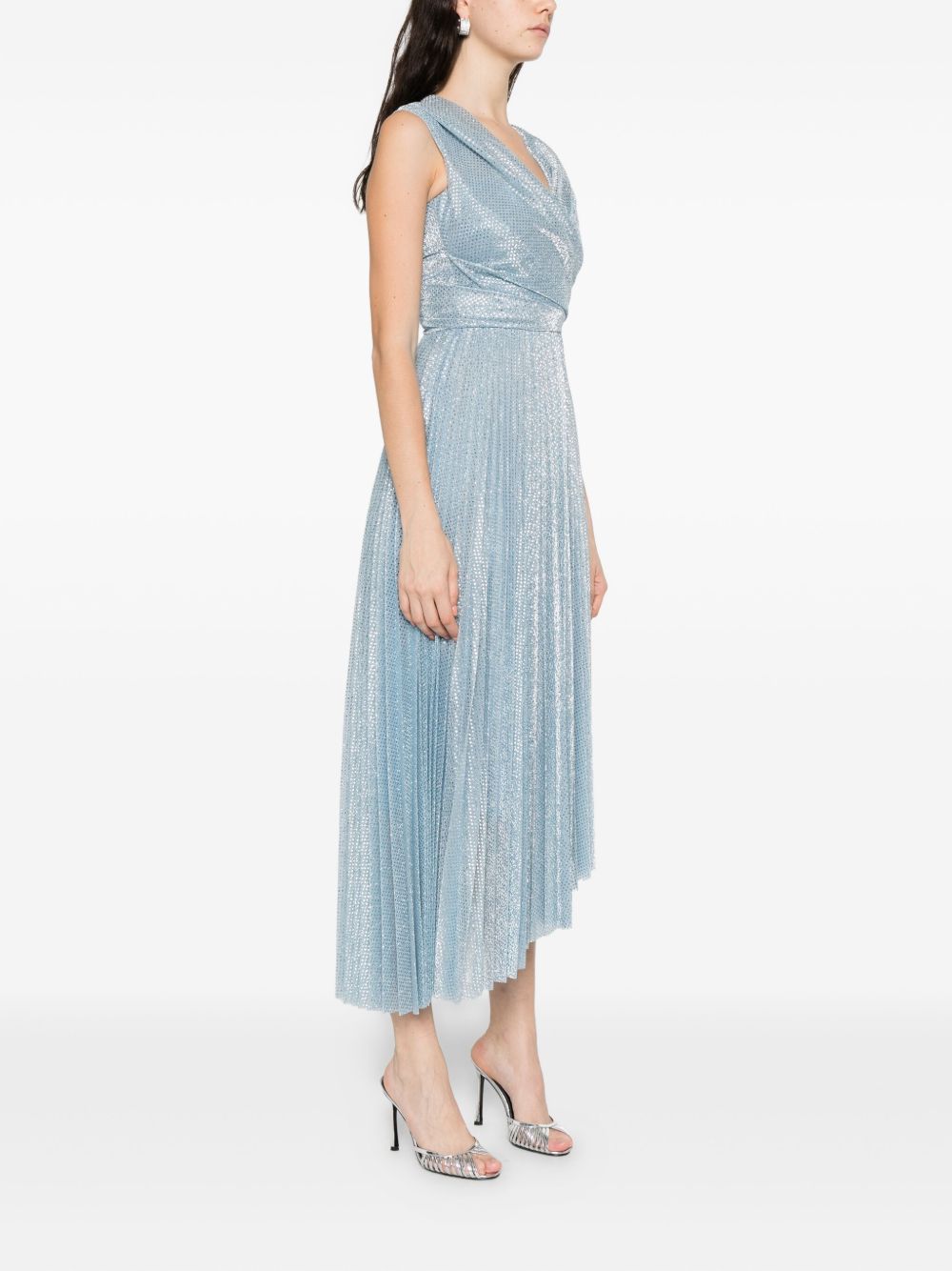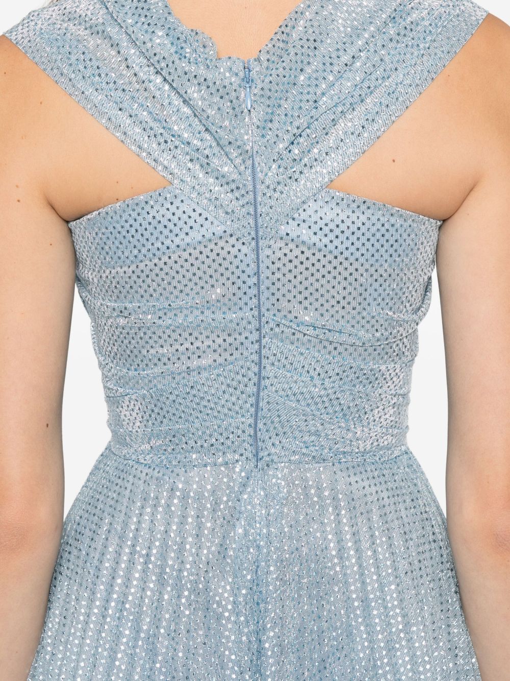 Asymmetrical light blue polka dot tulle dress, pleated skirt, V-neckline, bandeau crossover