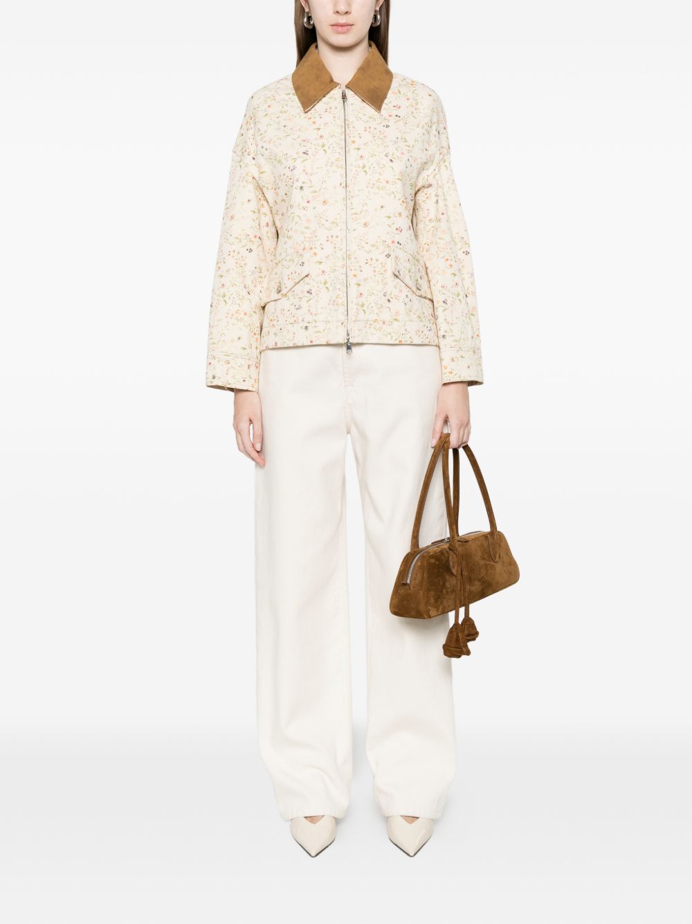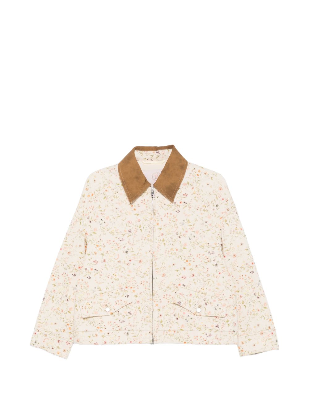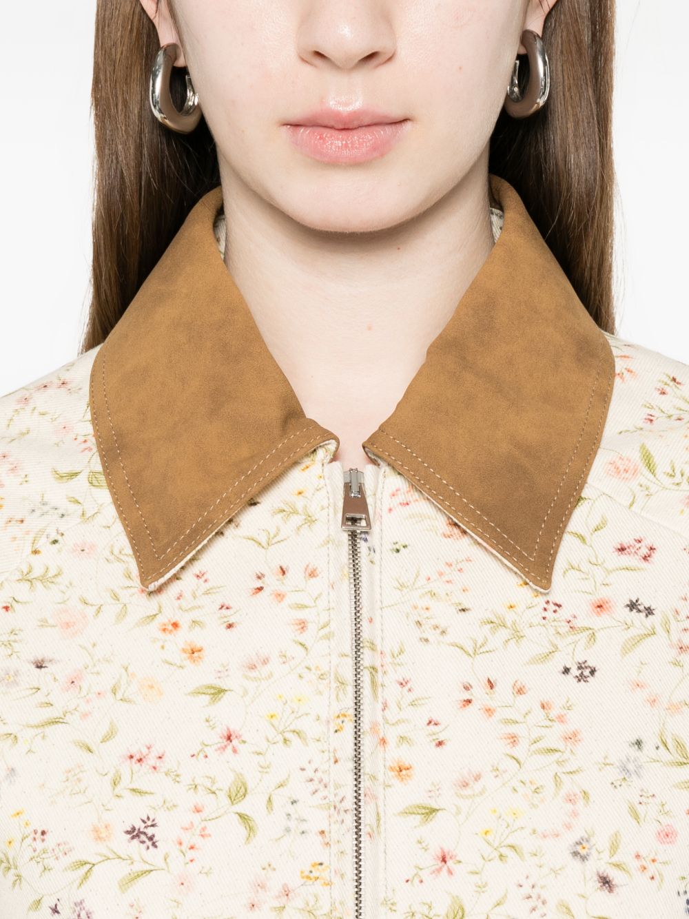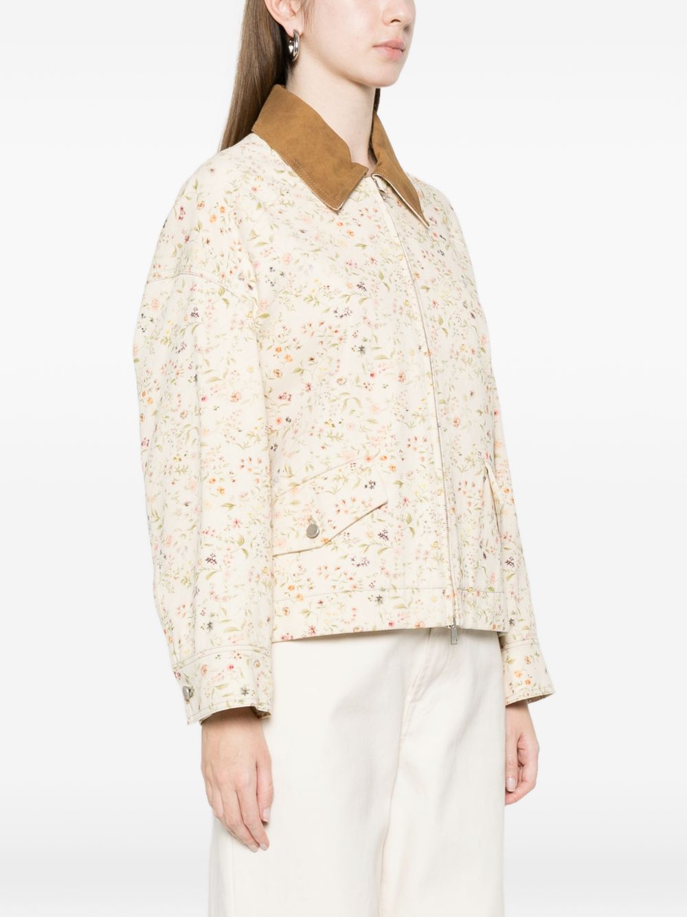 Light sand cotton bomber jacket with all-over floral print, contrasting beige collar, zip closure