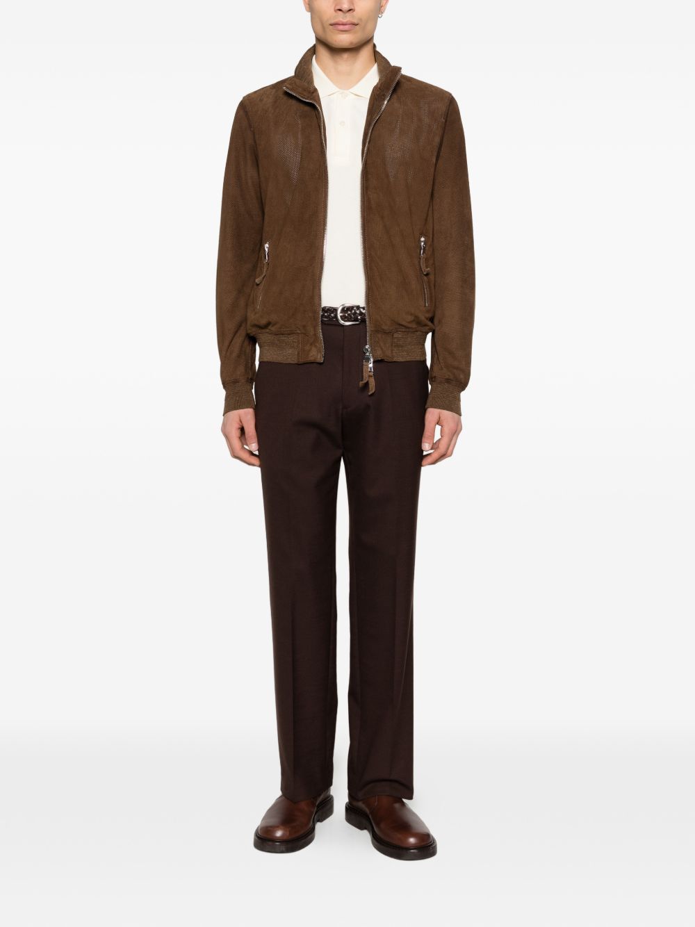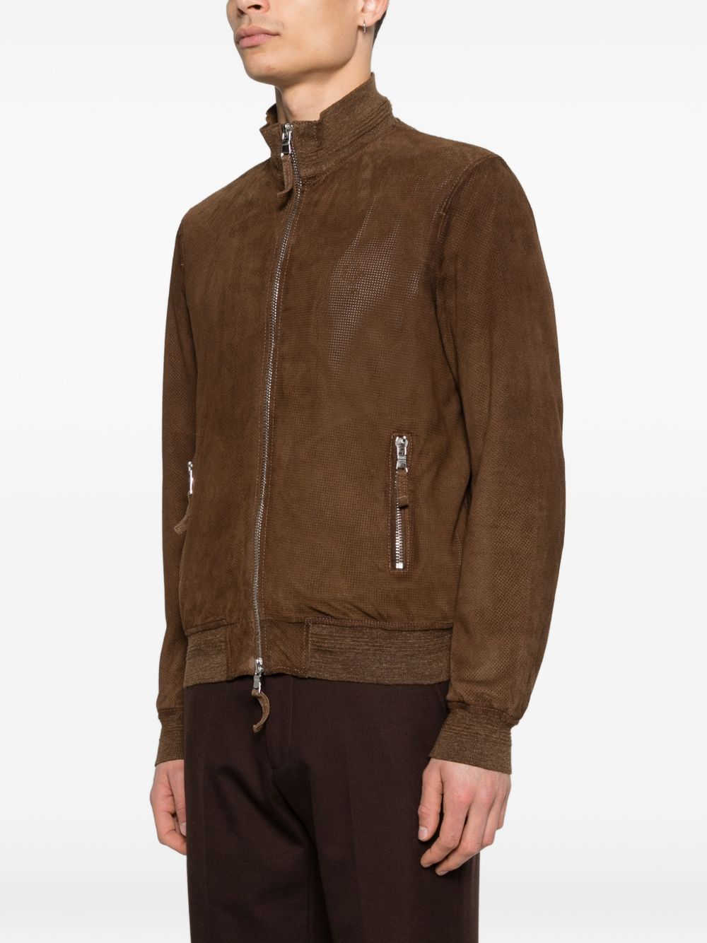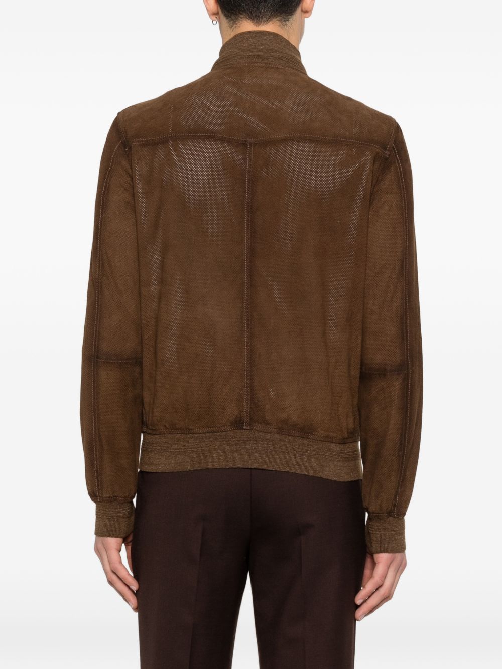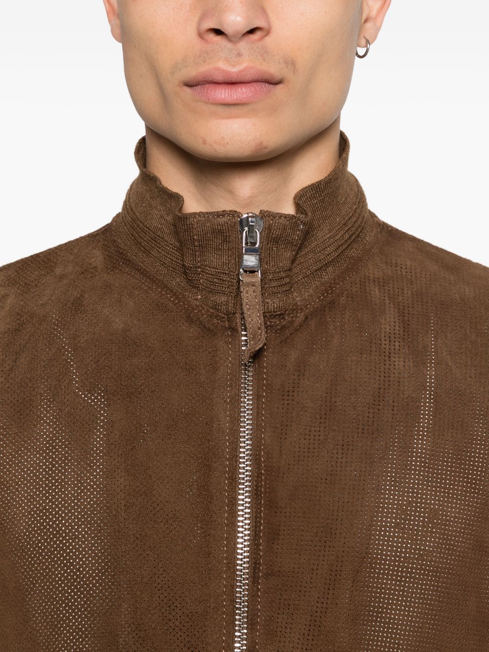 Brown perforated suede jacket, stand-up collar, knitted edges, zip fastening, side pockets