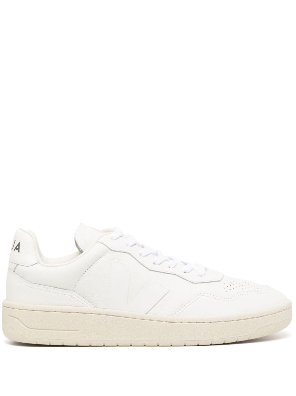 White calfskin sneakers, perforated round toe, front lace-up closure, logo patch on tongue, ridged rubber sole