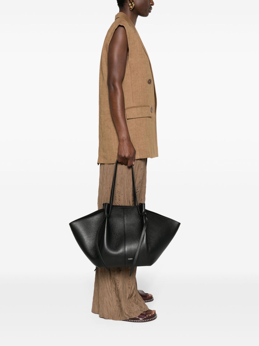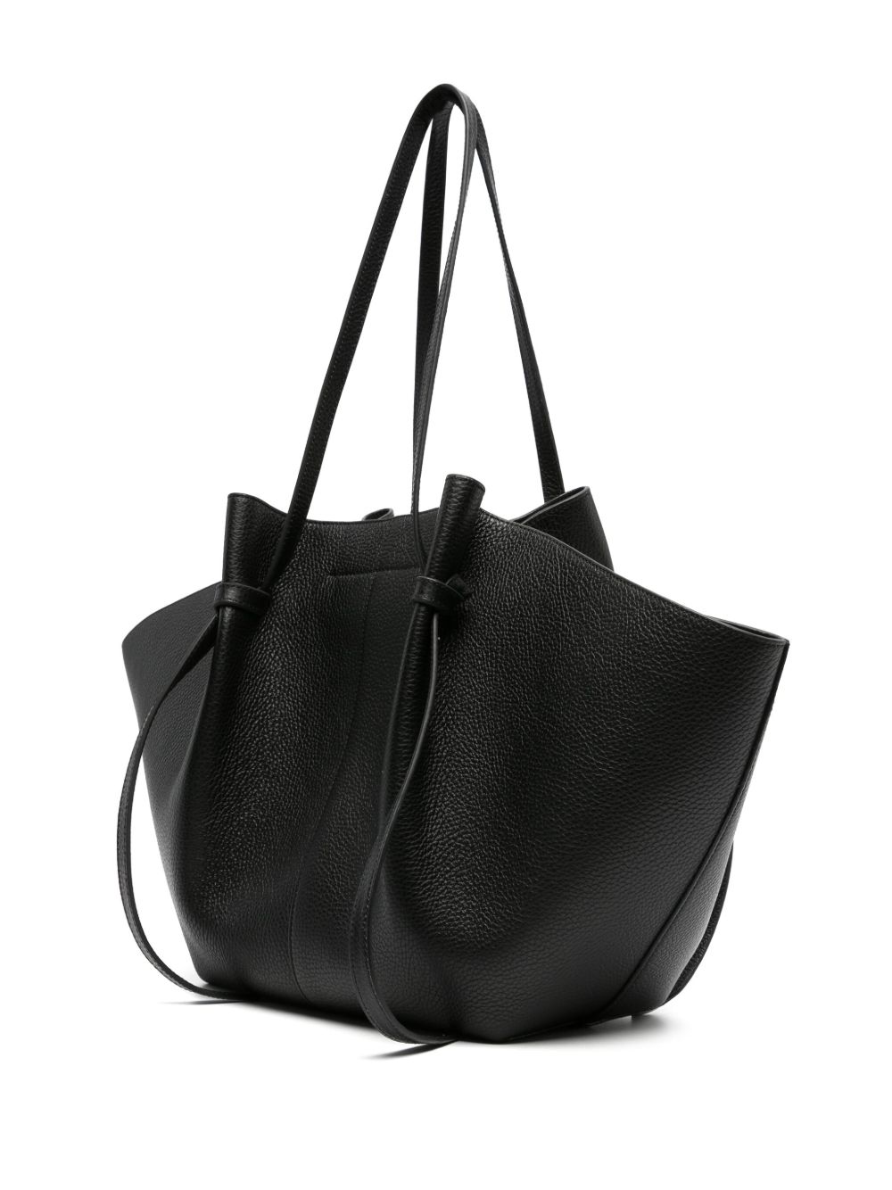 Large Mochi bag in black leather, to be worn over the shoulder, magnetic closure. Adjustable shoulder strap, the characteristic knot can be loosened to lengthen the strap and fasten it to the long