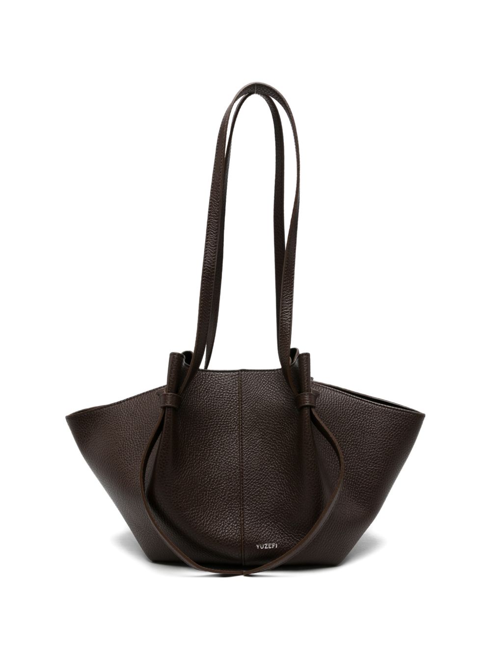 Coffee-colored leather Mochi bag, designed to be worn over the shoulder, with a magnetic closure. The adjustable shoulder strap features a distinctive knot that can be loosened to extend the strap and secure it in place.
