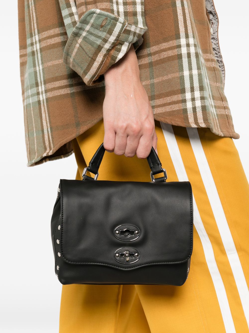 ?Postina baby? bag in nappa leather with silver studs, silver finishes, Zanellato logo, internal divider compartment, internal zip pocket, top flap, twist lock closure, single top handle and removable shoulder strap