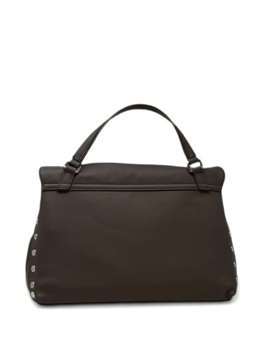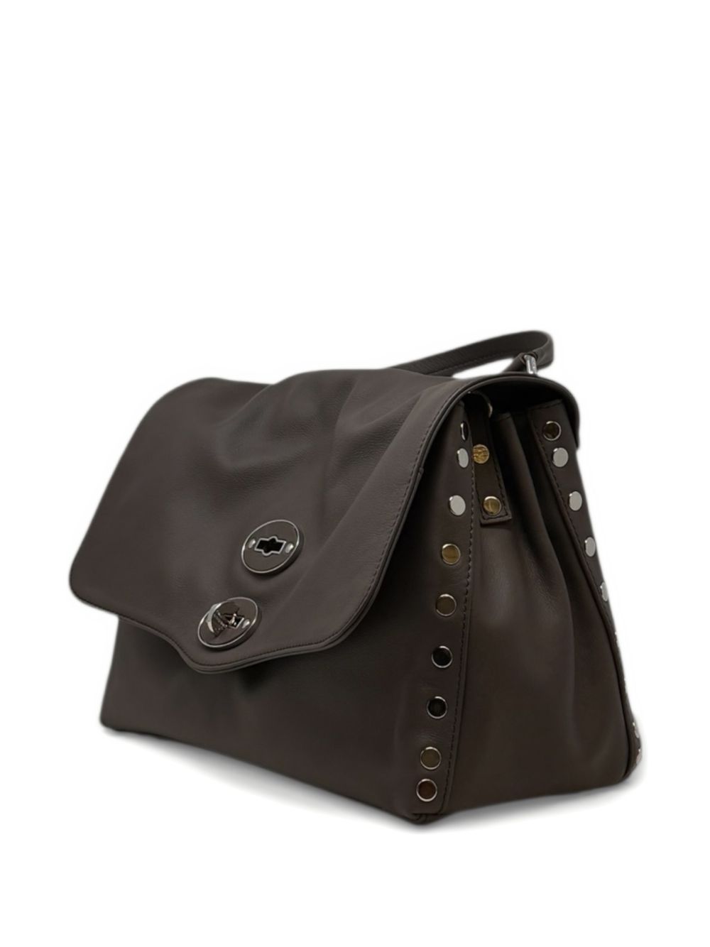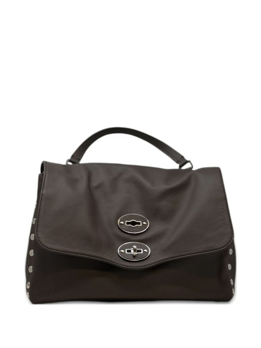 ?Postina S Saeta? bag in chocolate-brown leather with silver-colored studs, silver-colored hardware, Zanellato logo, internal divider, internal zippered pocket, top flap, twist lock closure, single top handle, and removable shoulder strap