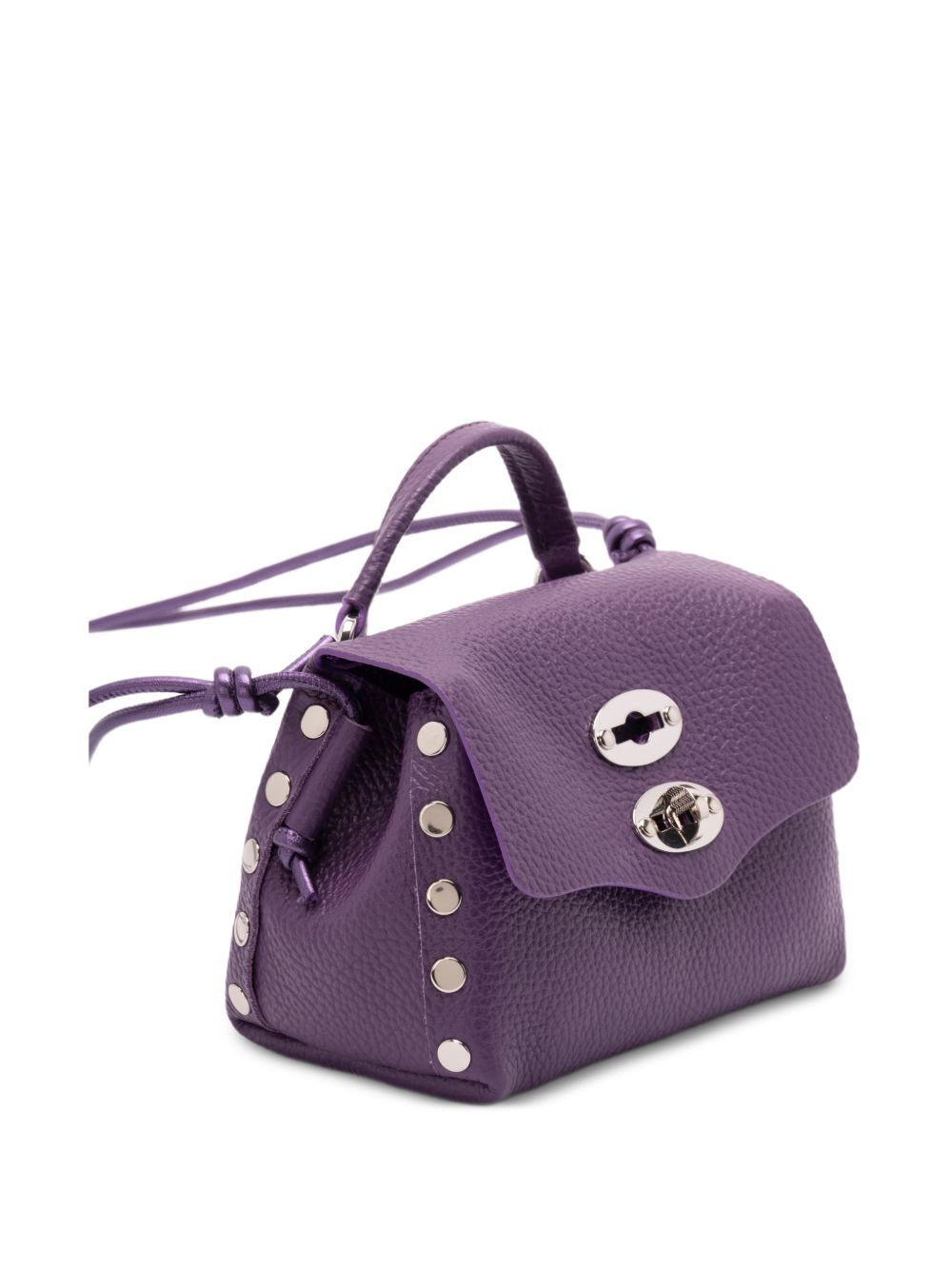?Postina Super Baby? bag in grained calfskin leather, single top handle, silver studs, metallic shoulder strap, twist-lock closure, main compartment, and internal logo patch