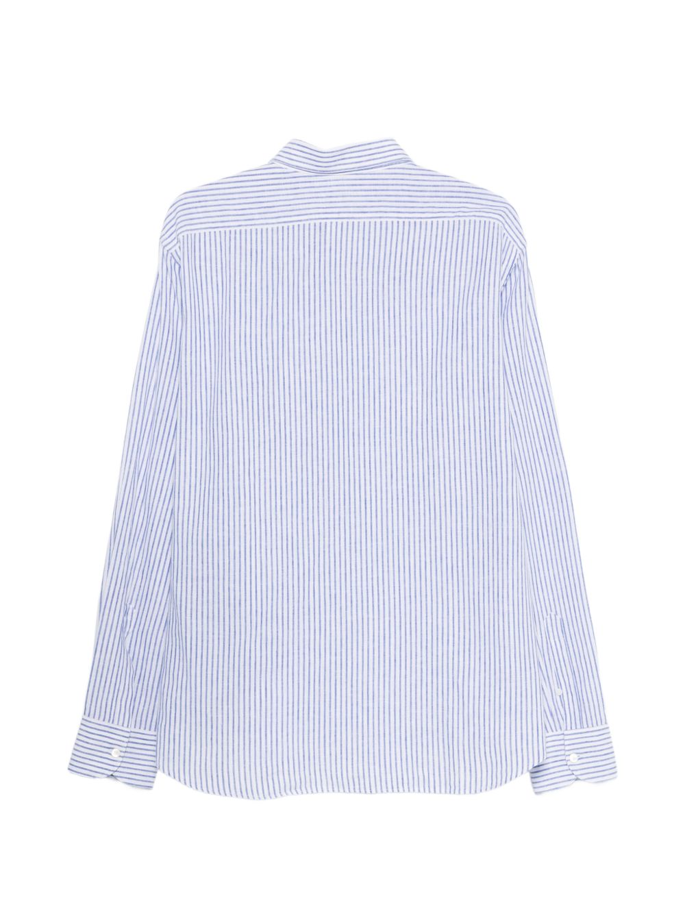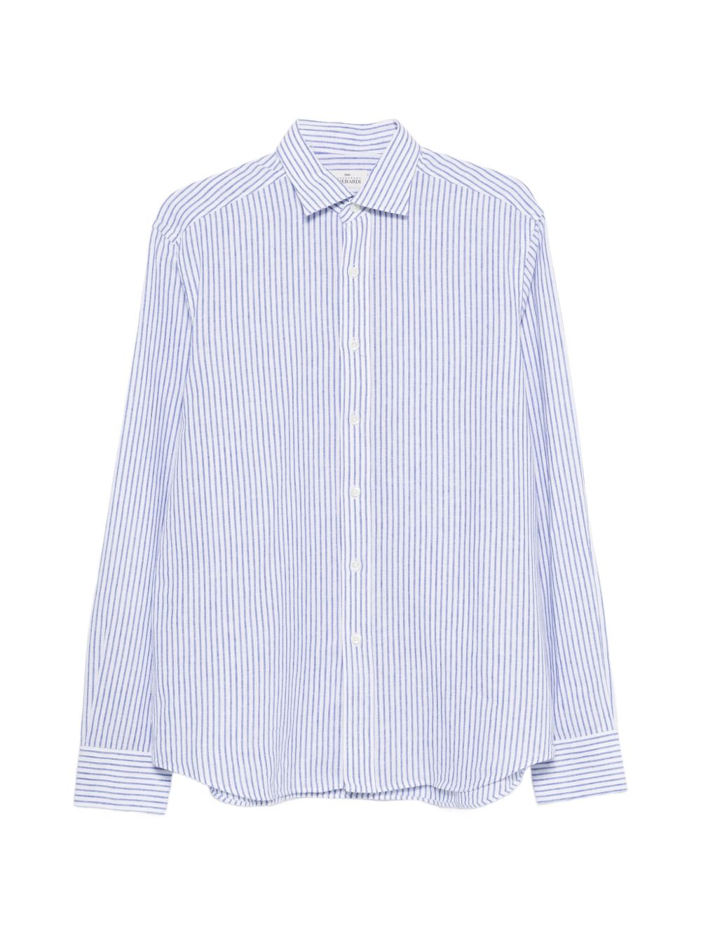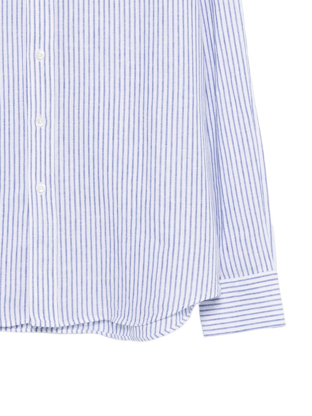 Camicia in lino-cotone bianca a righe azzurra, chiusura con bottoni, collo francese