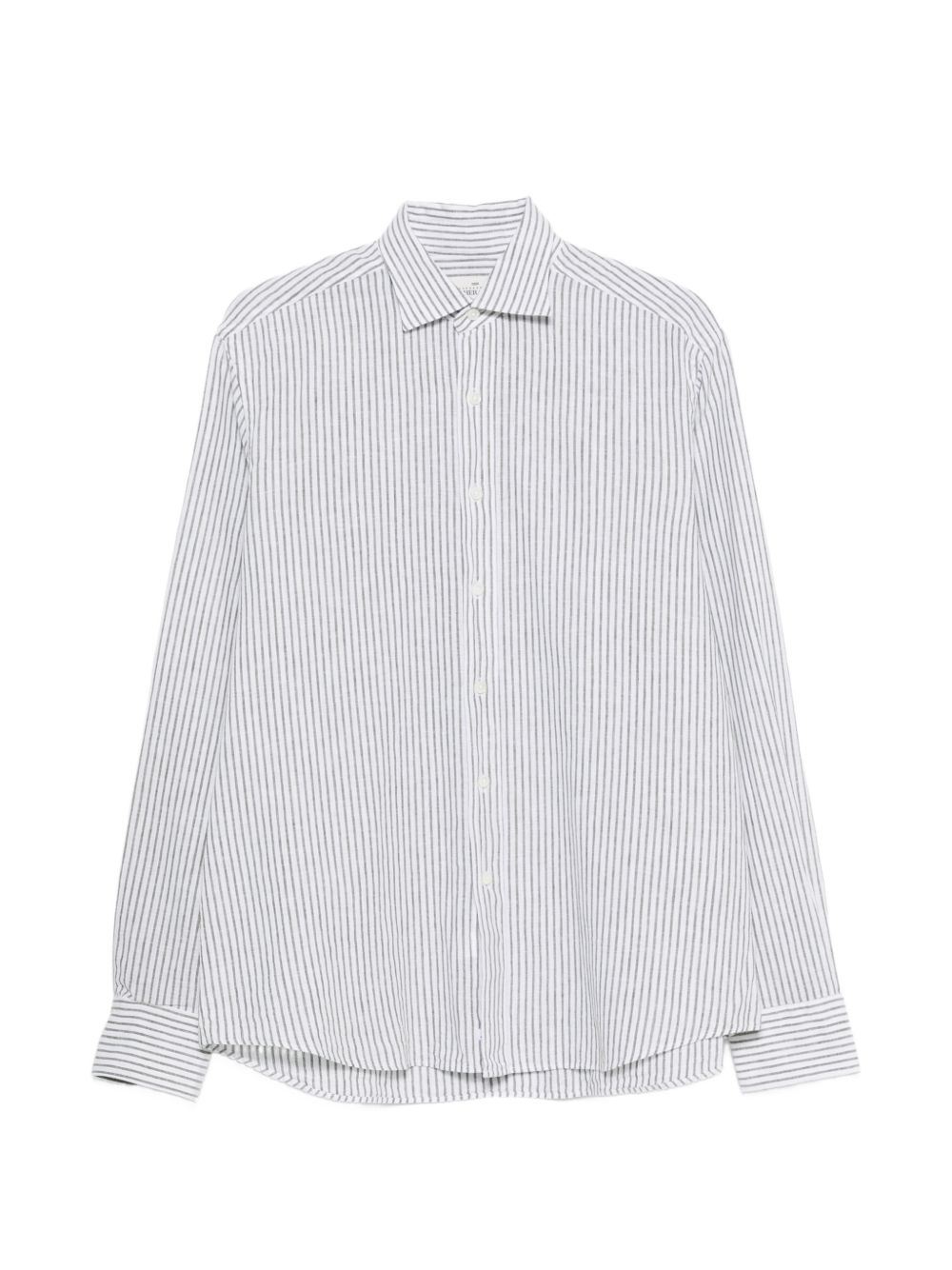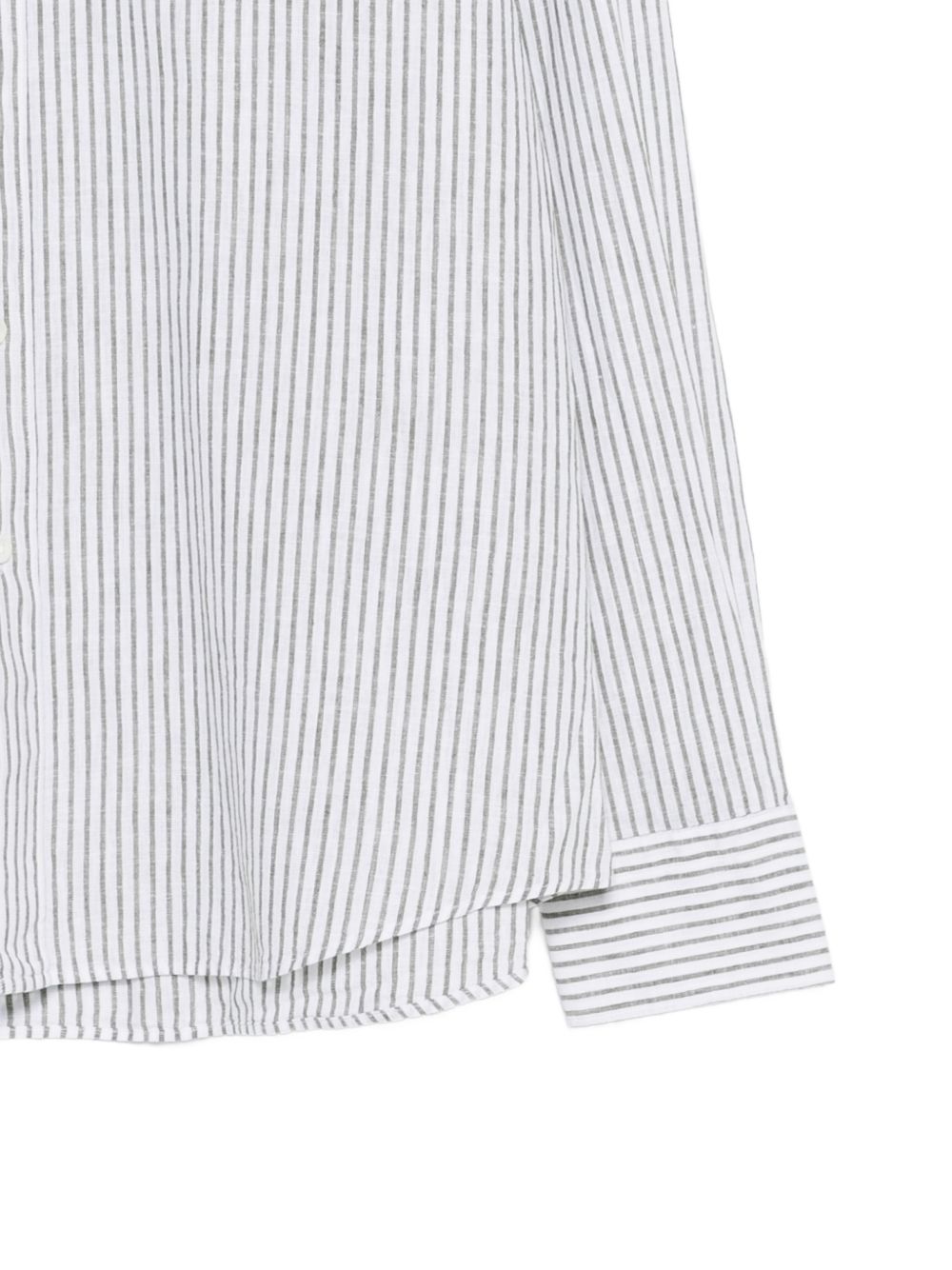 Camicia in lino-cotone bianca a righe verdi, chiusura con bottoni, collo francese