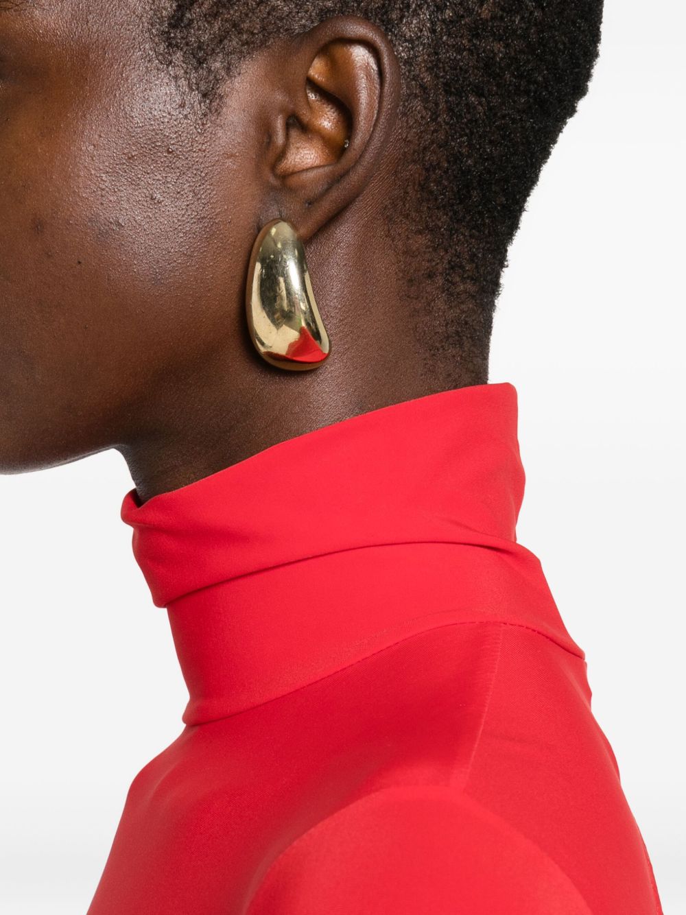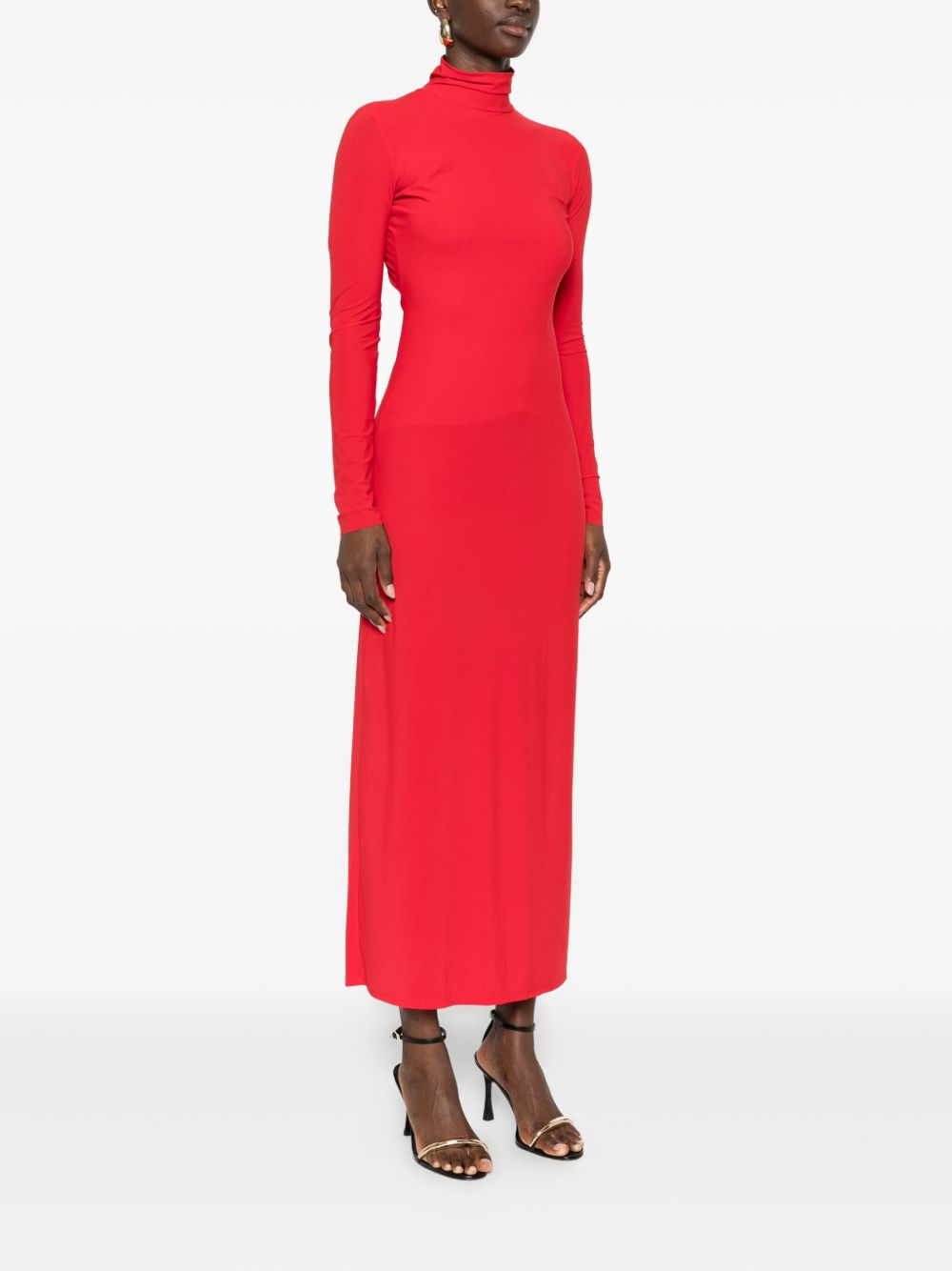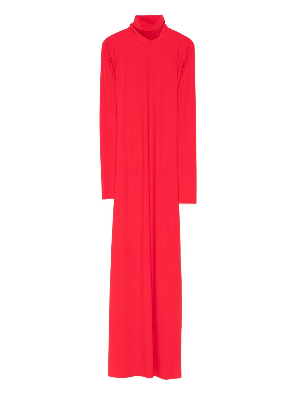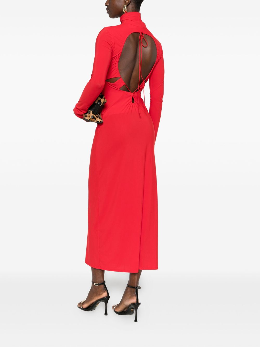 Abito lungo JENNA, realizzato in jersey elasticizzato che avvolge la silhouette con eleganza. Caratterizzato da scollo alto, maniche lunghe con bordi grezzi, audaci dettagli cut-out e lacci regolabili sulla schiena scoperta