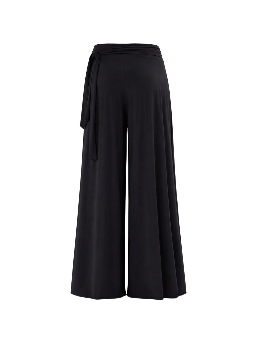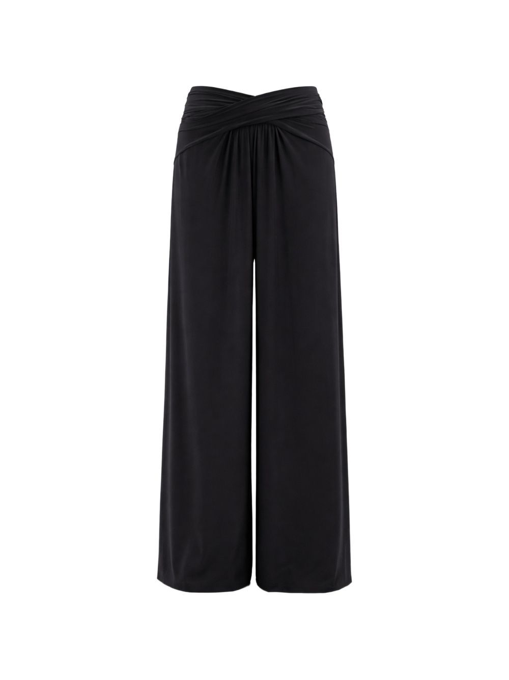 Pantalone modello palazzo in jersey nero, bustino drappeggiato a incrocio in vita