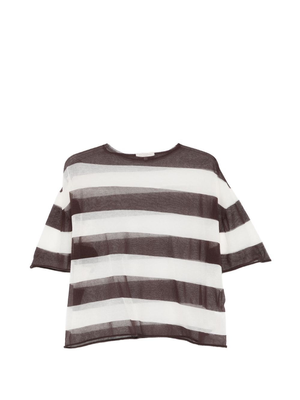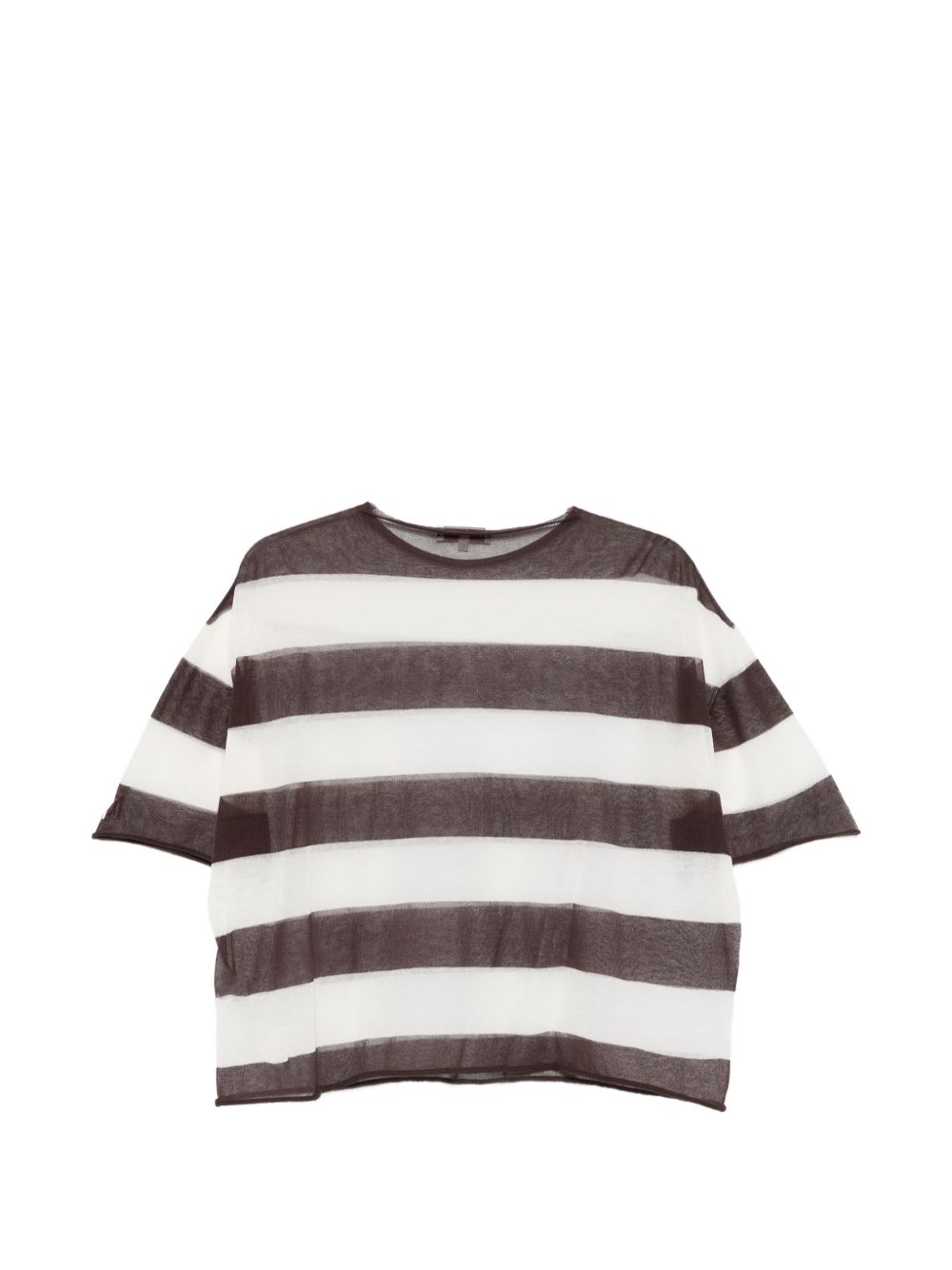 T-shirt filo cotone a righe grandi bianco /marrone, mezze maniche, girocollo