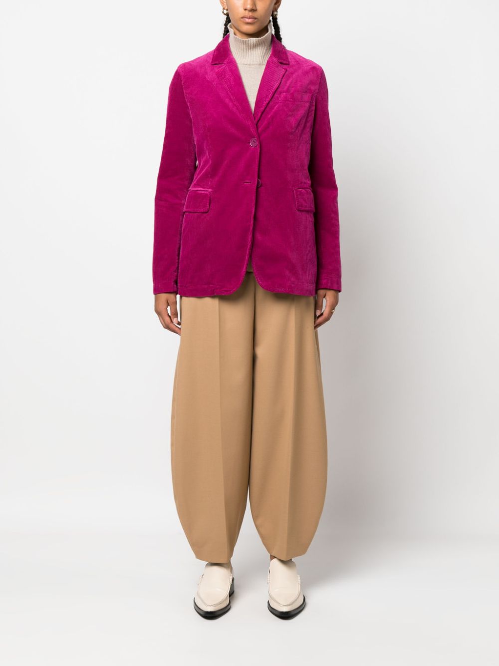 blazer a tre tasche in velluto a coste rosa intenso con chiusura frontale con bottoni, tasca sul petto, due tasche frontali con patta, maniche lunghe, spacco posteriore, orlo curvo e orlo dritto.