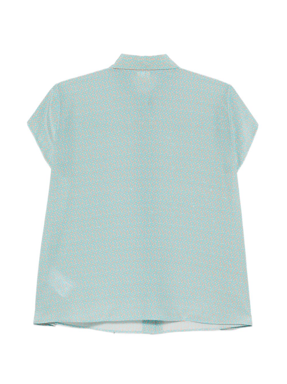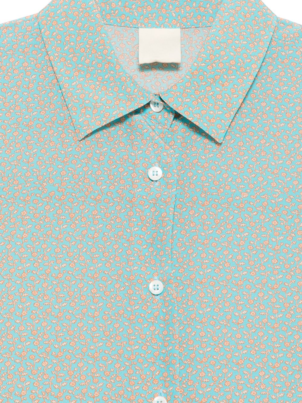 Camicia in seta azzurra, mezze maniche, chiusura con bottoni. collo classico, stampa fiorellini