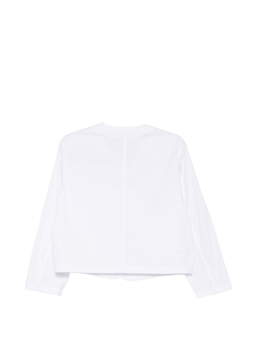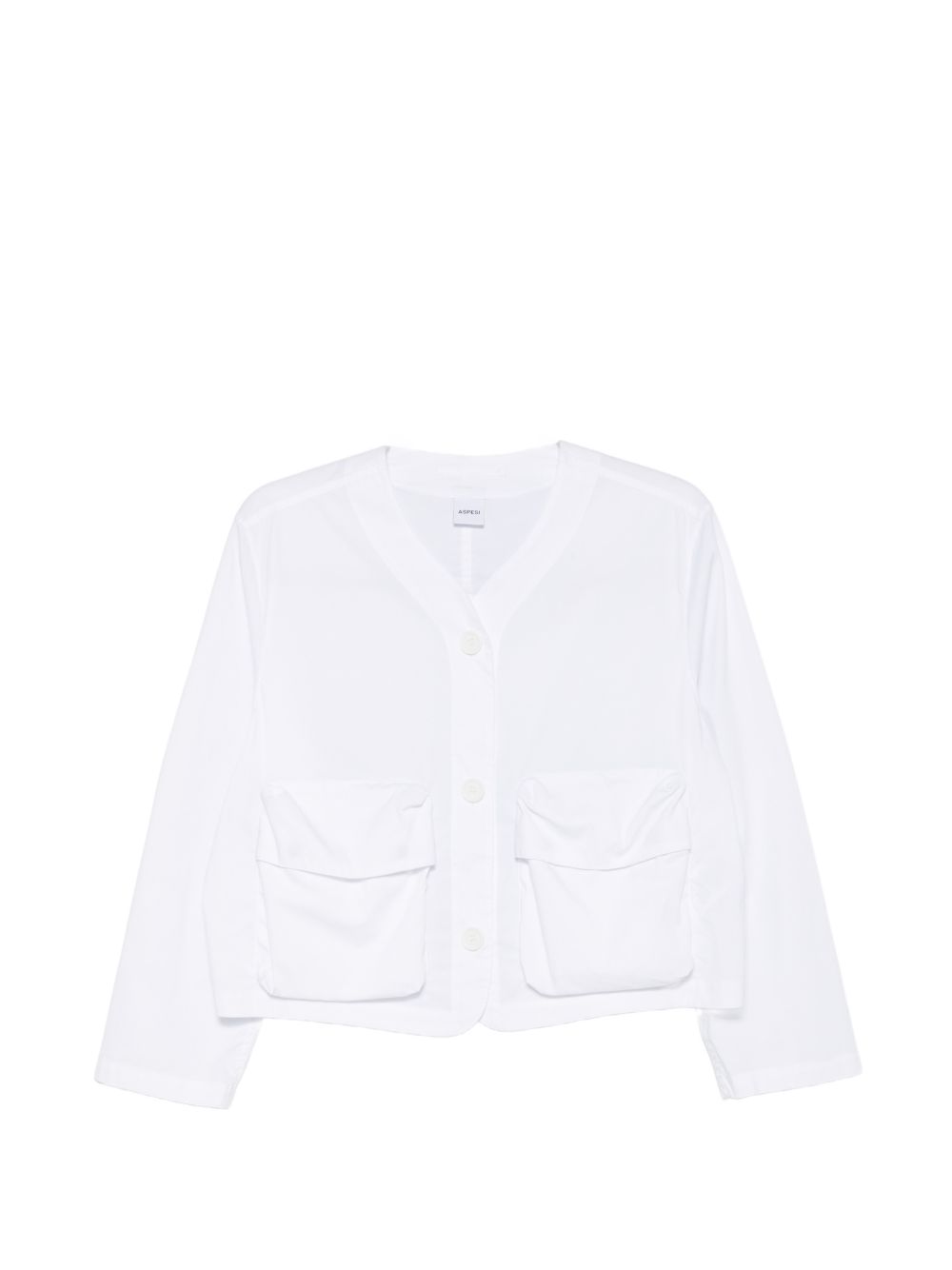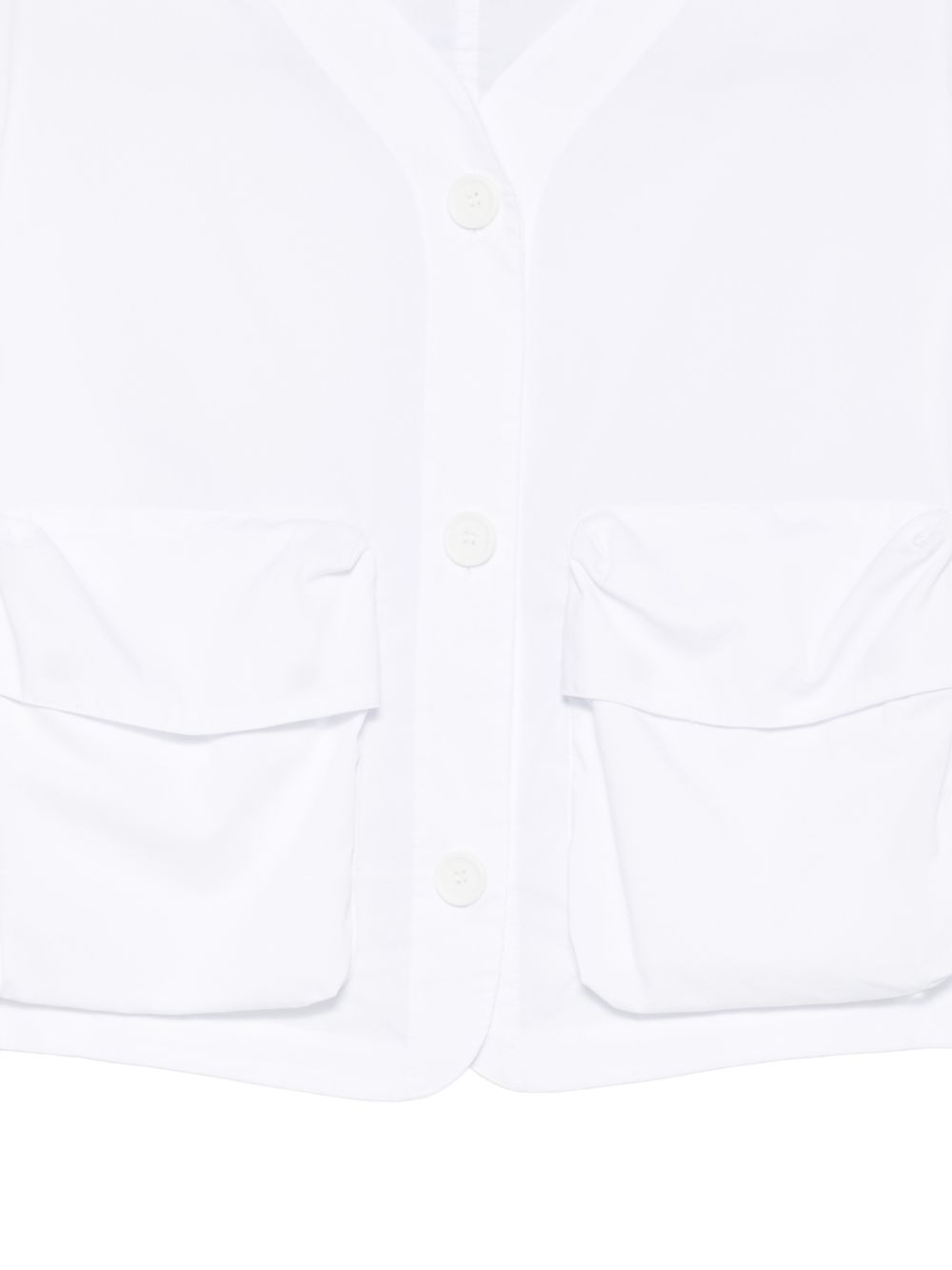 Giacca modello boxi in cotone bianco, scollo a V, tasconi sul petto, chiusura con bottoni