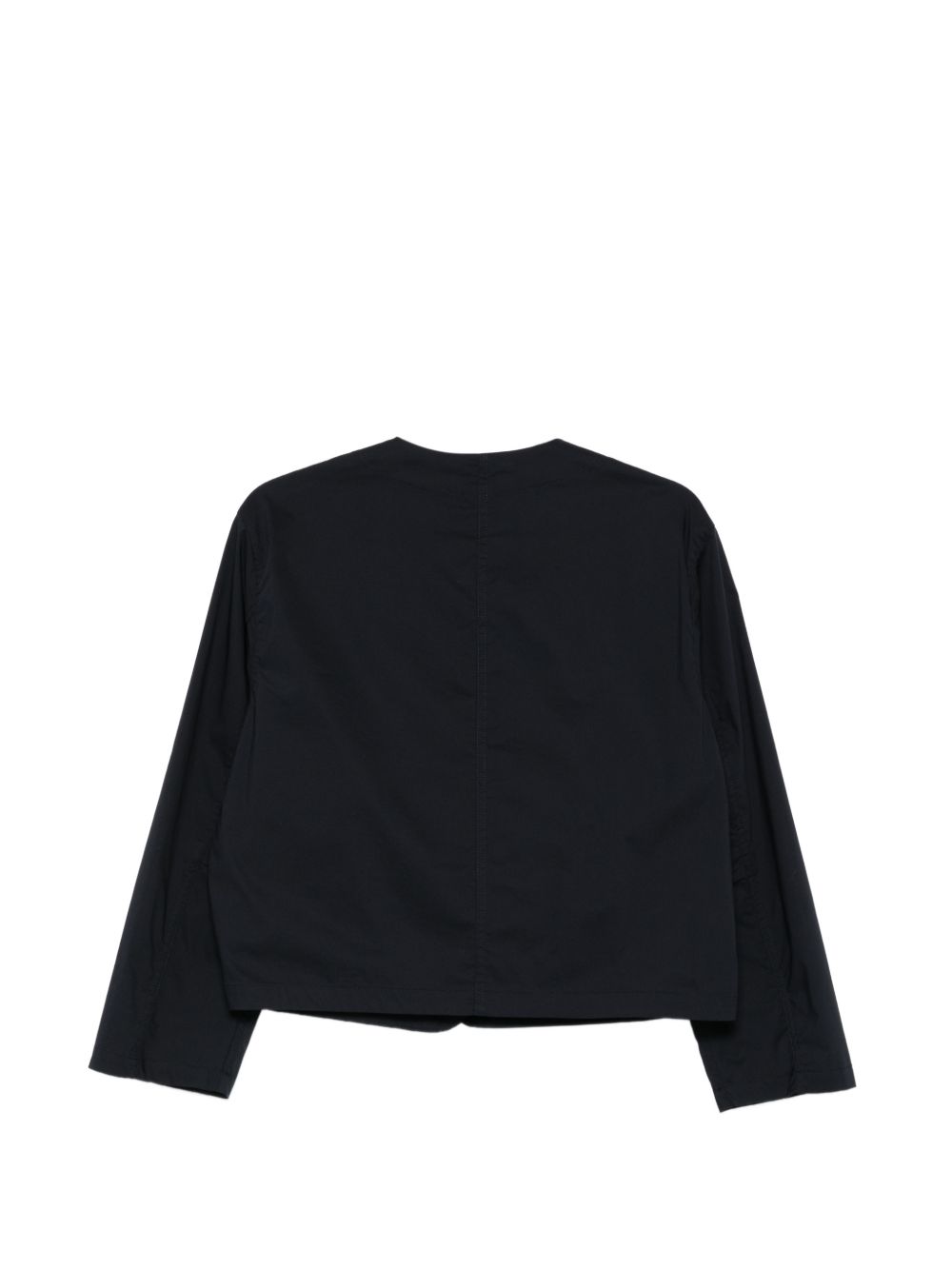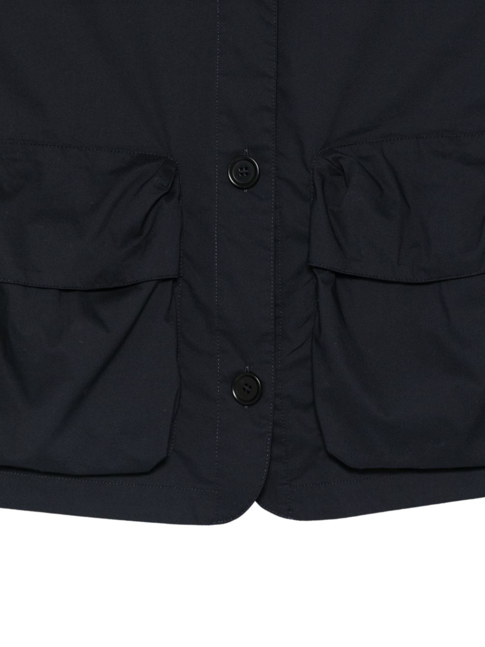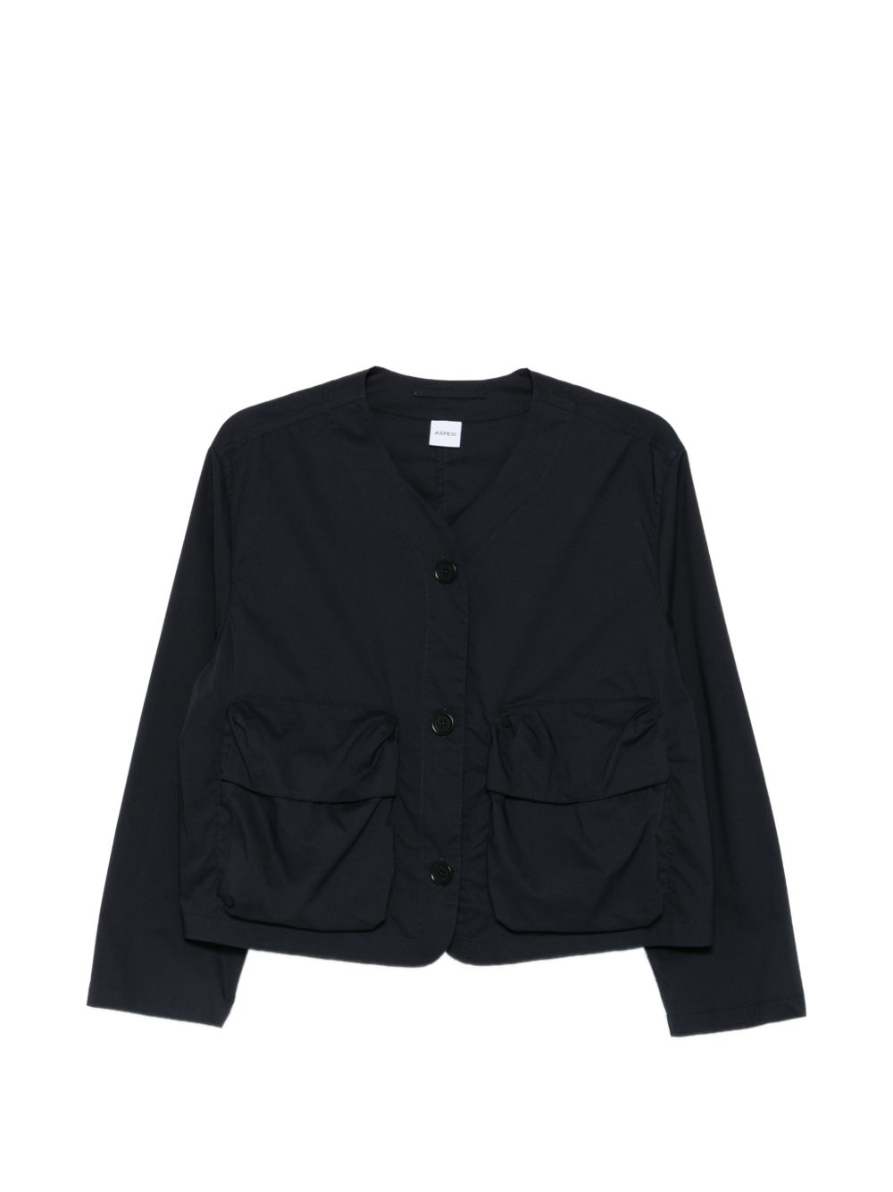 Giacca modello boxi in cotone blu, scollo a V, tasconi sul petto, chiusura con bottoni