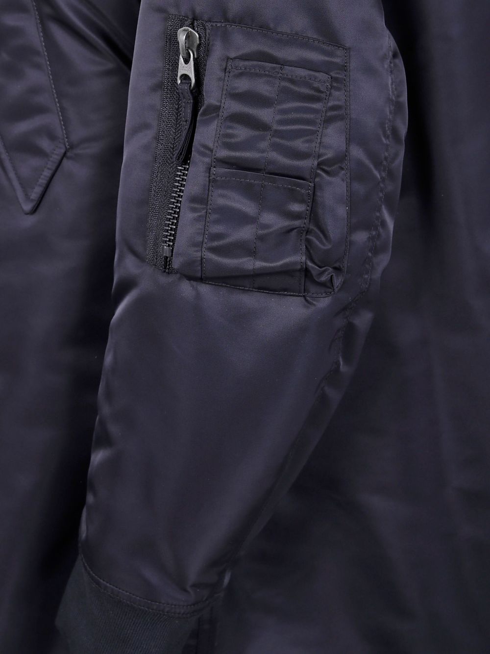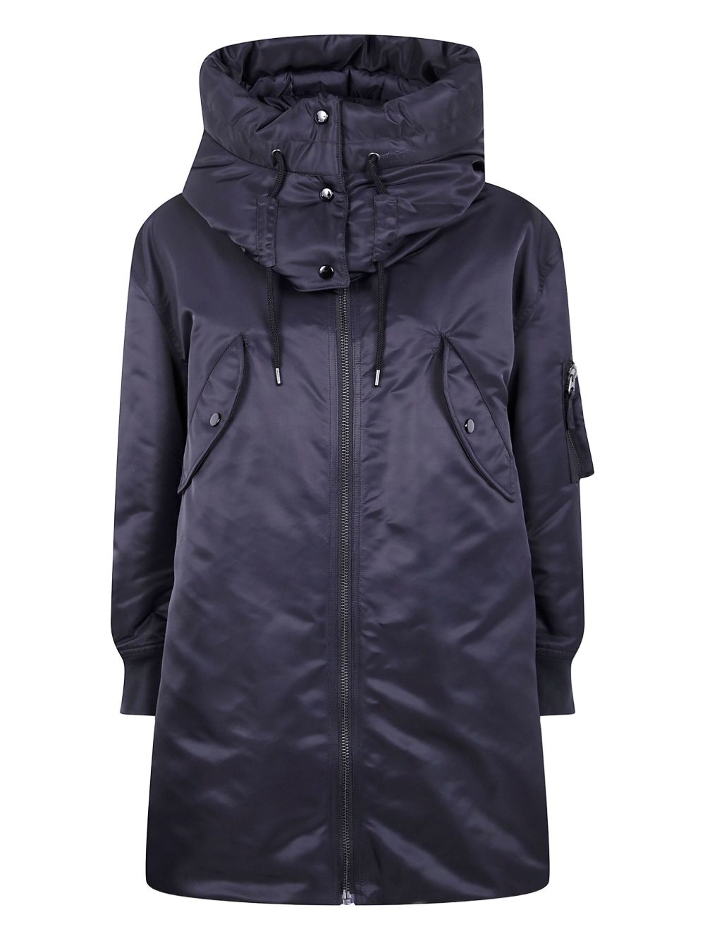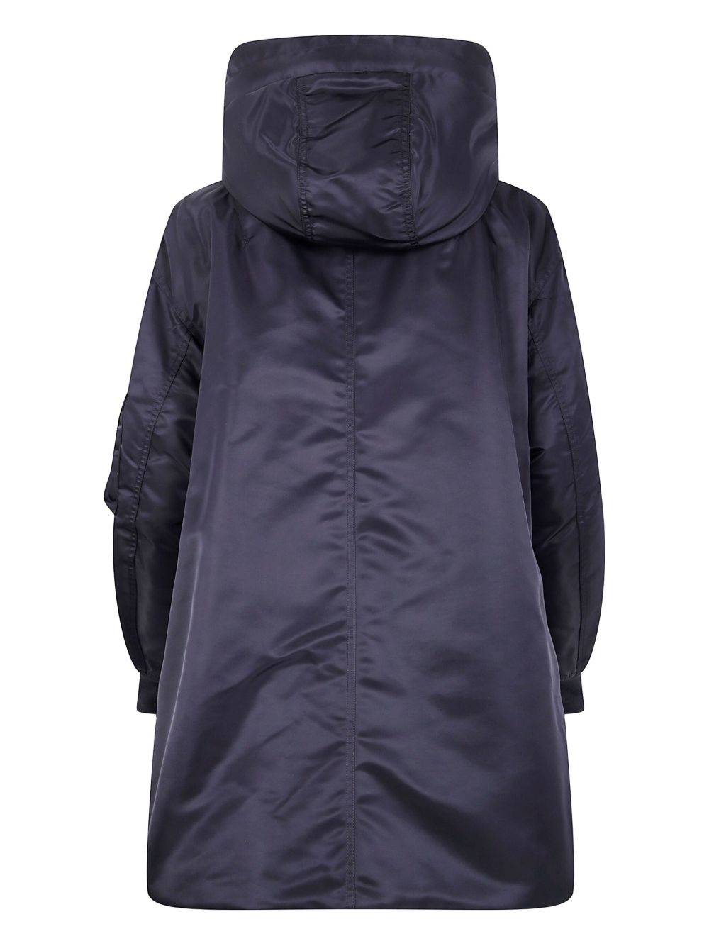 Giaccone piumino in gabardine nylon blu scuro, coulisse sotto, chiusura con zip, collo montante con cappuccio