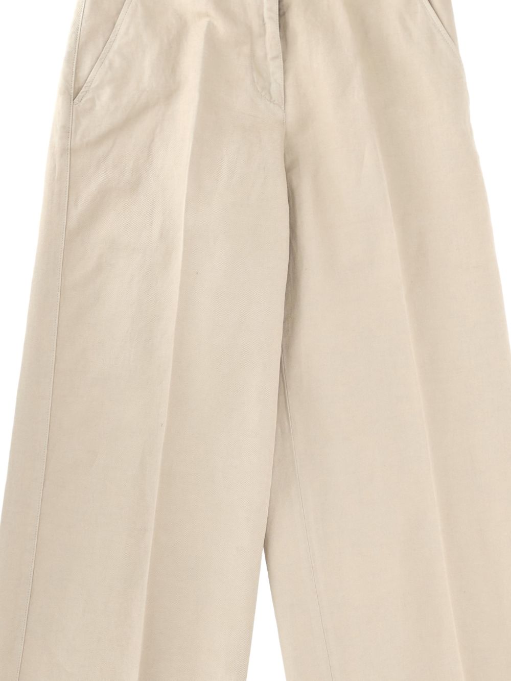 Pantalone in cotone gabardine sabbia, chiusura con zip e bottone, gamba larga