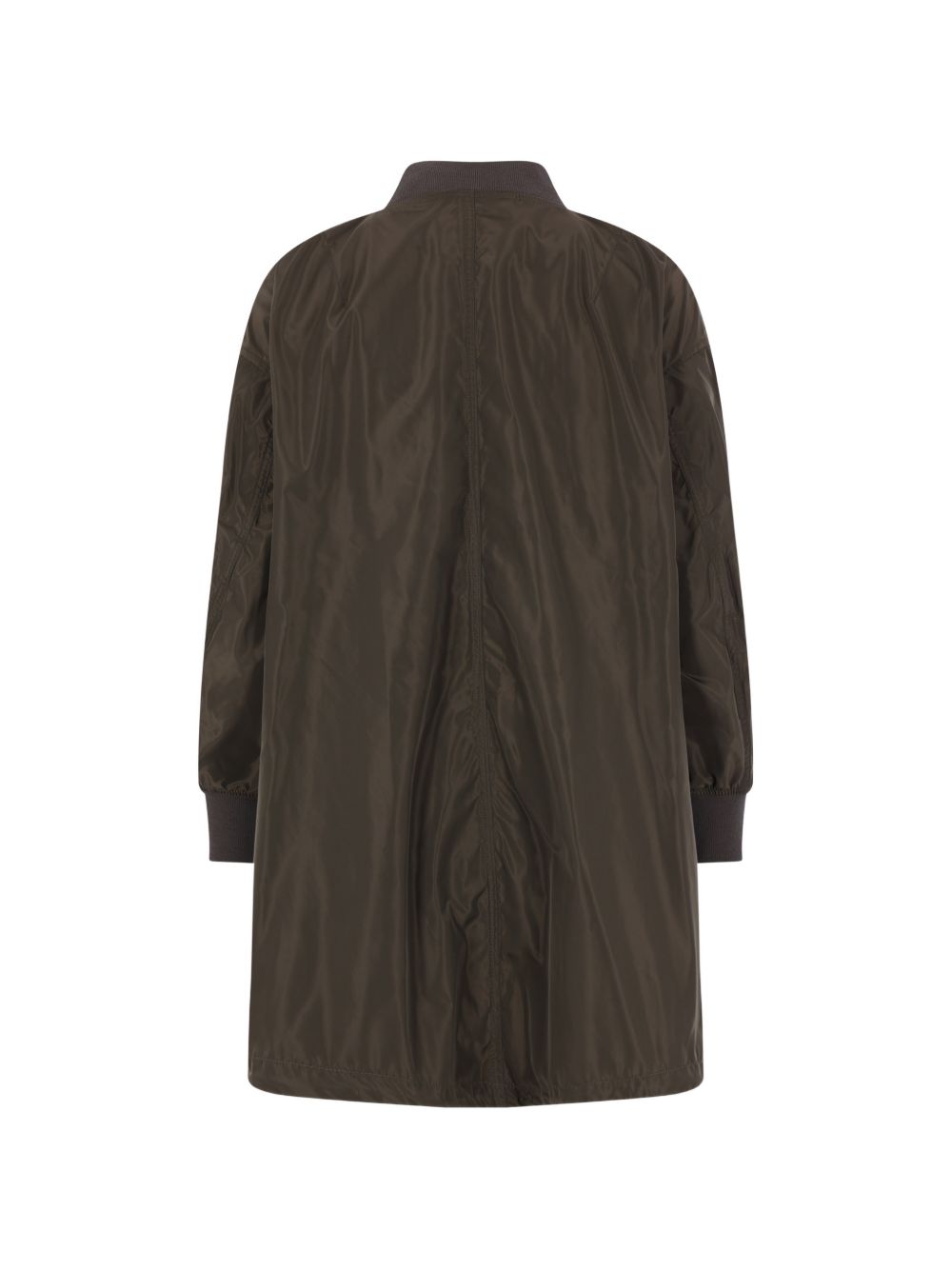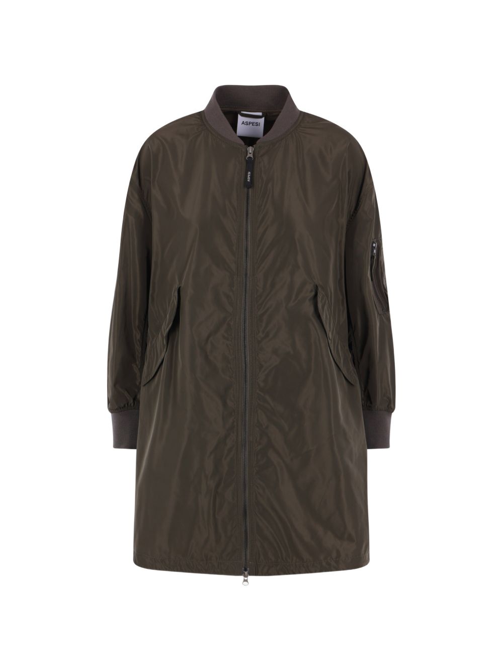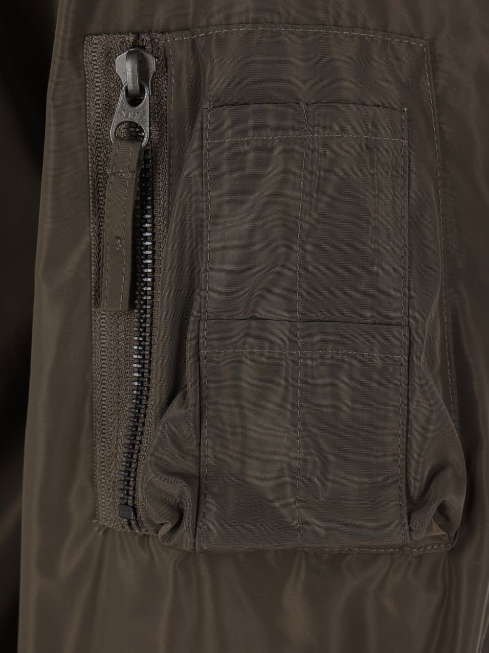Trench nylon verde militare, colo bomber, chiusura con zip, tasca sulla manica