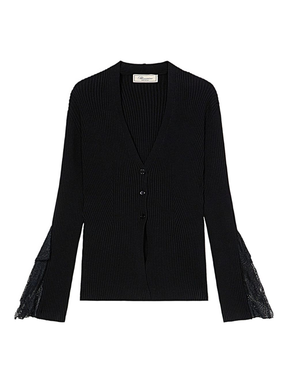 Cardigan nero a costine, dettaglio volant pizzo, chiusura con bottoni, scollo a V