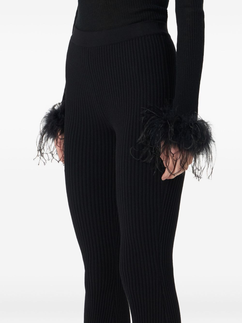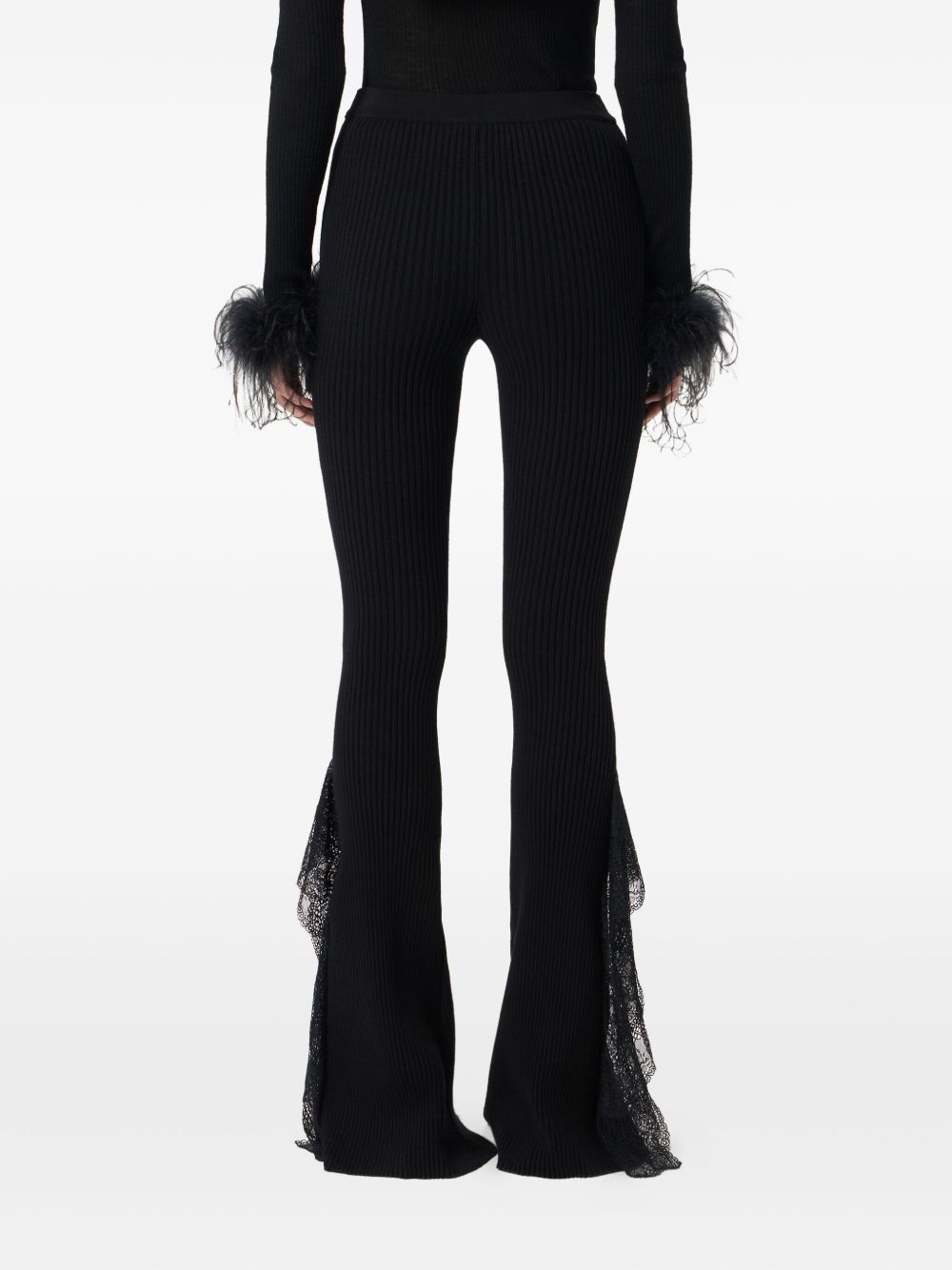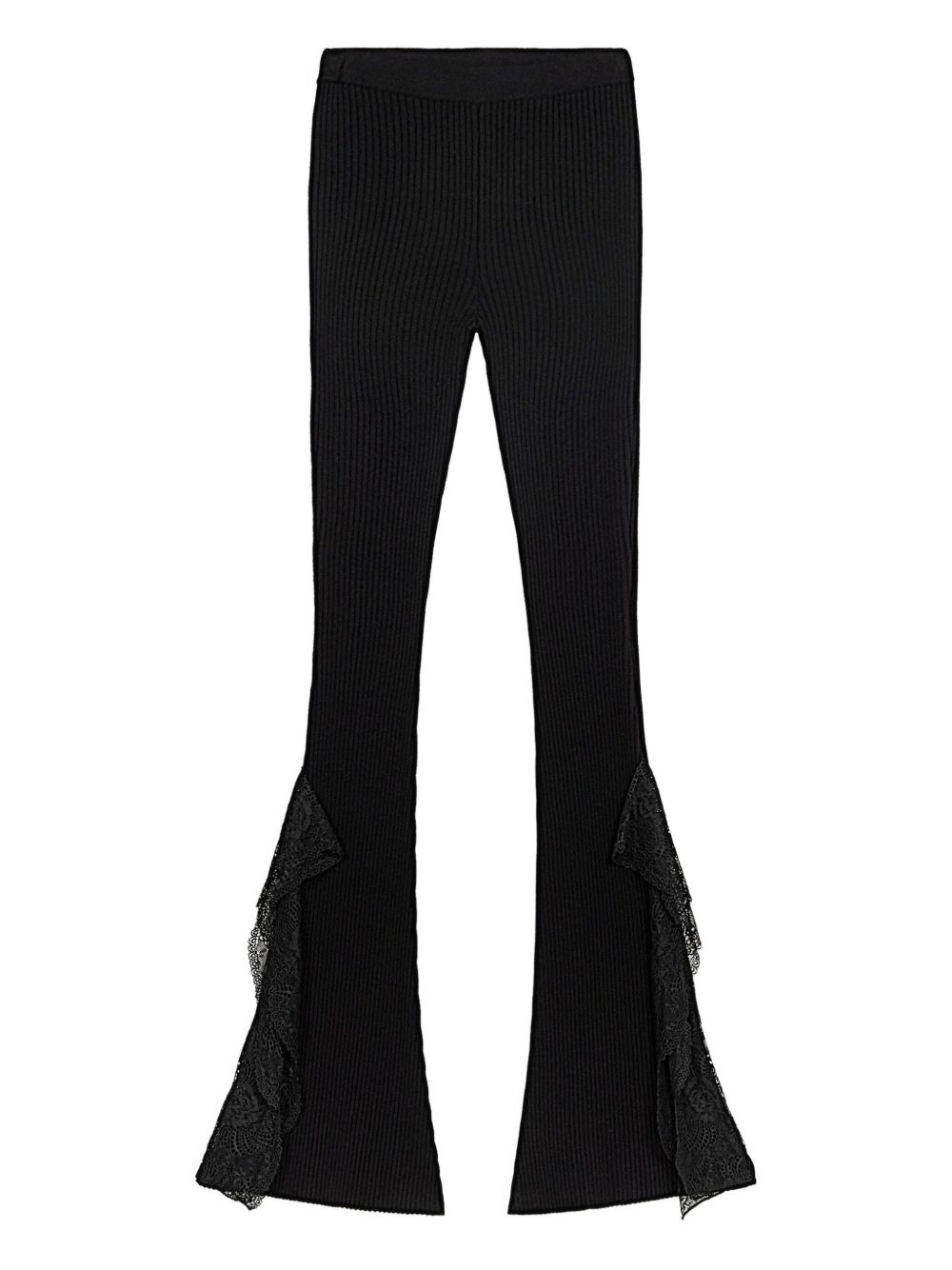 Pantalone nero a costine, dettaglio volant pizzo, fondo svasato