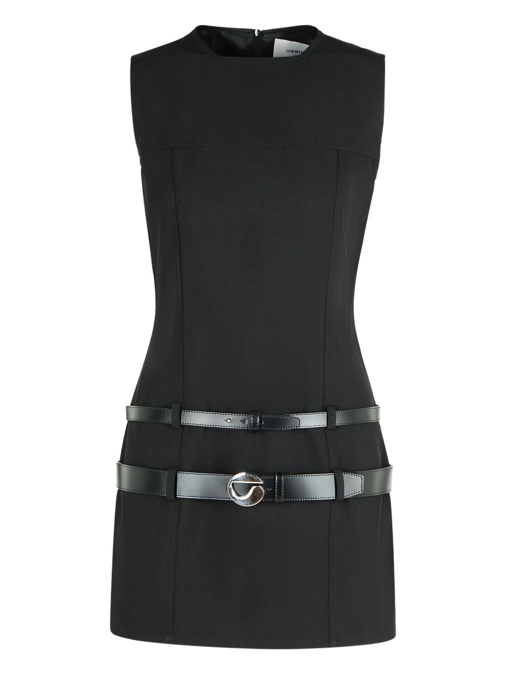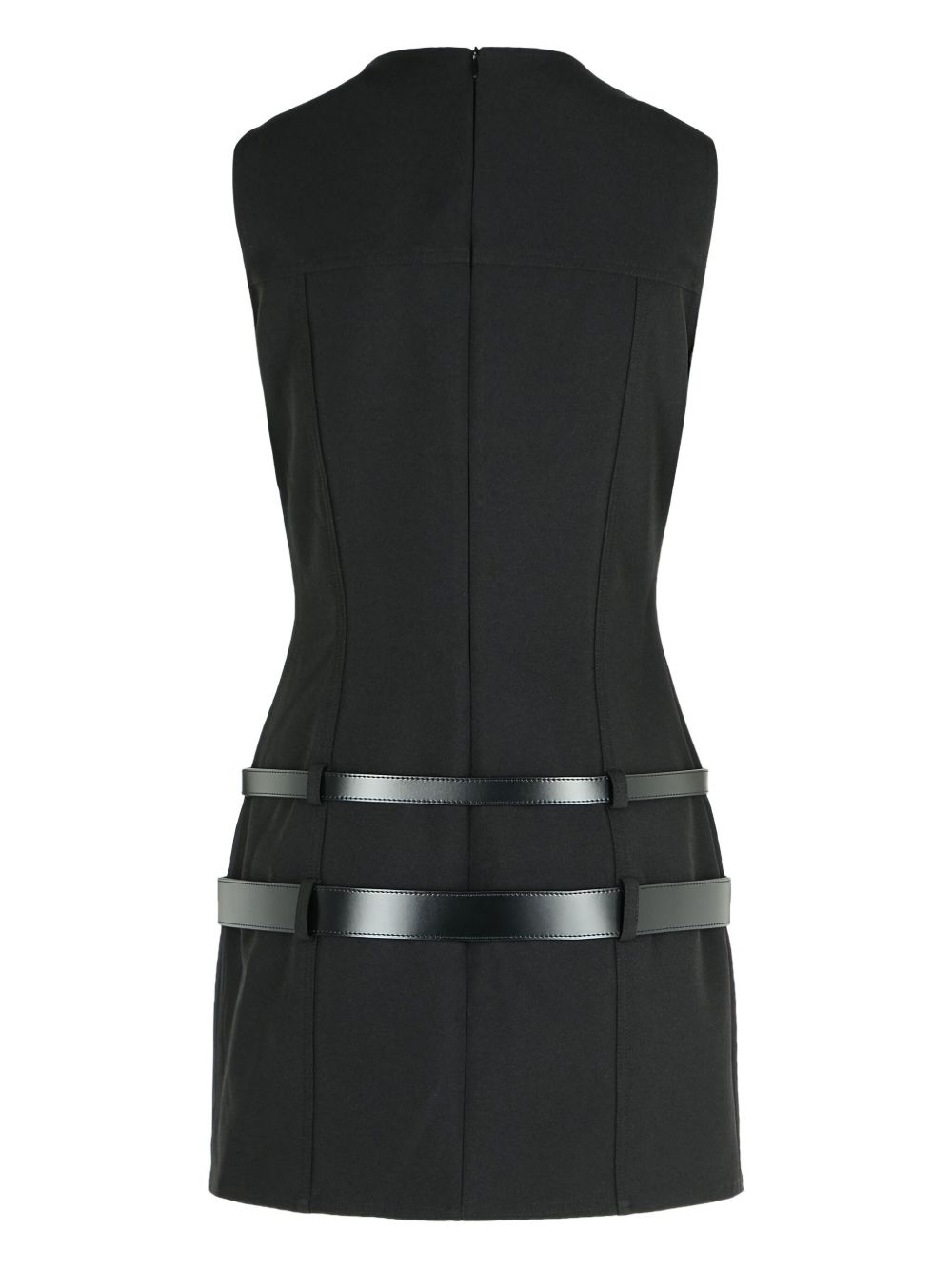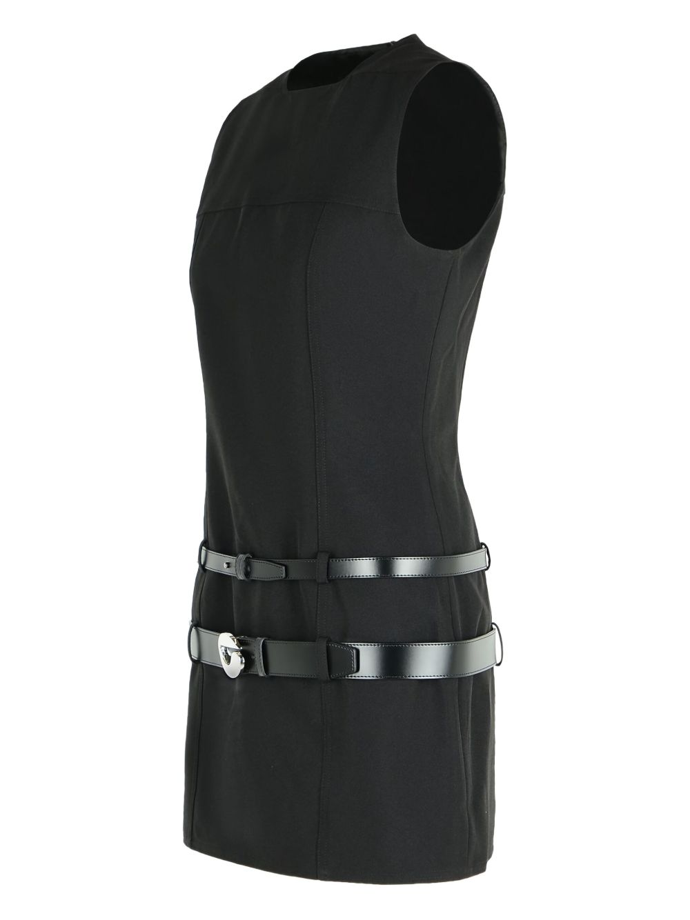 Miniabito nero in gabardine, dettaglio cinture in vita, smanicato