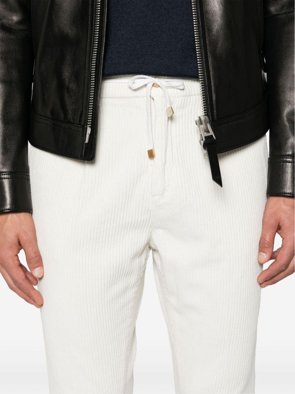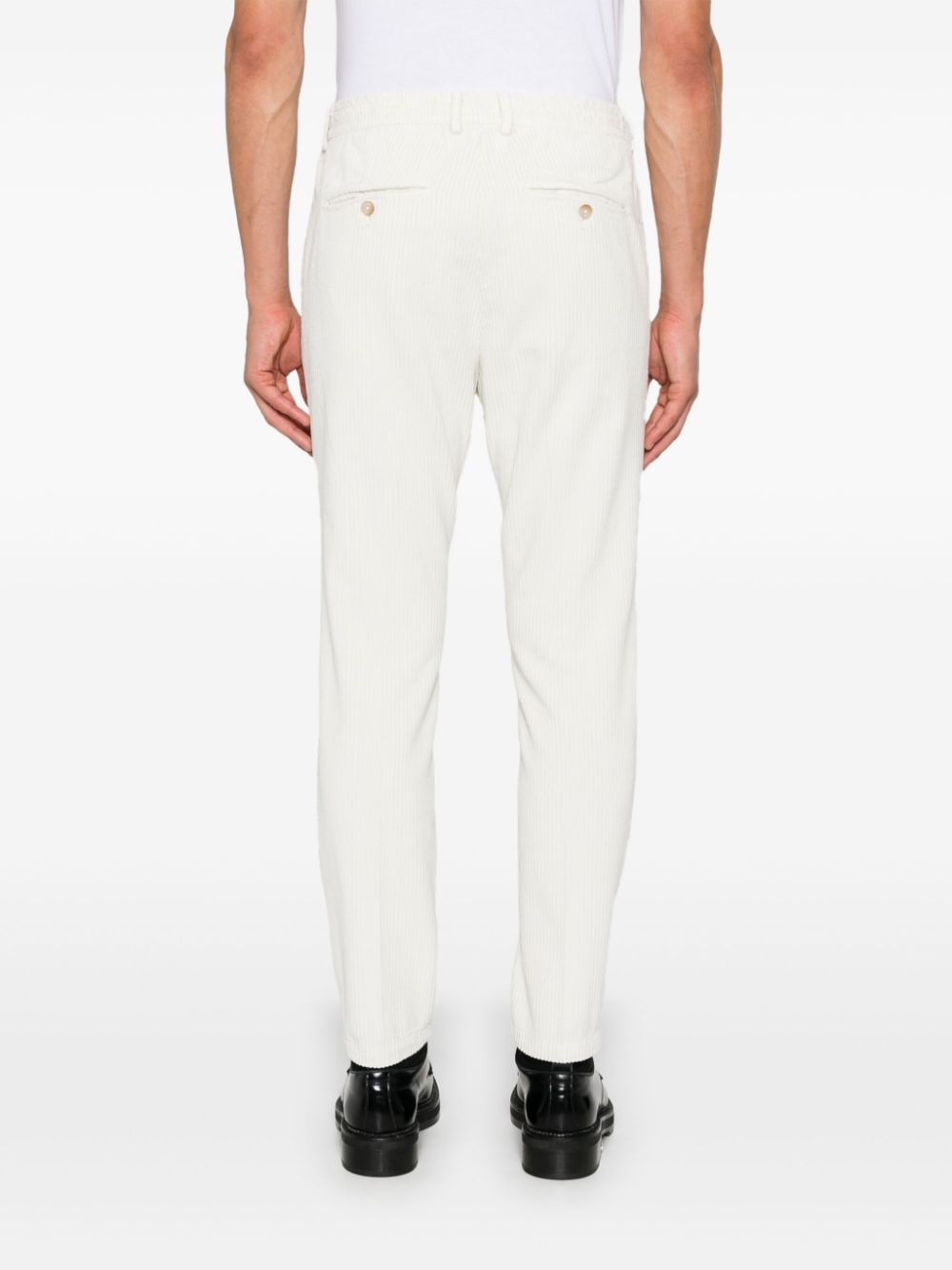 Pantalone bianco in velluto a coste, chiusura frontale con bottone e zip, vita media, coulisse con passanti per cintura, tasche a filetto sui lati, due tasche posteriori a filetto con chiusura a bottone, gamba affusolata